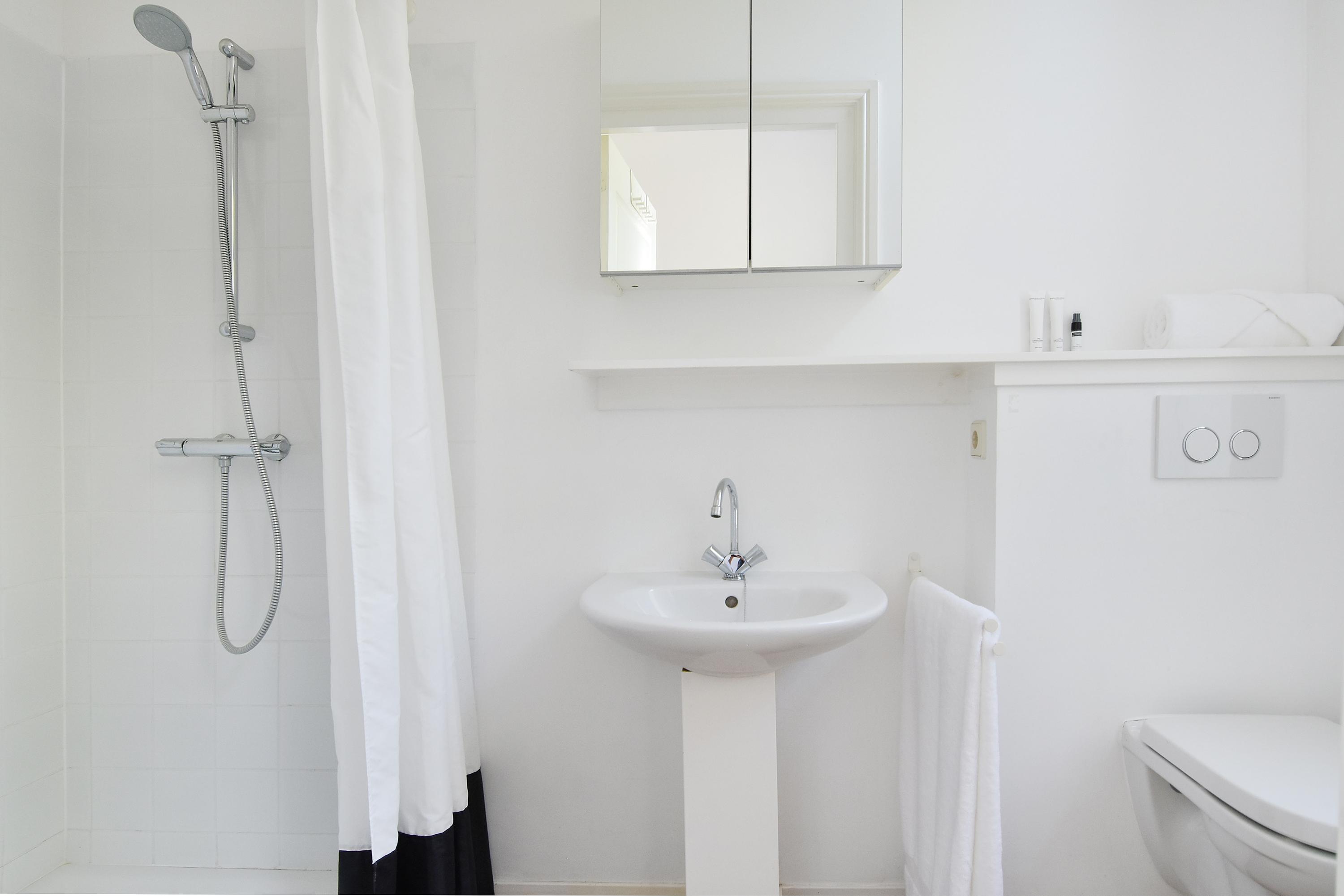 The top floor, with its bright landing and side windows, offers sweeping views of Delft’s towers. This level includes a bathroom with shower, sink, and fourth toilet, plus a rear-facing bedroom. At the front, you’ll find the generous master bedroom with ample wardrobe space. In the center is a large storage/laundry room with abundant storage, central heating boiler, washing machine, and dryer connections, with access to the roof via loft ladder. At the rear, there are two further spacious bedrooms, one of which features its own en suite bathroom with shower, sink, and fifth toilet.