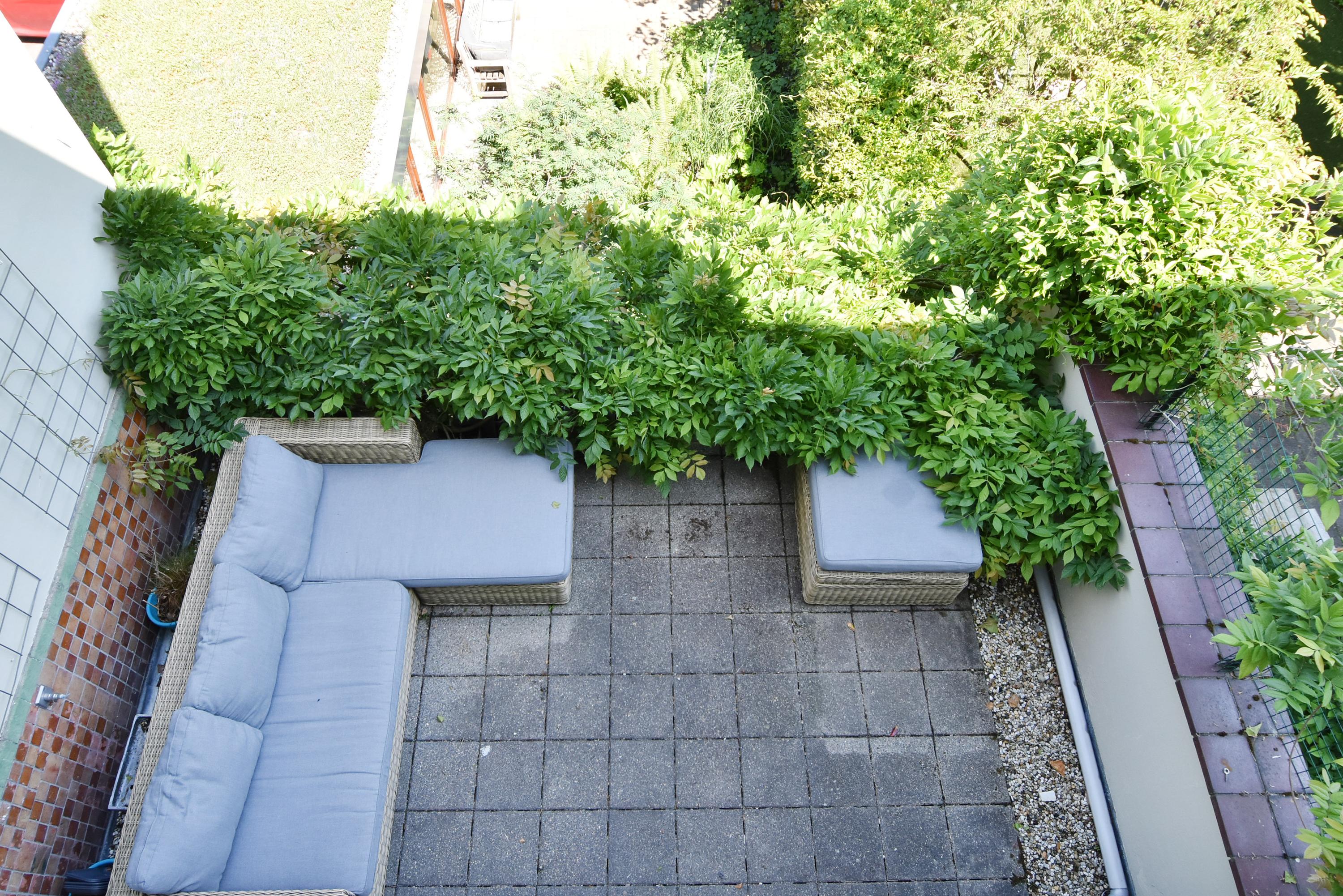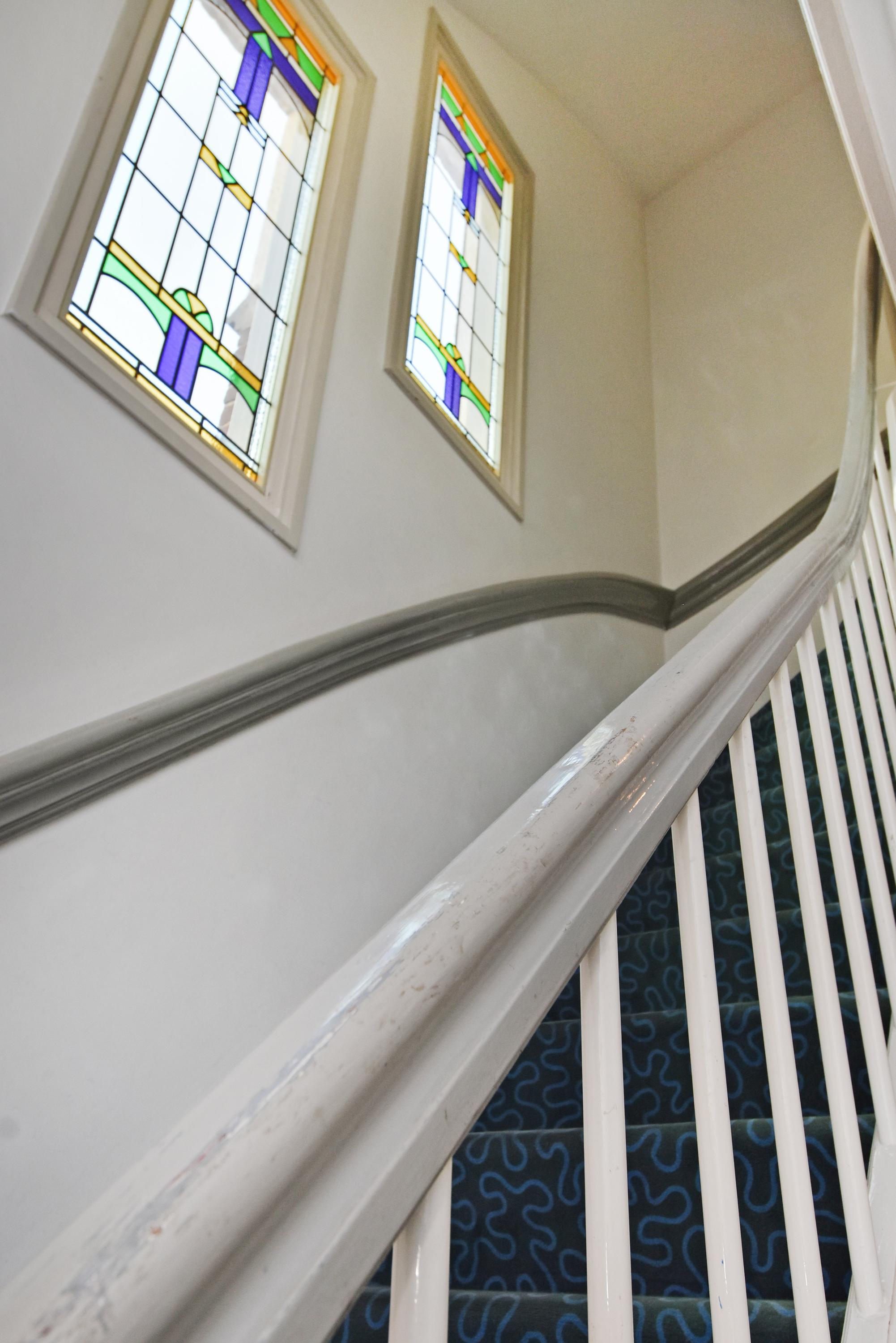 A bright staircase with stained-glass windows leads to the first floor. Here you find a particularly light and comfortable landing with access to a modern third toilet. The rear bedroom is spacious and comes with a private bathroom including shower and sink. Another striking feature is the large, combined living/dining room – a stylish and atmospheric space offering exceptional comfort, with direct access to a study at the front. This versatile room includes a kitchenette and, at the rear, opens onto a sunny and spacious balcony with beautiful green views.
