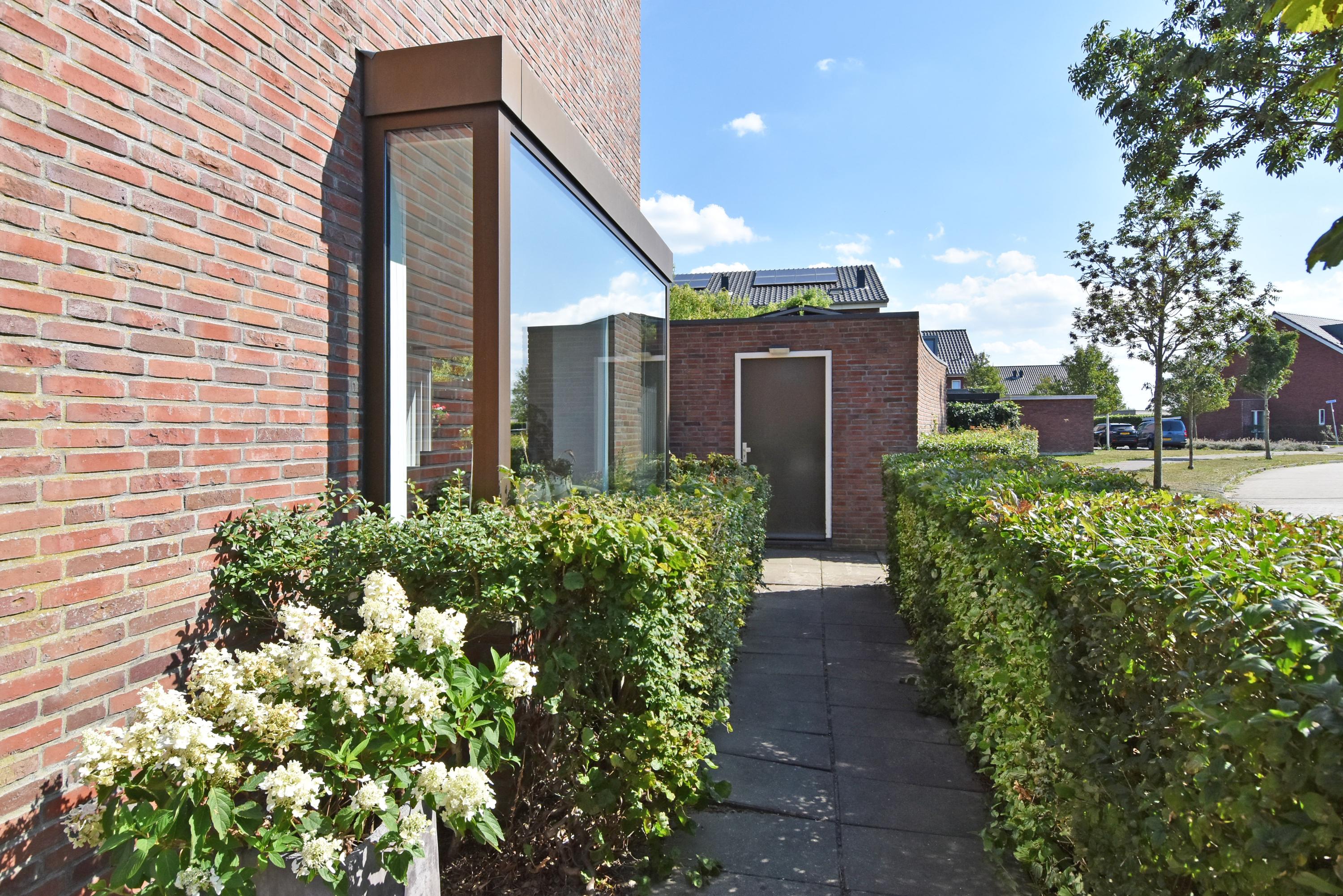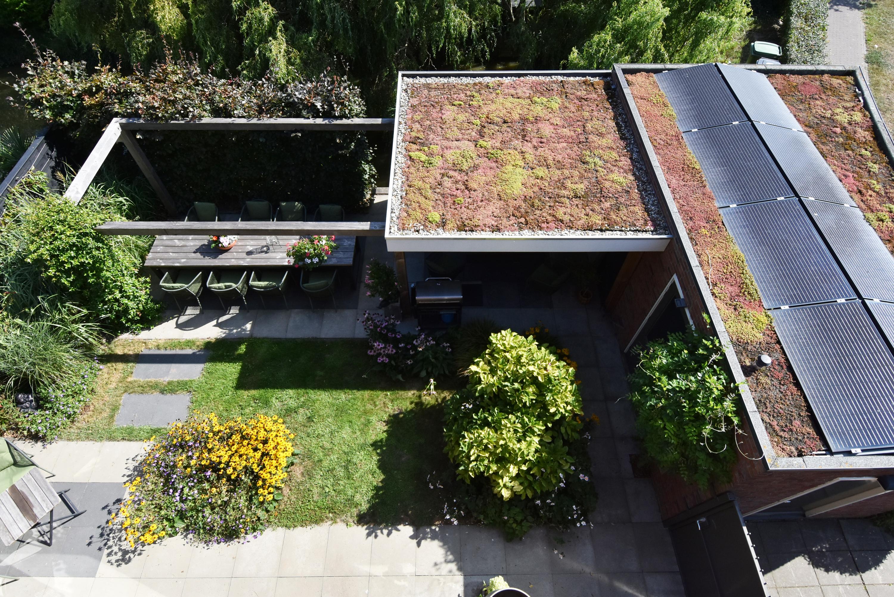 The spacious hall leads into the attractive, light-filled living room. The large sliding doors create a beautiful connection with the sunny garden. The garden has been recently landscaped and features lots of greenery, a lawn, a sunny terrace, a veranda and a canopy: a wonderful place to enjoy and relax all year round. The garden borders the water.