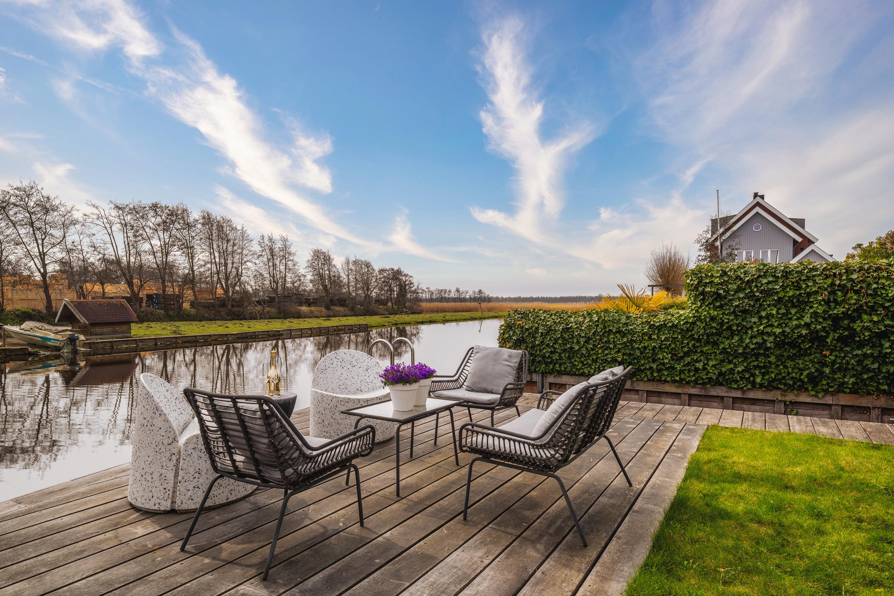 The garden is beautifully landscaped and thoughtfully designed. Located on the water with a private mooring for a sloop and a swimming ladder to enjoy the open water directly. Whether you are lying in the hammock or sitting on the terrace by the water, the view of the water and Het Twiske never gets boring. The garden has drip irrigation for optimal watering and atmospheric lighting with 12V spots. Under the canopy with louvered tilting roof and glass sliding doors (with integrated drainage function), you can enjoy it all year round.