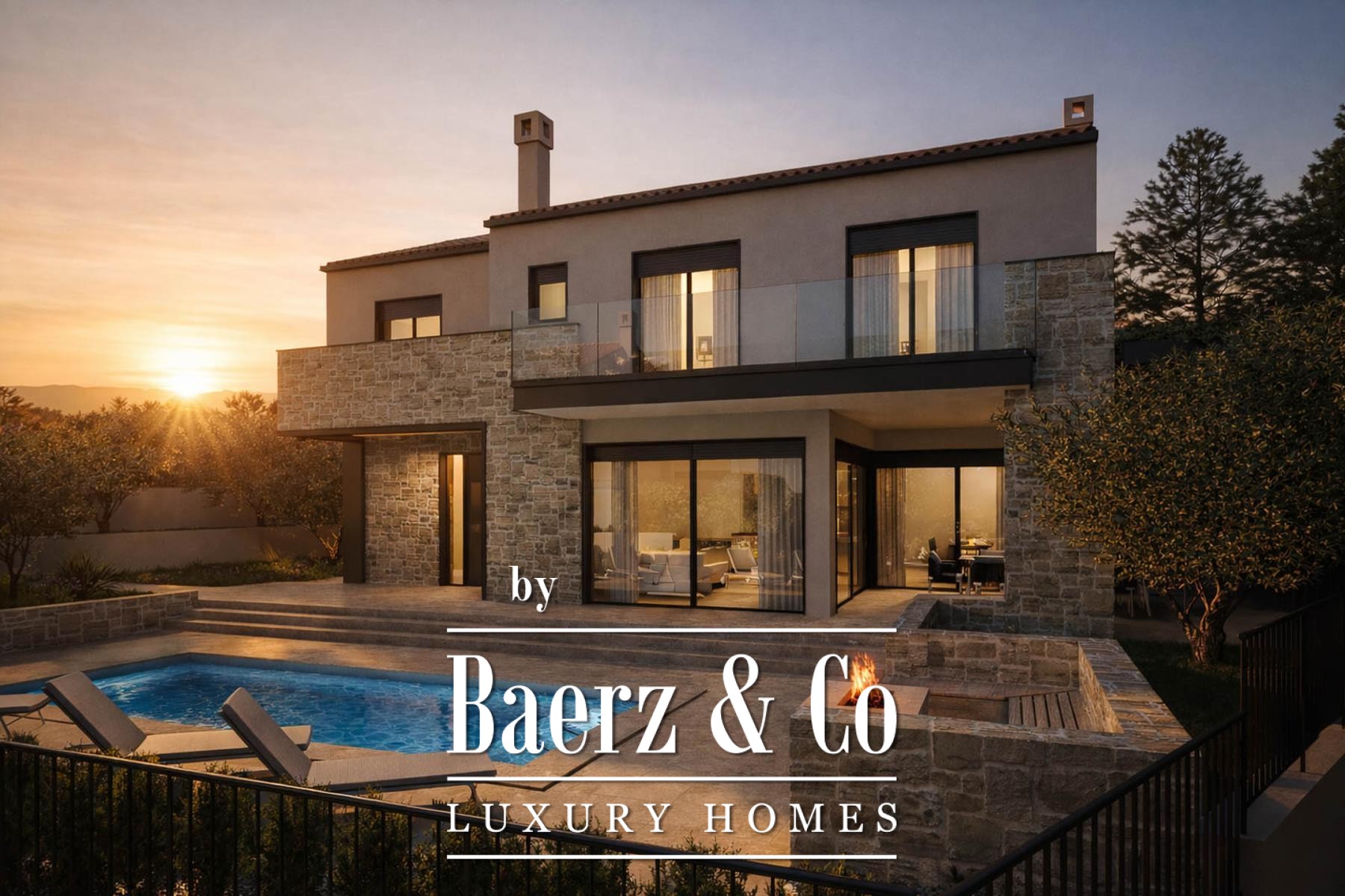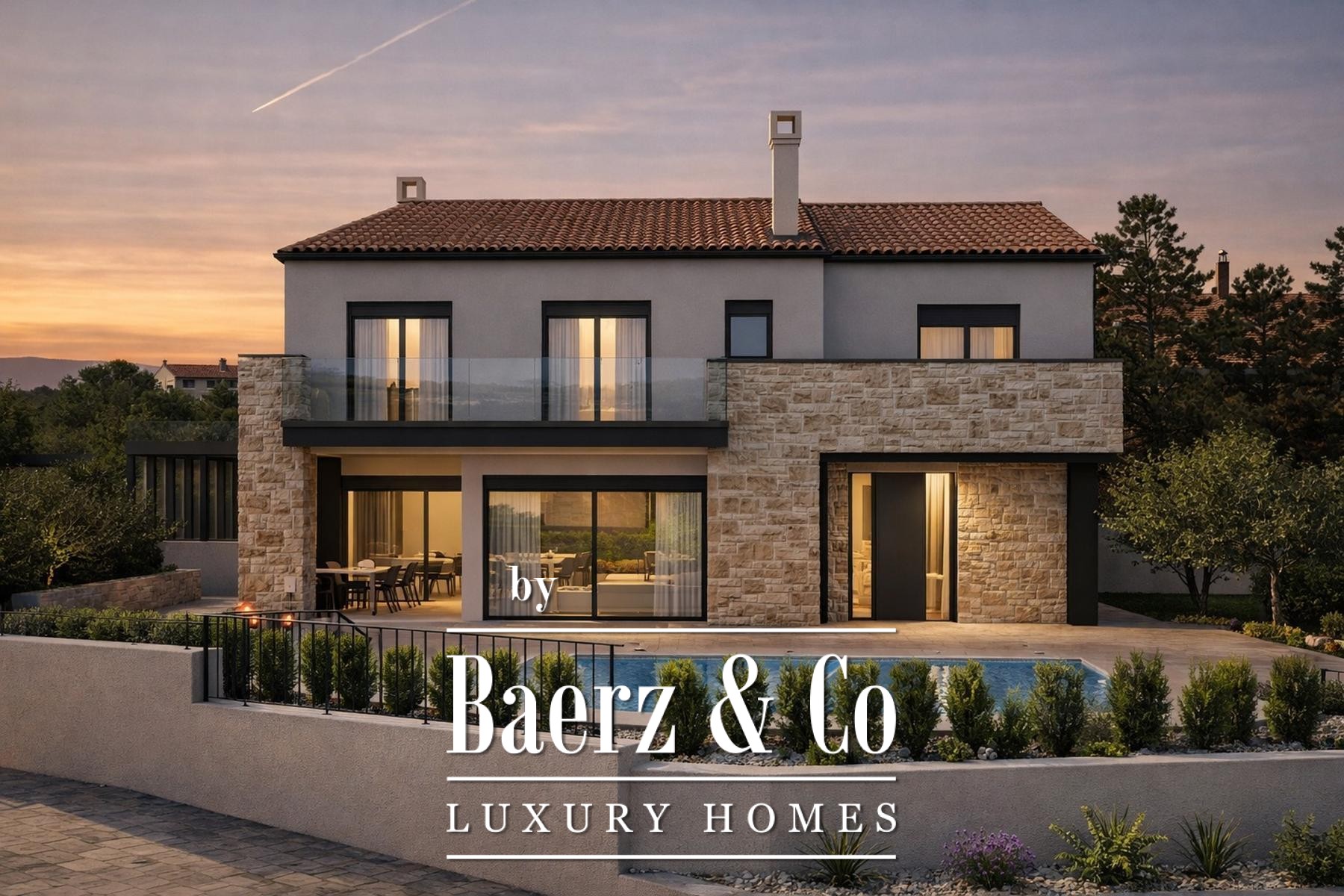 Luxury villa Island of Krk first row to the sea is set in a discreet, tranquil part of Šilo in Dobrinj, Croatia, only 150 meters from the shoreline. This contemporary villa, designed to five-star standards, offers 232 m² of living space on an 819 m² plot and grants open sea views from its privileged position.