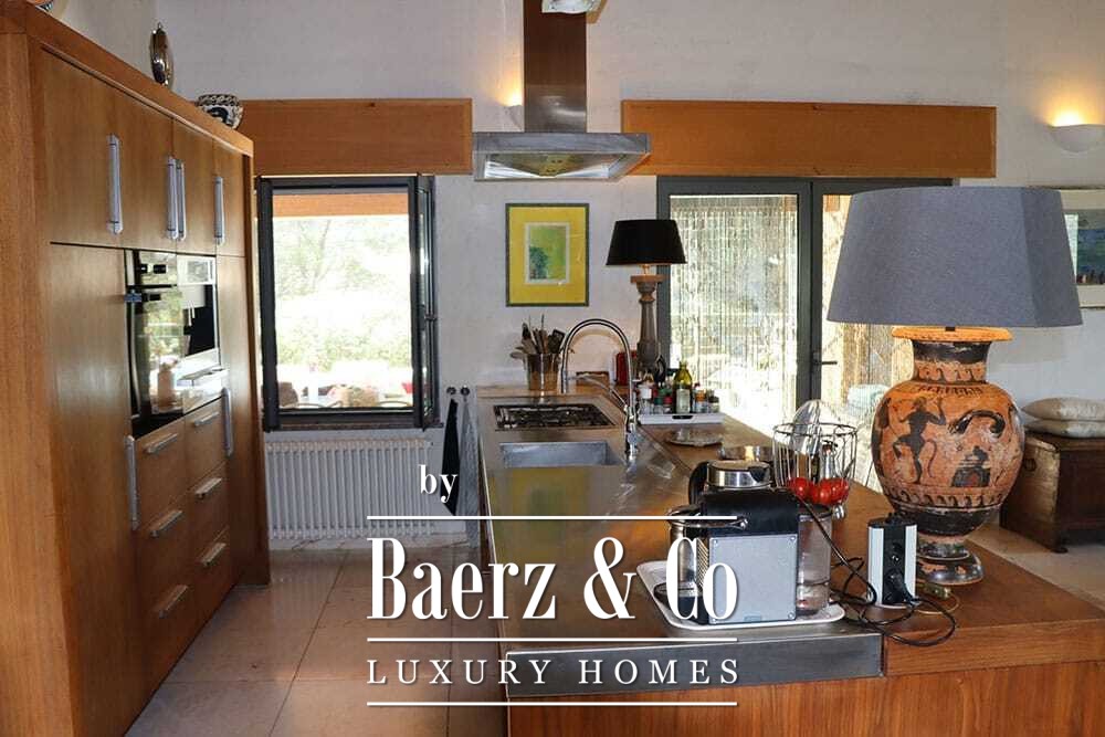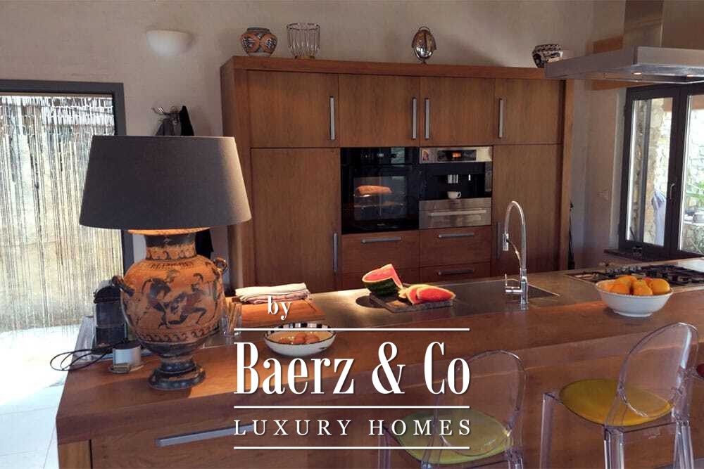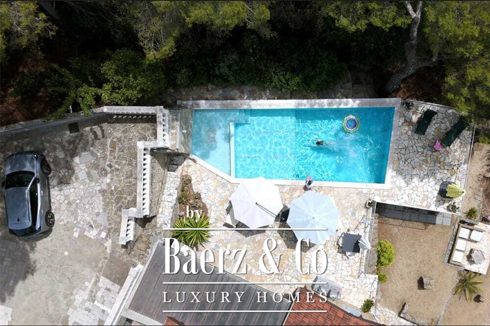 The 11 by 4 metre swimming pool, fully renovated in 2022, lies next to an expansive terrace, offering views over the valley and out to the sea. Multiple terraces, outdoor kitchens, and shaded pergolas invite relaxed dining through all seasons. Paths around the house are lined with olive groves, with hours of sun ensuring exceptional harvests.
