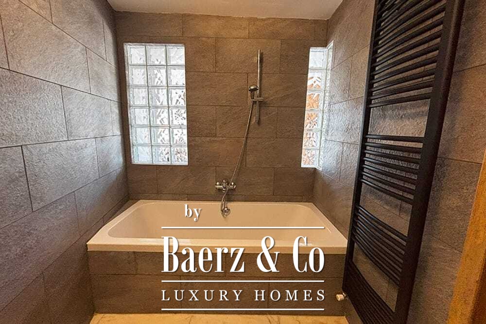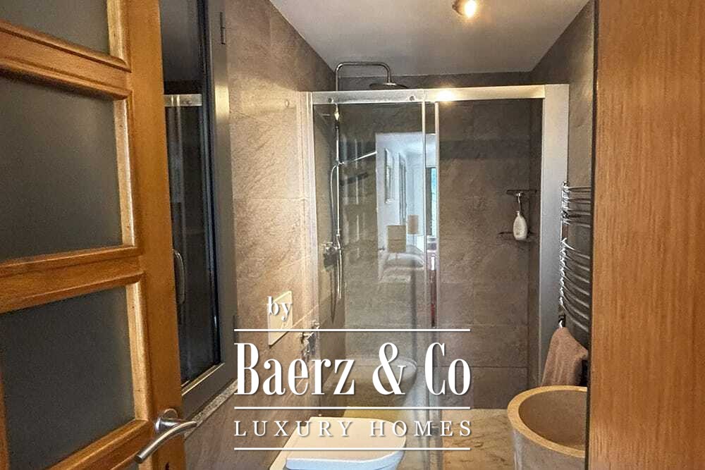 Within its two floors, the villa offers four bedrooms and four bathrooms. Three ground floor bedrooms, each with French doors, open to a lower terrace and mountain vistas. The master suite features a large bath, separate shower, twin marble basins, and designer fittings, defining a sense of sanctuary. The studio bedroom, with private entrance, enhances flexibility for guests or work. Upstairs, a beamed living room with fireplace adjoins a walnut and stainless steel kitchen equipped with premium Miele appliances. High glass doors lead to a lounge with a second fireplace and access to terraces finished with granite tables and Philippe Starck chairs.