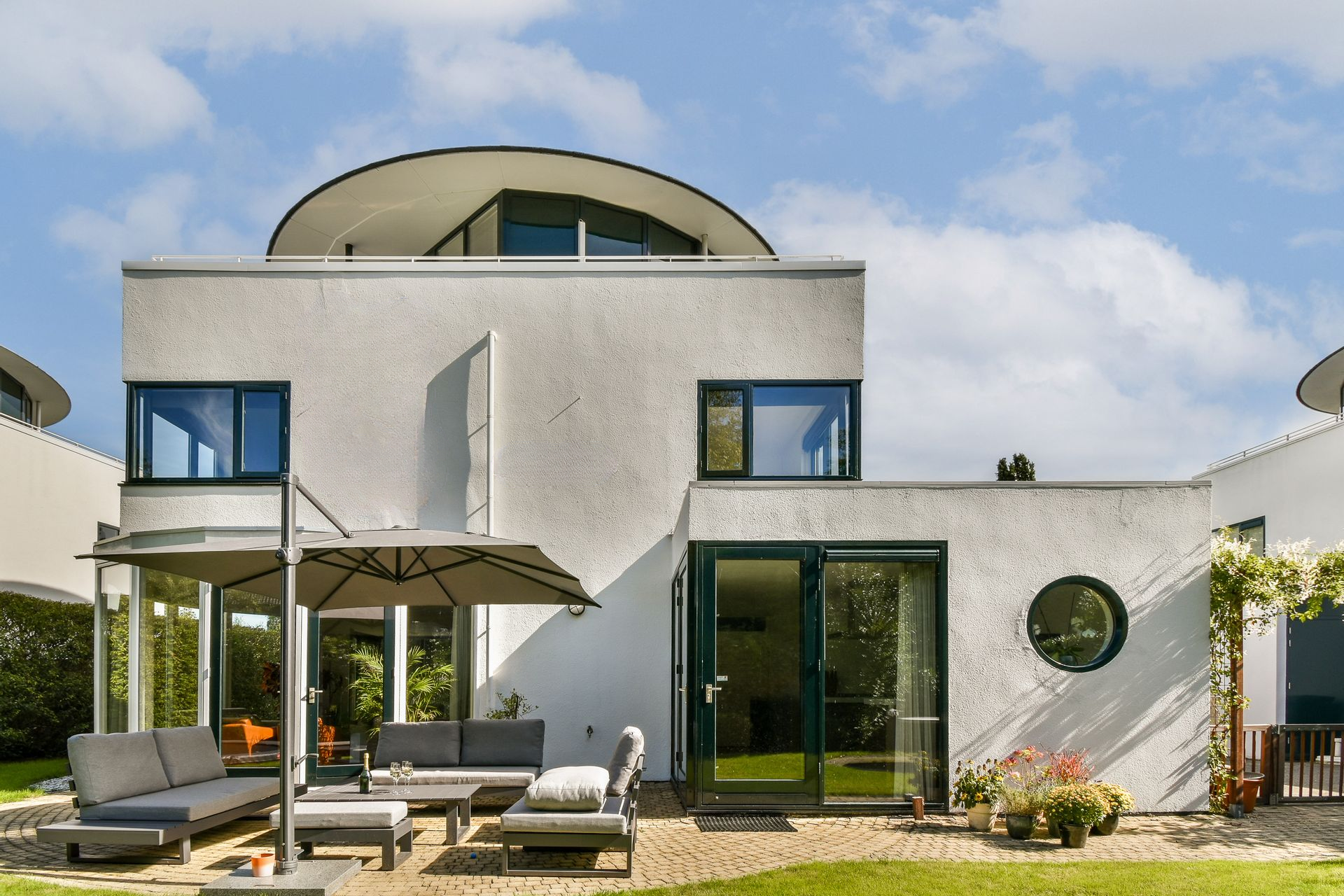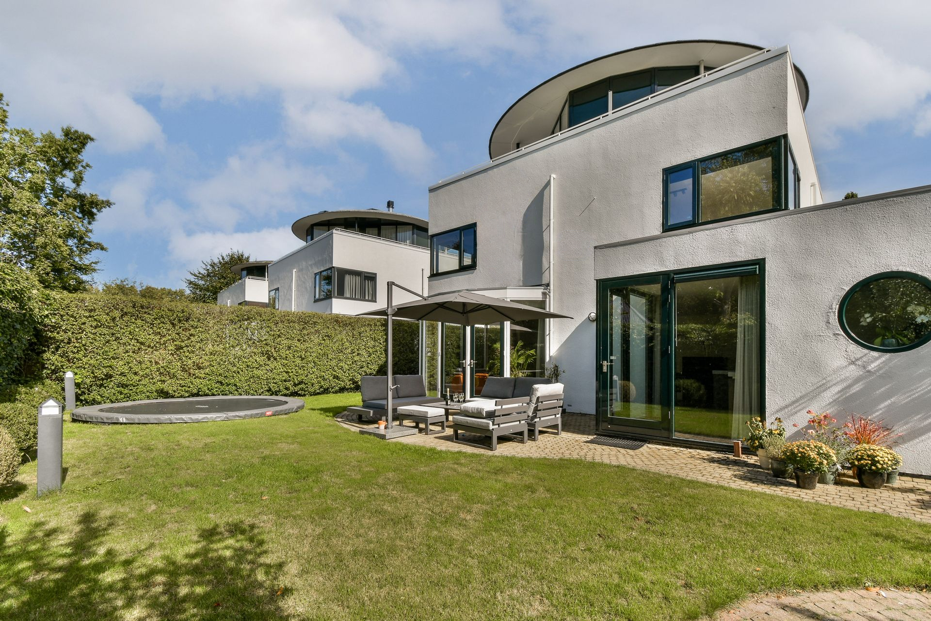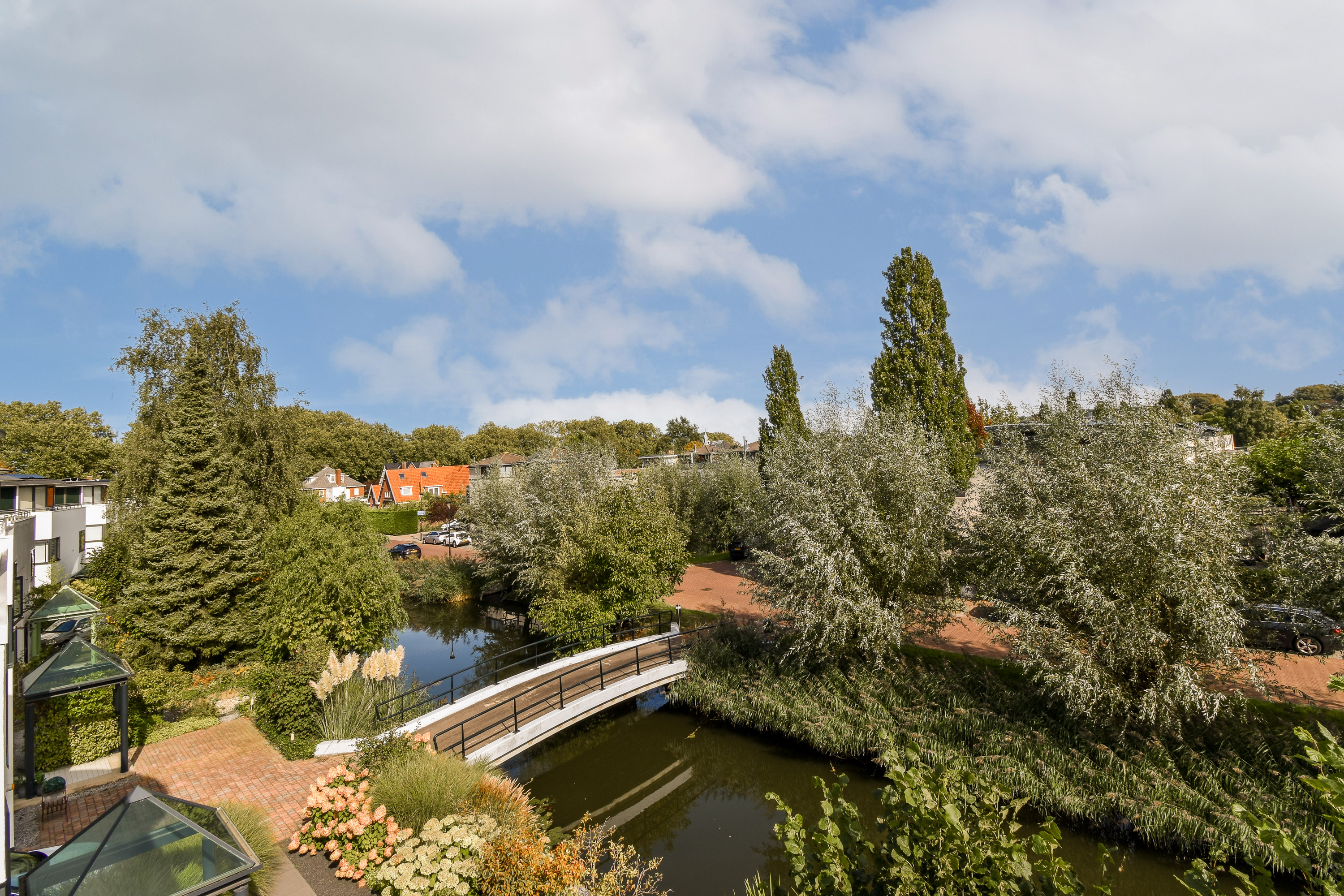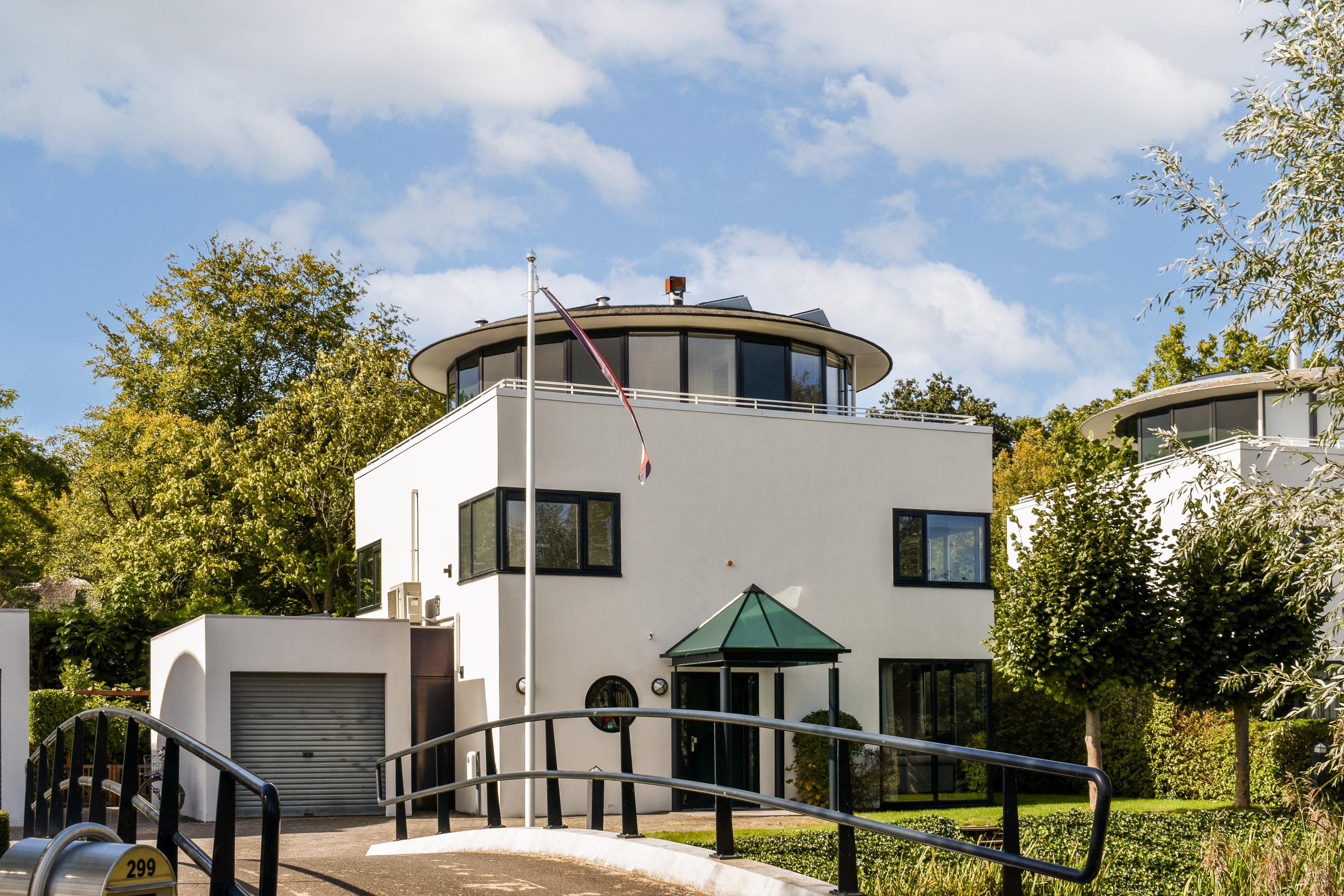 Designed by renowned architect Cees Dam, the villa was completed in 1995 and is instantly recognisable by its distinctive architecture, featuring a harmonious interplay of clean lines and rounded contours. The front of the property borders a wide water feature and is accessed via a bridge shared with the neighbouring home. The rear garden is expansive, beautifully private, and ideally positioned to enjoy the sun throughout the afternoon and evening with its west-facing orientation.