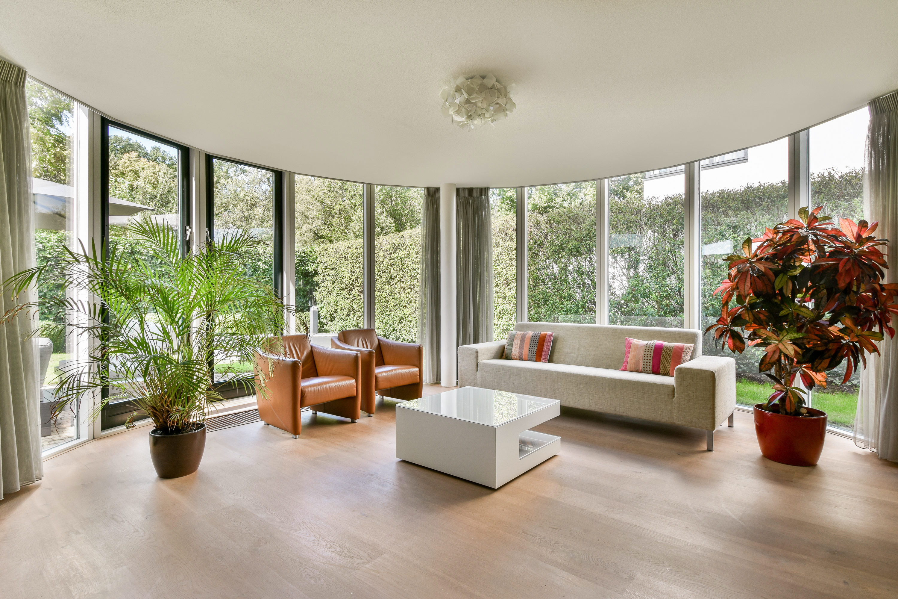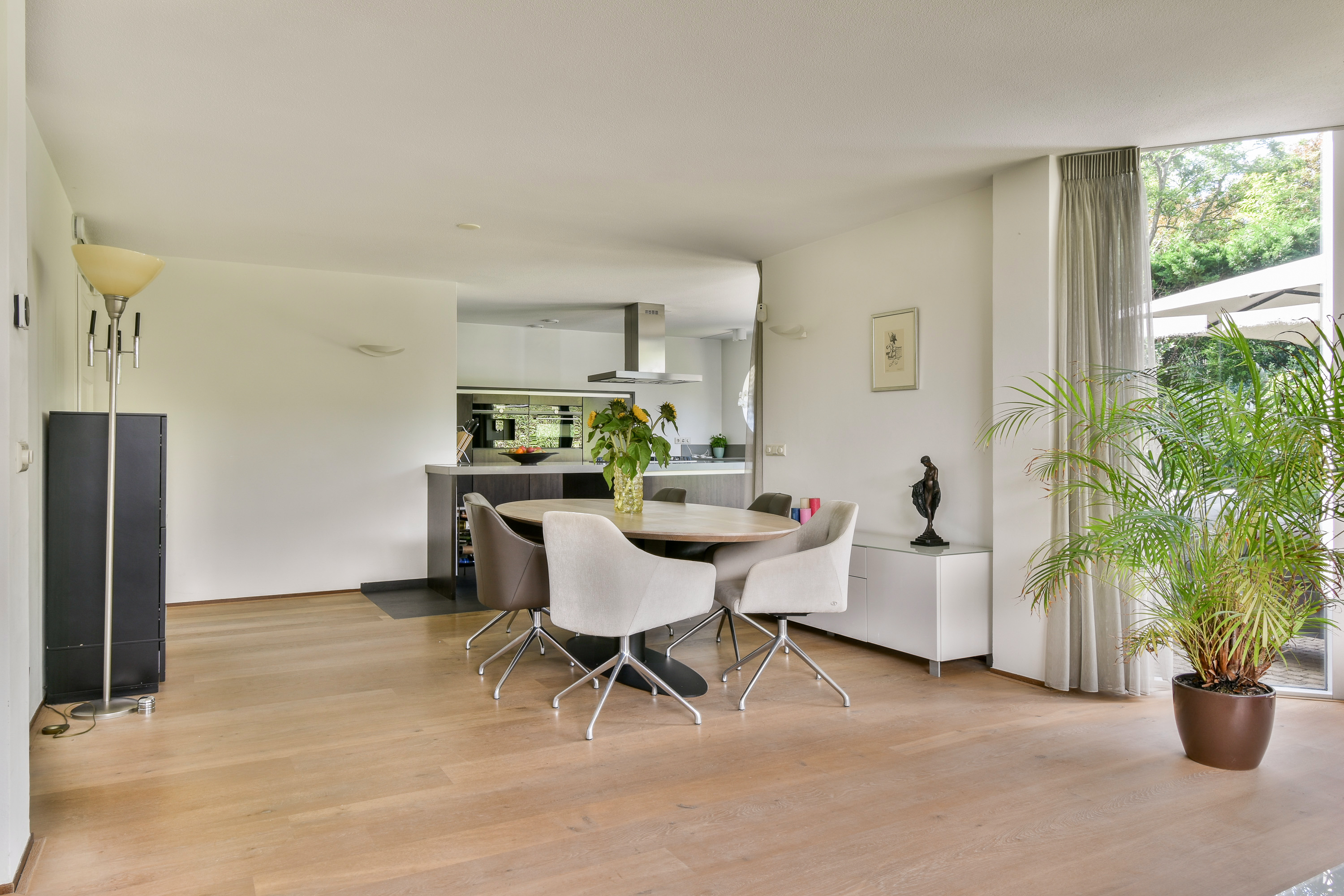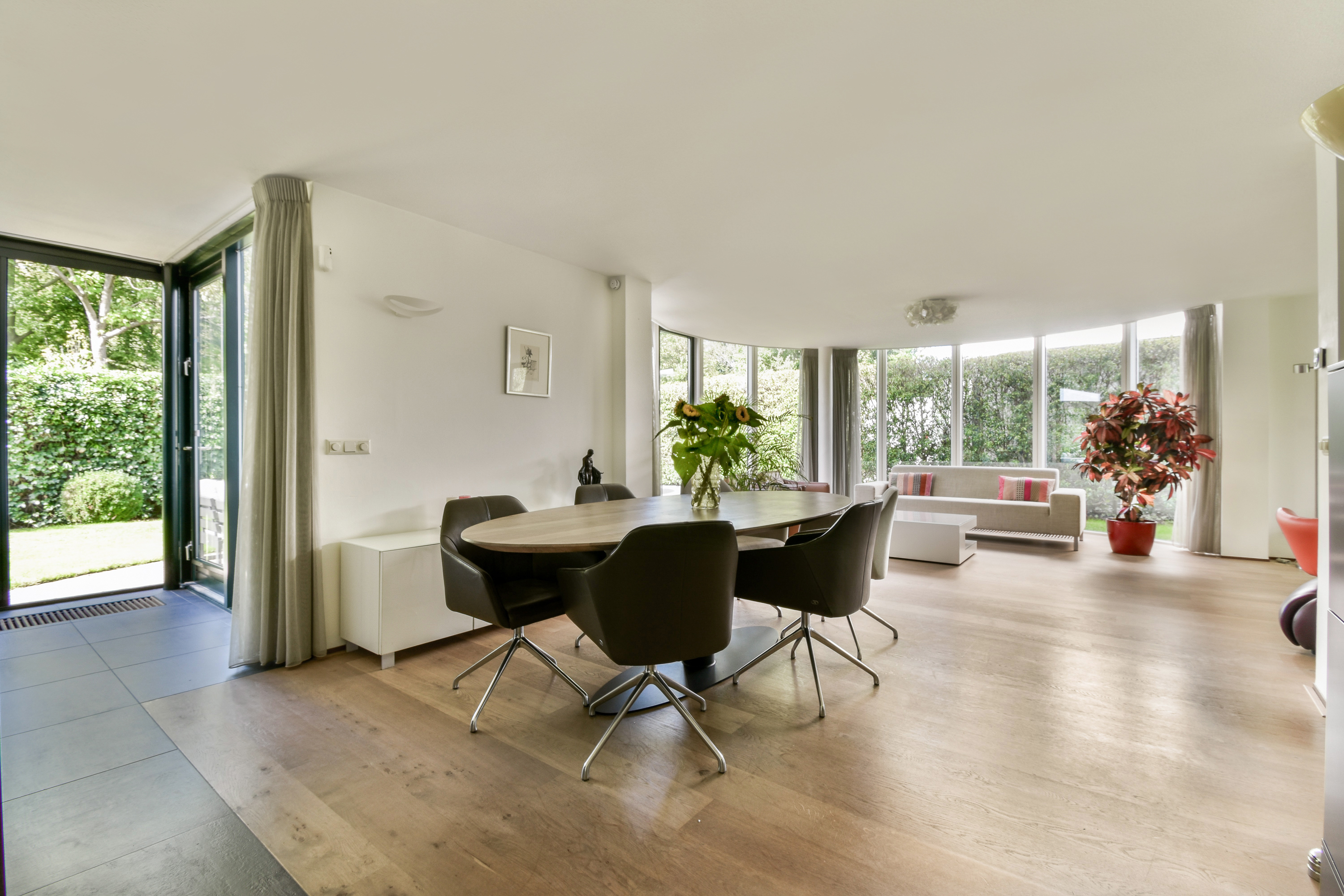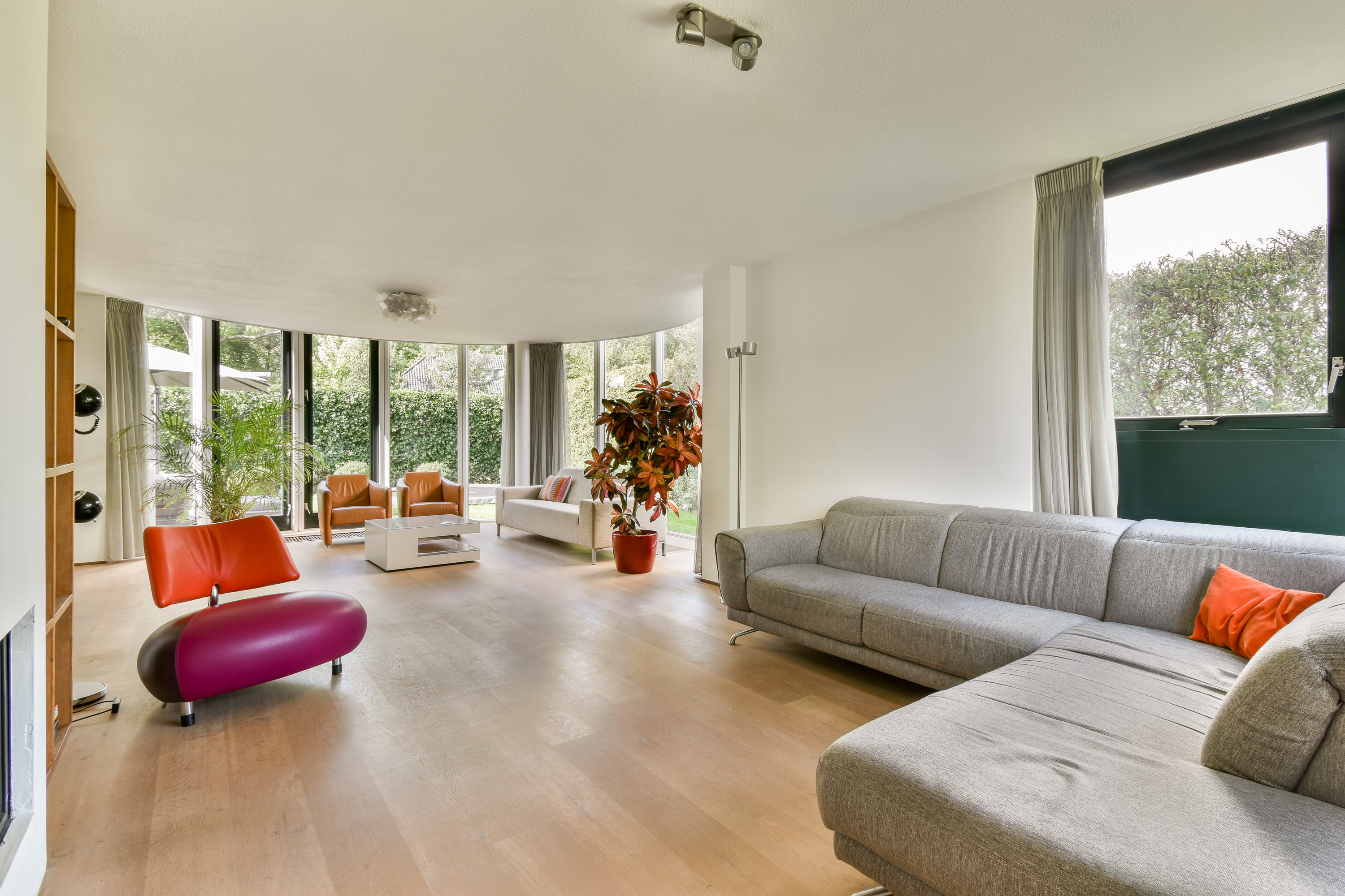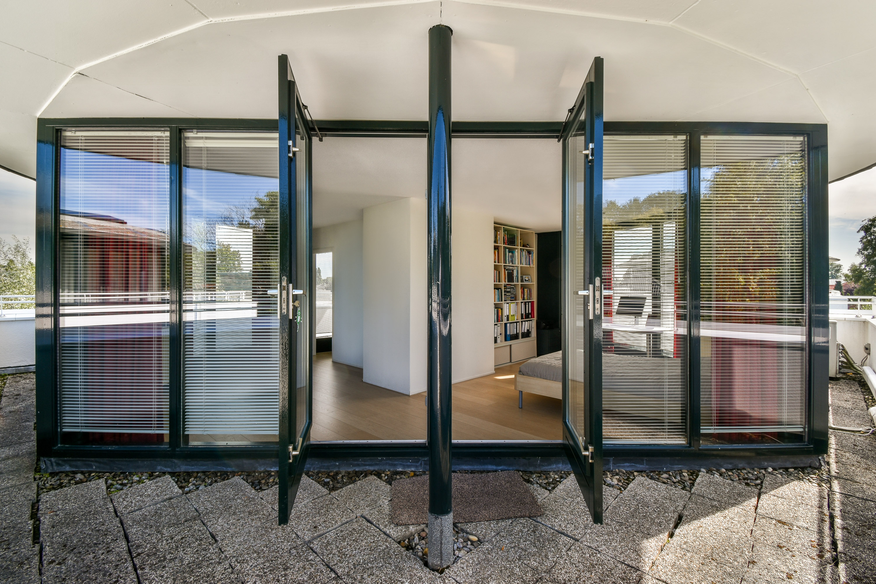 Designed by renowned architect Cees Dam, the villa was completed in 1995 and is instantly recognisable by its distinctive architecture, featuring a harmonious interplay of clean lines and rounded contours. The front of the property borders a wide water feature and is accessed via a bridge shared with the neighbouring home. The rear garden is expansive, beautifully private, and ideally positioned to enjoy the sun throughout the afternoon and evening with its west-facing orientation.