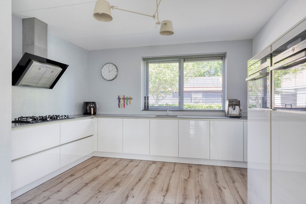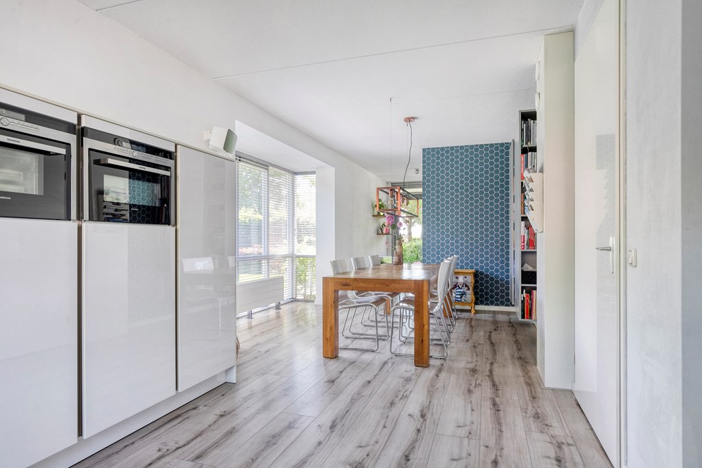 Adjoining the living room is the live-in kitchen at the front of the house. This luxury kitchen is spacious, with an L-shaped worktop and various built-in appliances, including a Quooker, steam oven, combi-oven, dishwasher, and gas hob. It’s the ideal place to prepare delicious meals and create special moments with family and friends.