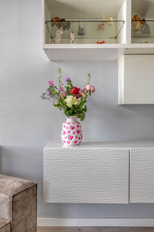 French doors from the living room open to the deep, green back garden that borders the floodplains—the true highlight of this property. The garden is beautifully laid out with a mix of paving and greenery and offers plenty of room for a lounge set or outdoor dining table. Its orientation allows you to make the most of the sun throughout the day. At the back of the garden is a charming covered terrace (with internet connection), perfect for sitting and/or working outdoors even on less sunny days. The garden offers excellent privacy and forms a true oasis of calm.