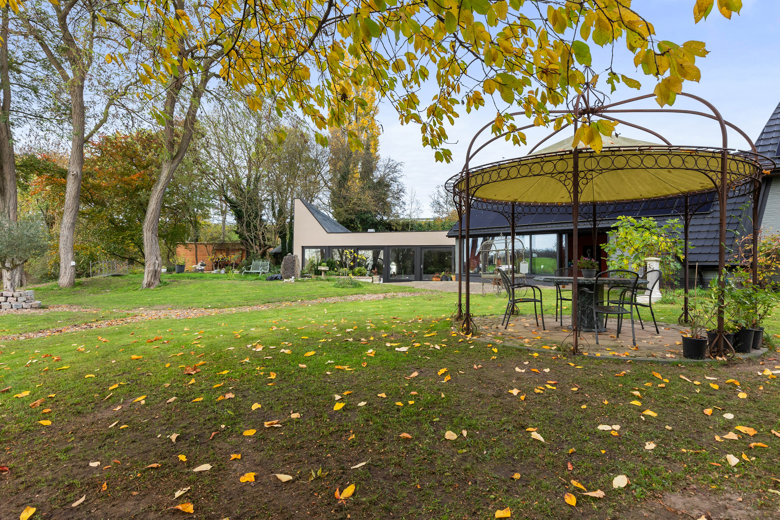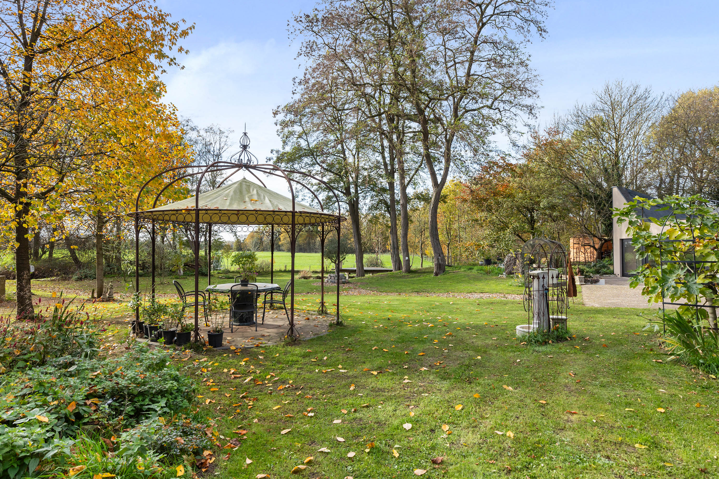 The garden surrounding the property has been landscaped with great care for atmosphere and tranquillity. Facing south, the rear garden blends seamlessly into the surrounding fields, while mature trees and hedges provide privacy. A romantic gazebo, a gently flowing stream with footbridge, and a floating deck with panoramic views together create a place where nature and design meet in harmony. A carport, timber outbuilding and fully enclosed grounds offer comfort and security for both residents and animals.