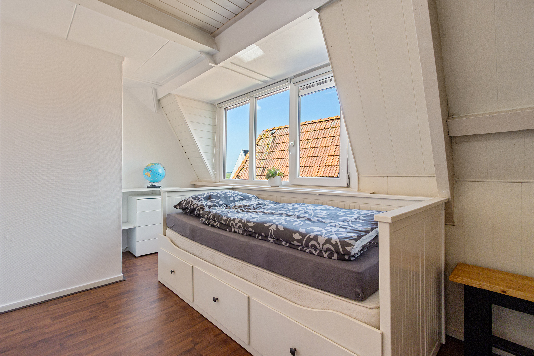 Spacious landing with dormer window and workspace, a second and third bedroom, both with dormers, one of which includes a shower, washbasin, and toilet.
