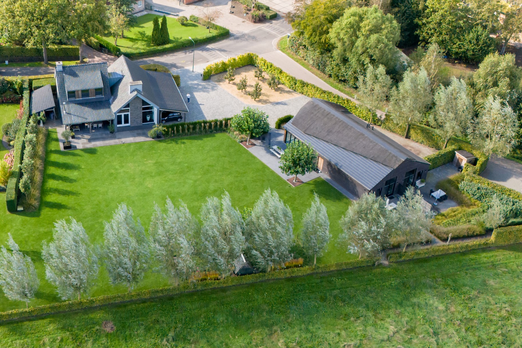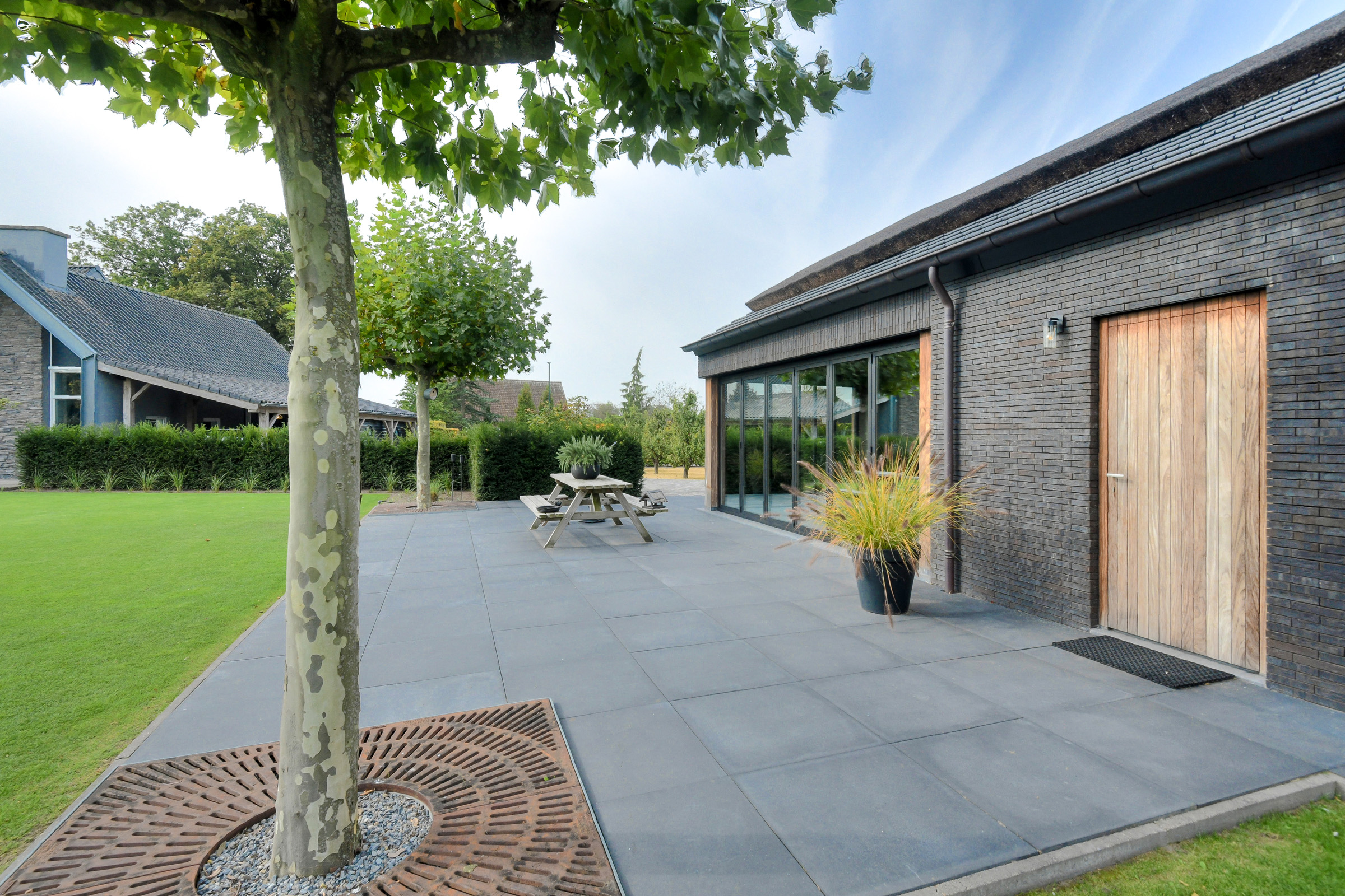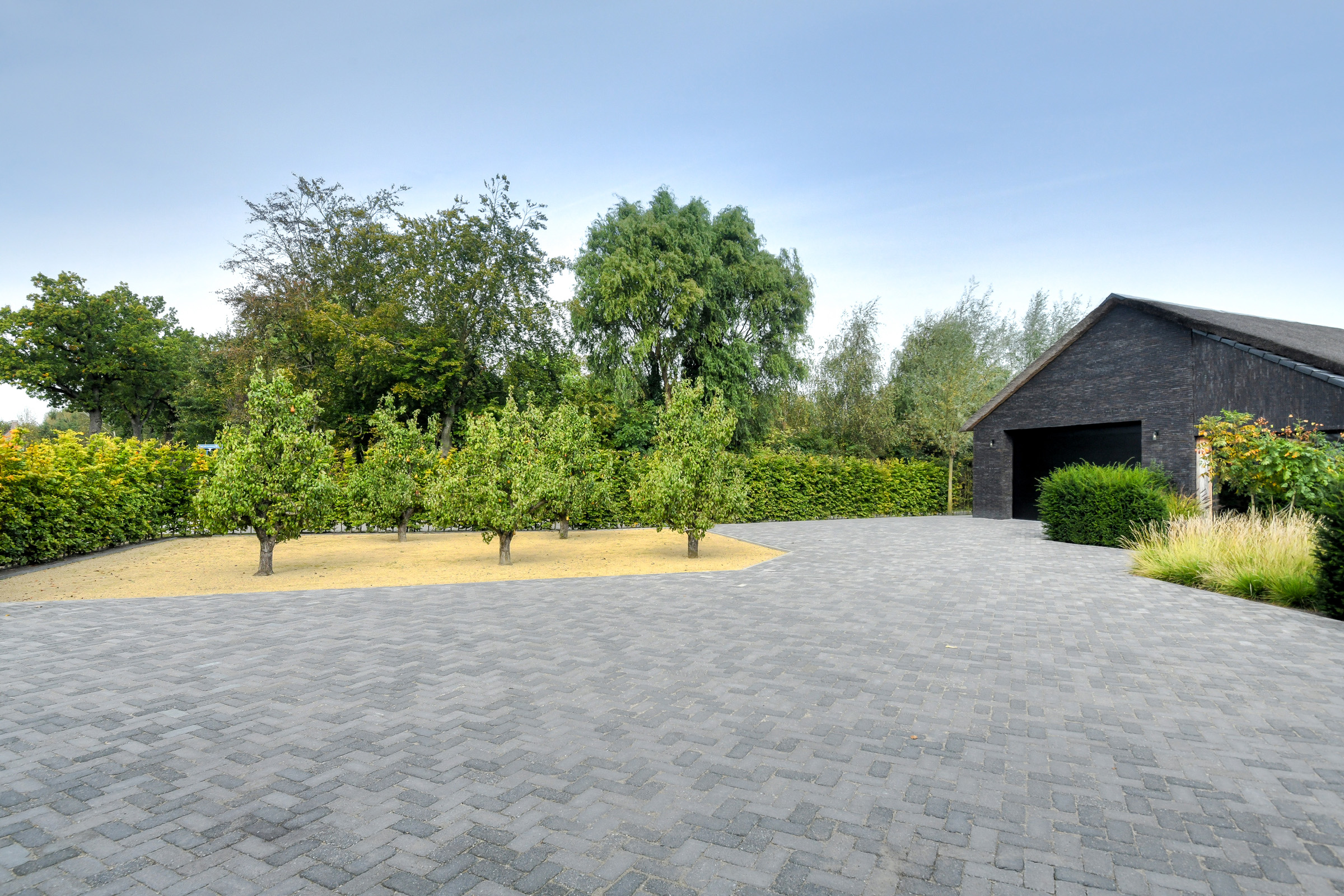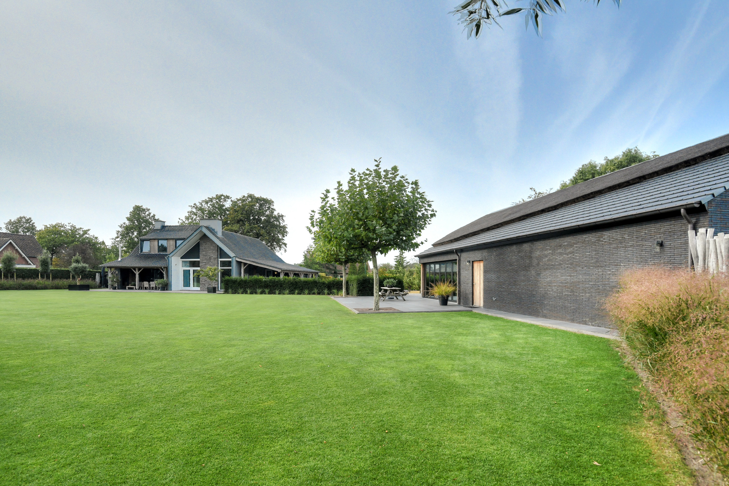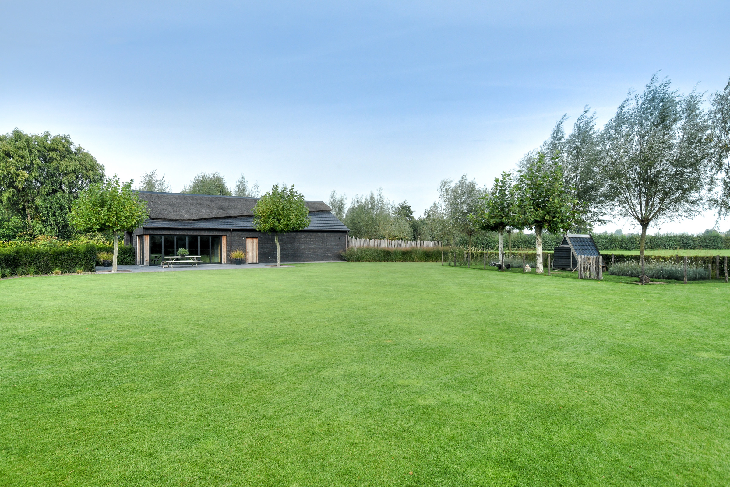 The garden offers maximum privacy and is beautifully landscaped, featuring a large lawn, ornamental grass borders, small trees, and shrubs. At the rear, the garden is bordered by a low beech hedge, preserving the view of the landscape beyond.