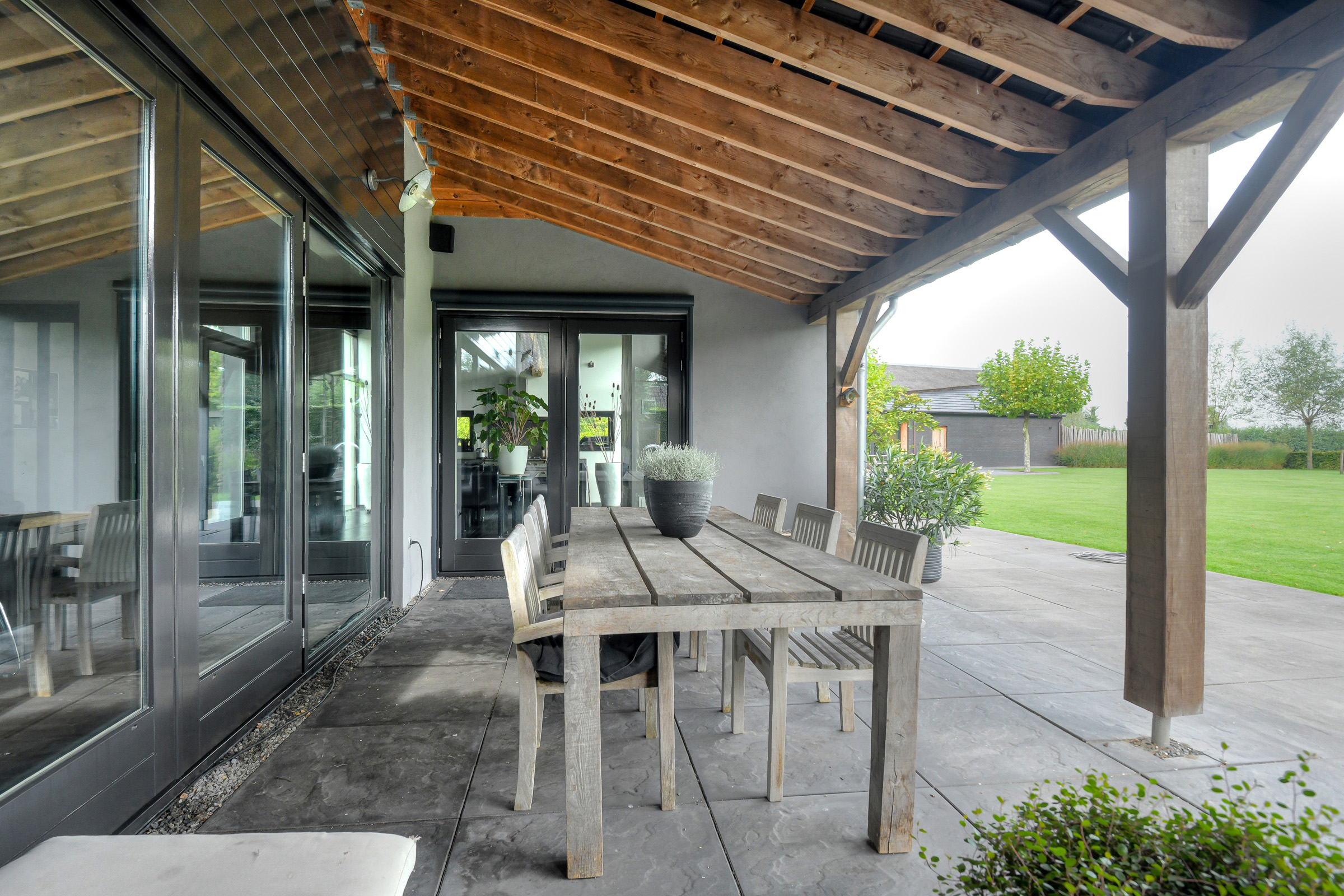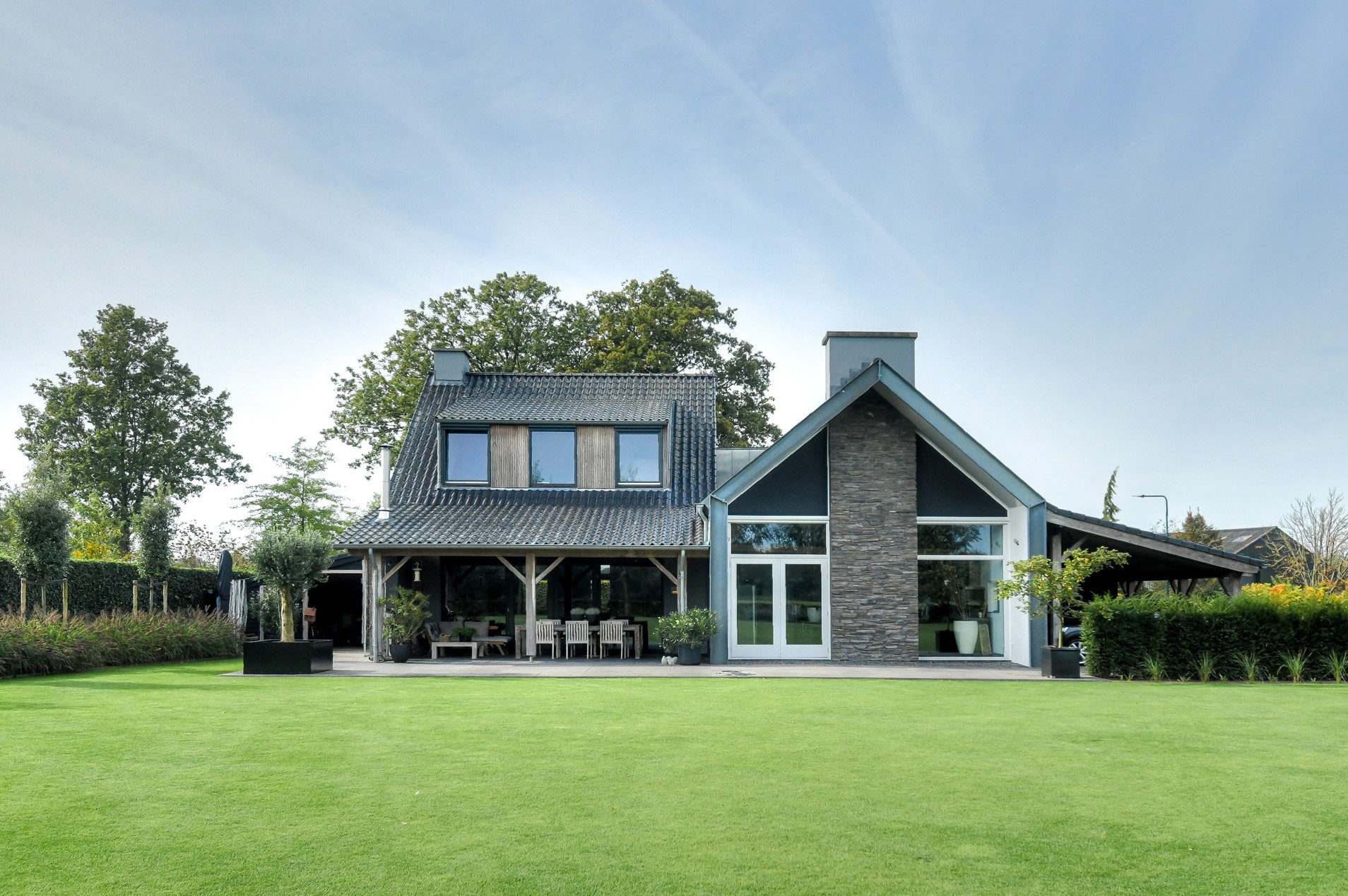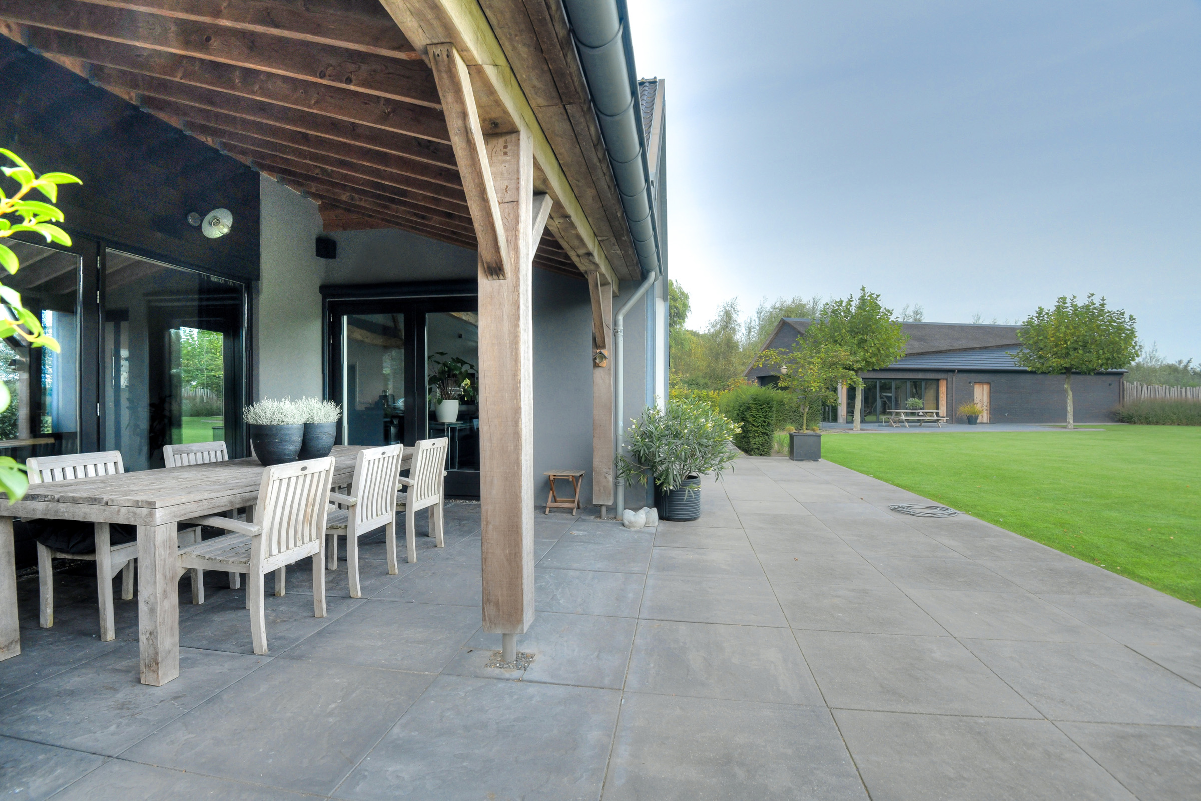 French doors provide access to the veranda. From here too – where an outdoor fireplace is located – you can enjoy stunning views of the garden and surrounding landscape.