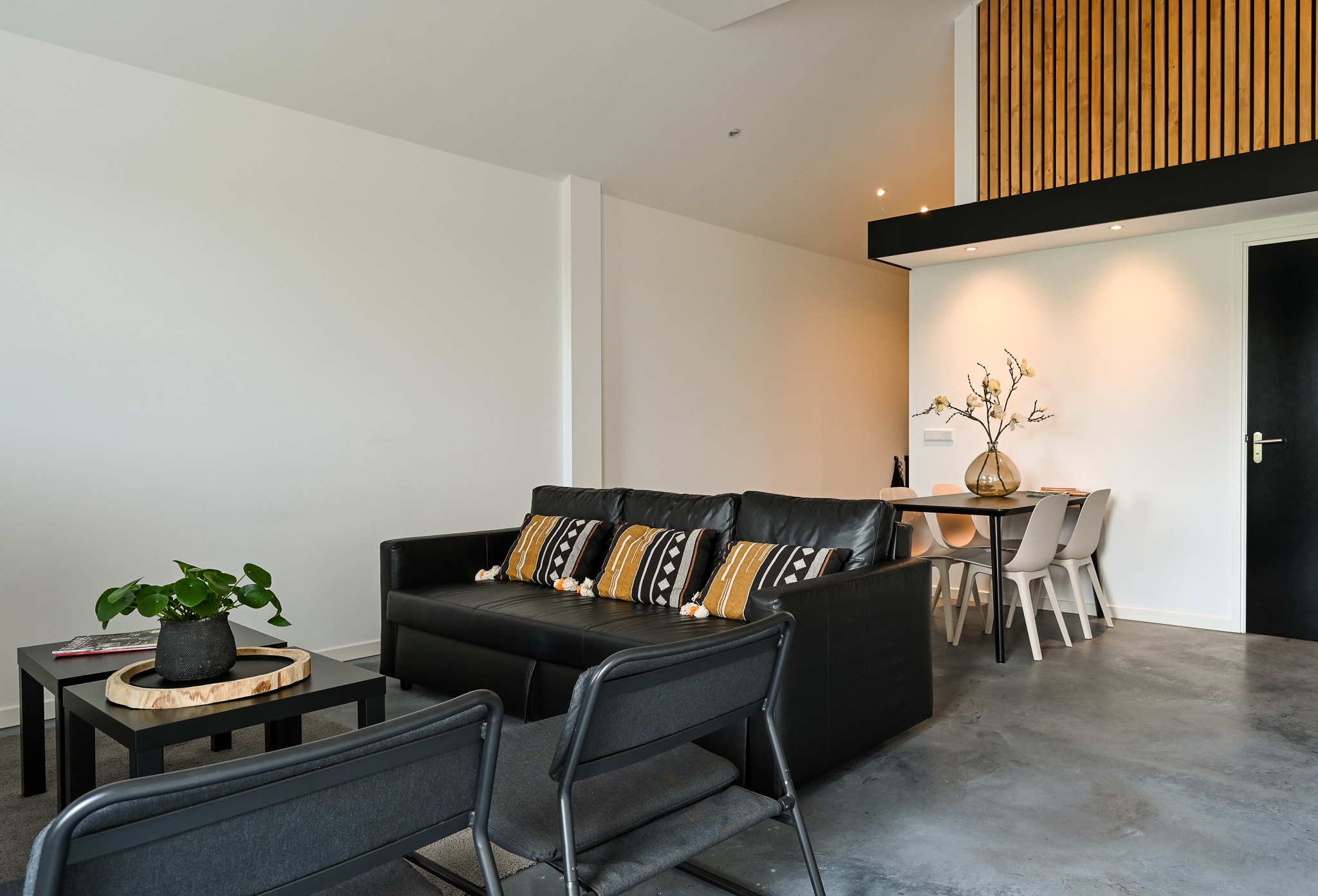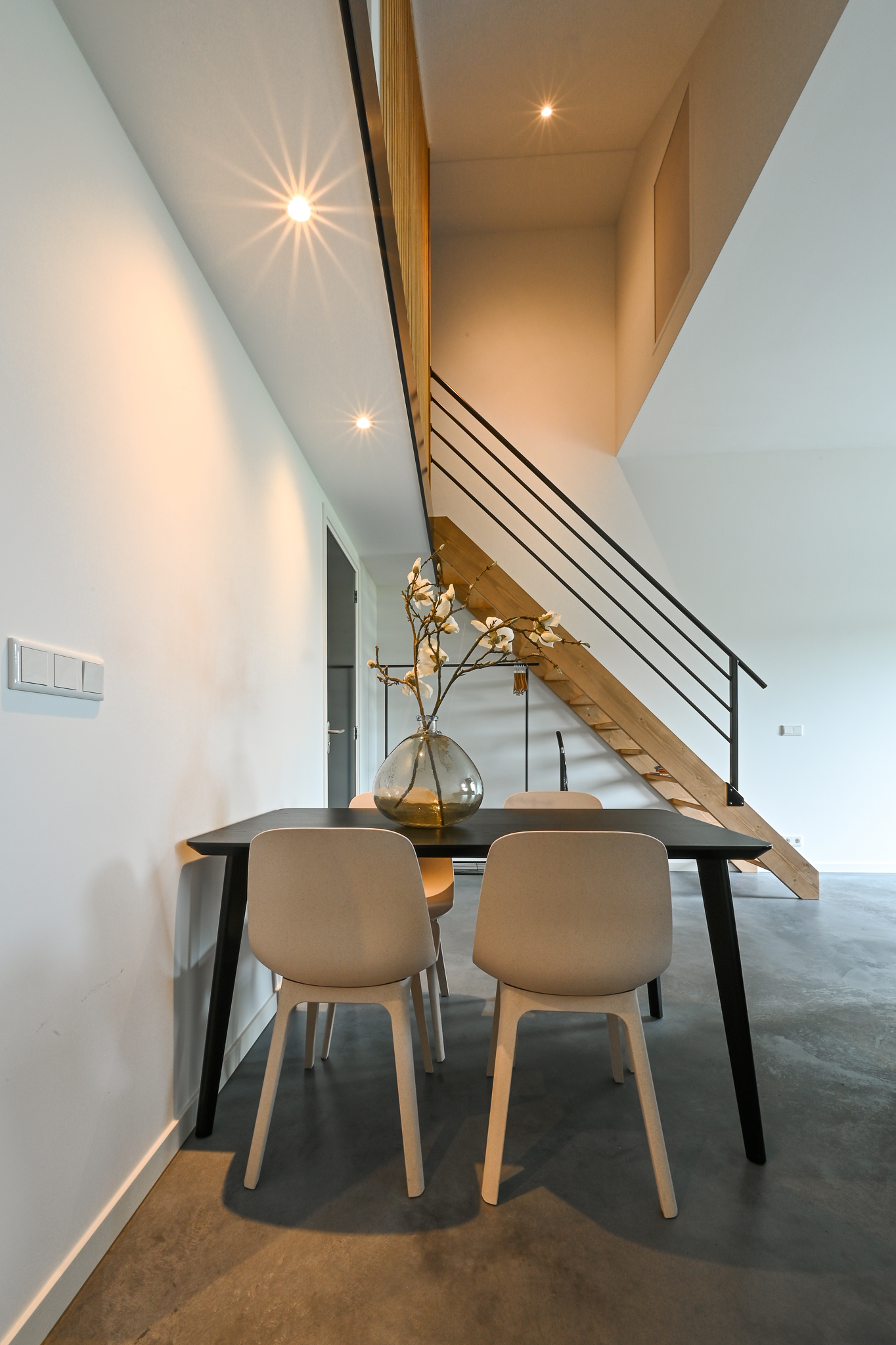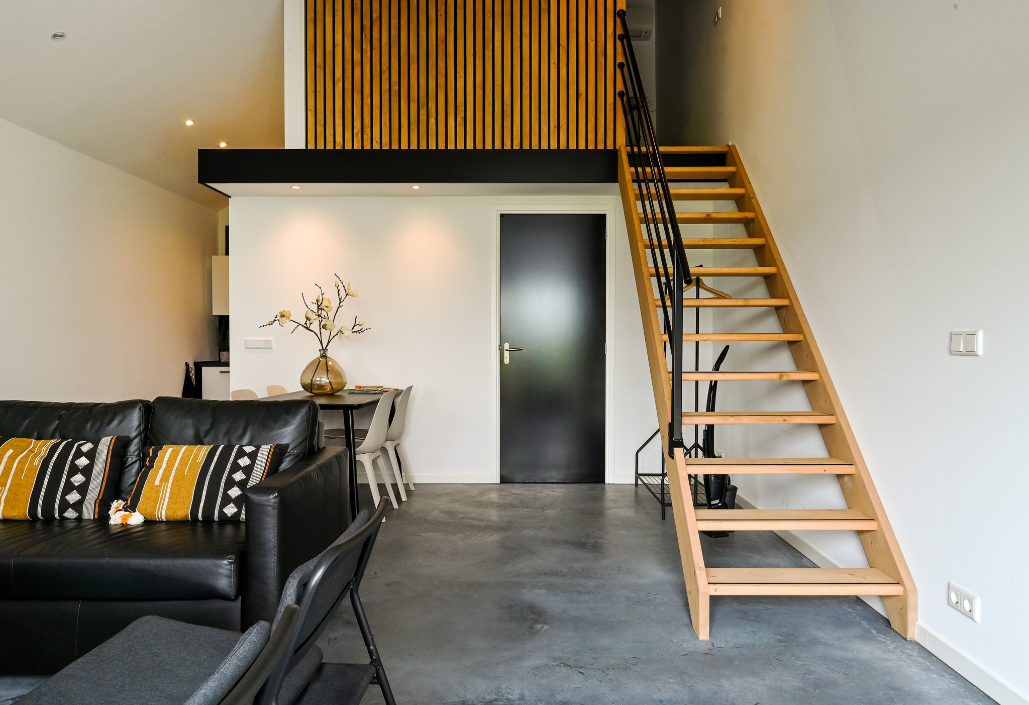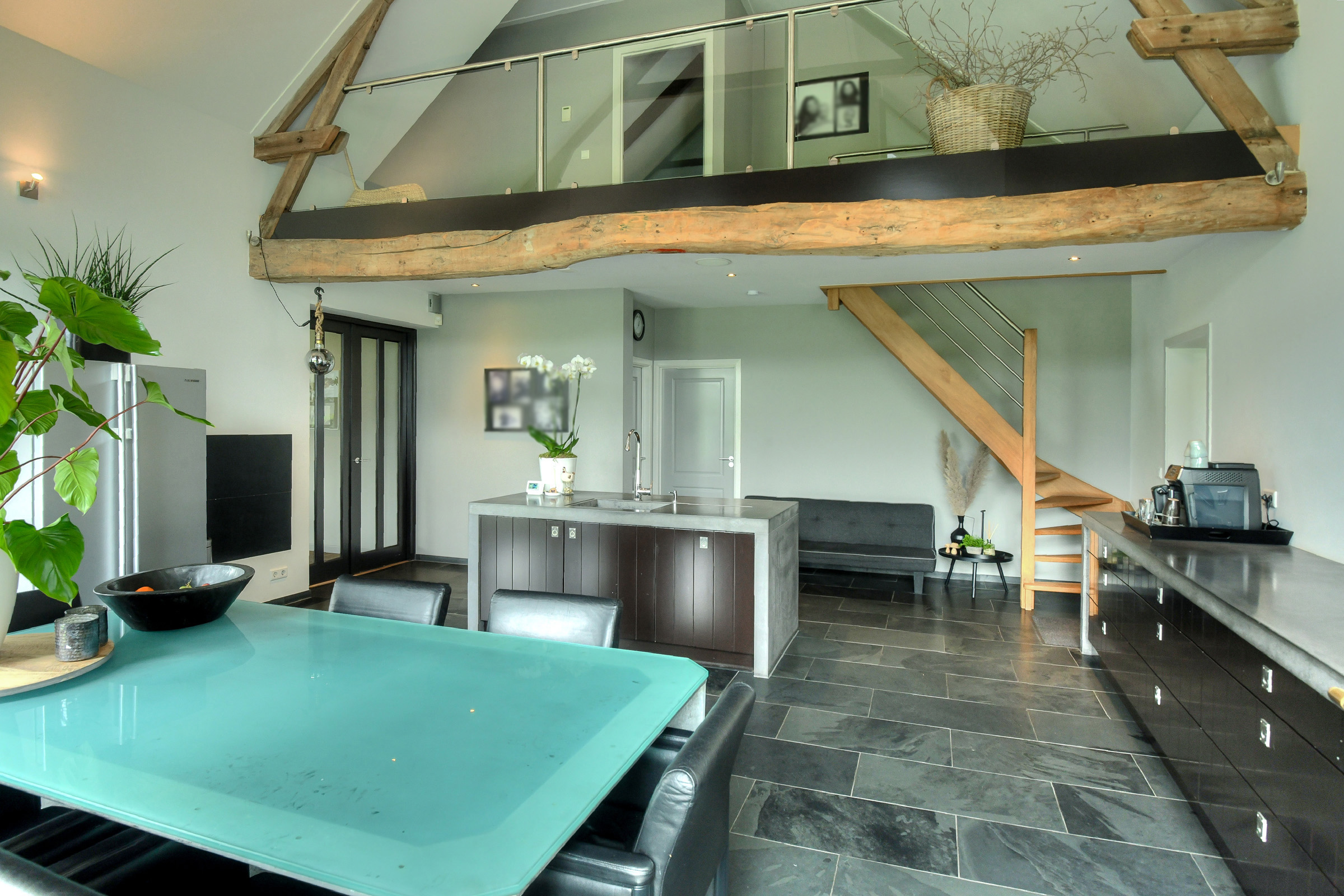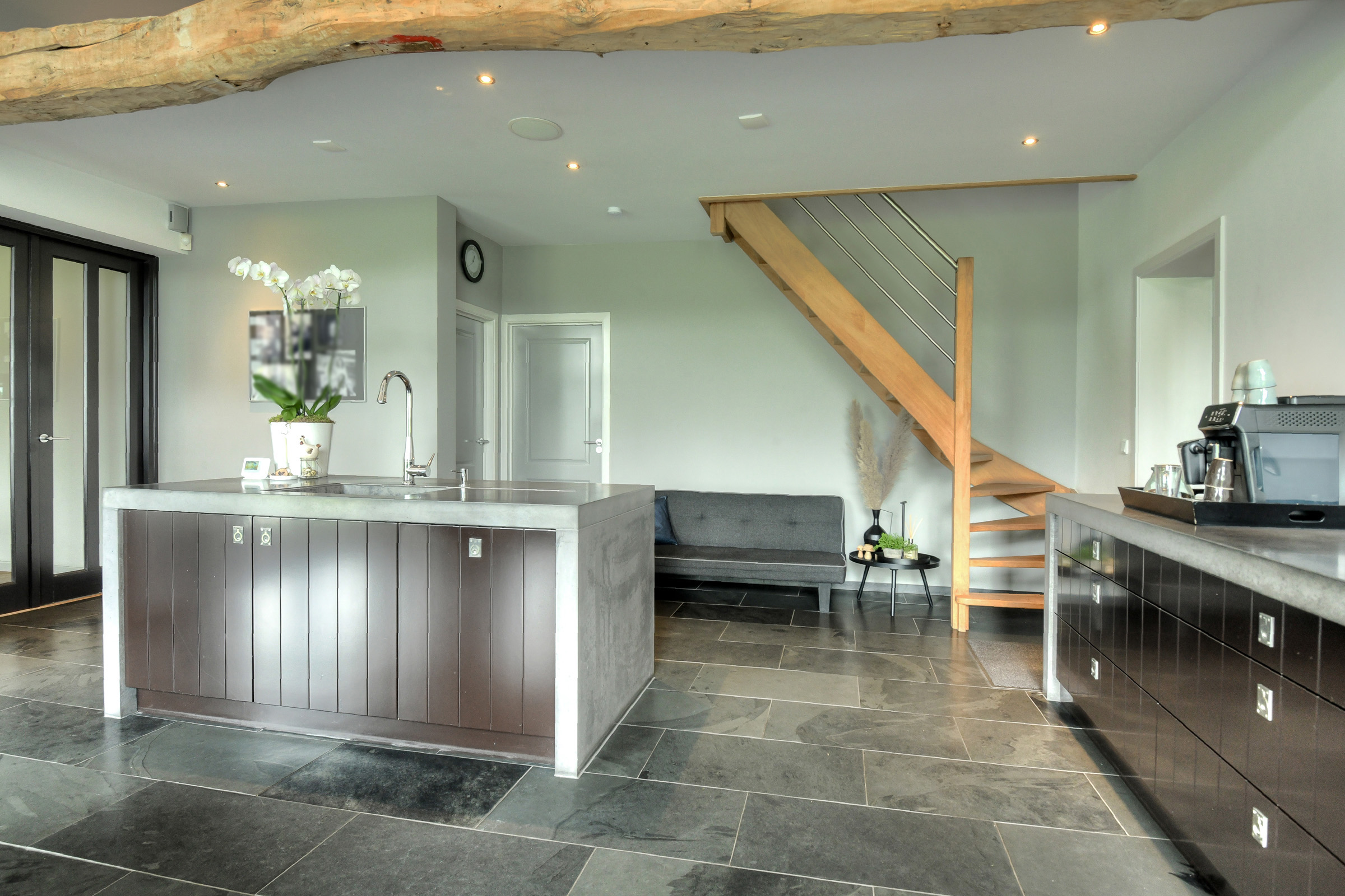 The beautiful kitchen-diner (approx. 51 m²) forms the heart of the home. This light and very spacious kitchen is equipped with a modern and luxurious design, including a concrete countertop, a wide gas stove (Lacanche) with multiple ovens, an extractor hood, and ample storage space. There is also a kitchen island (also with concrete top) with sink, designer faucet, dishwasher, and additional cupboard space.