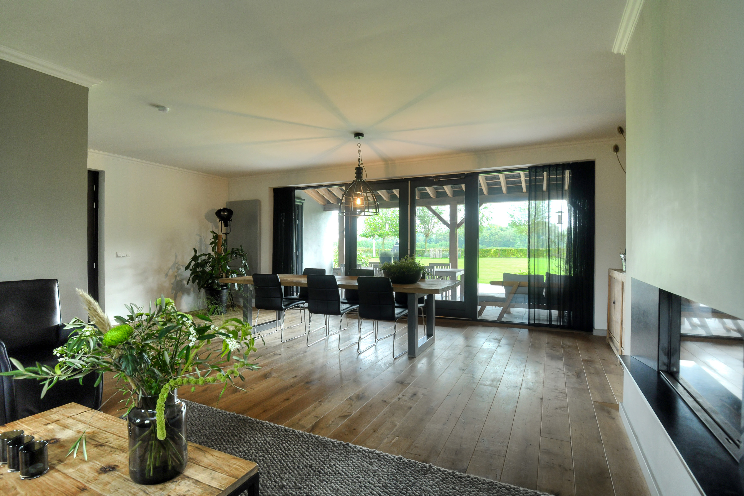 On the garden side, there are two sets of double garden doors and a large glass facade, offering beautiful views of the garden and the meadow/nature reserve beyond. A modern gas fireplace is built into the wall between the kitchen and garden.
