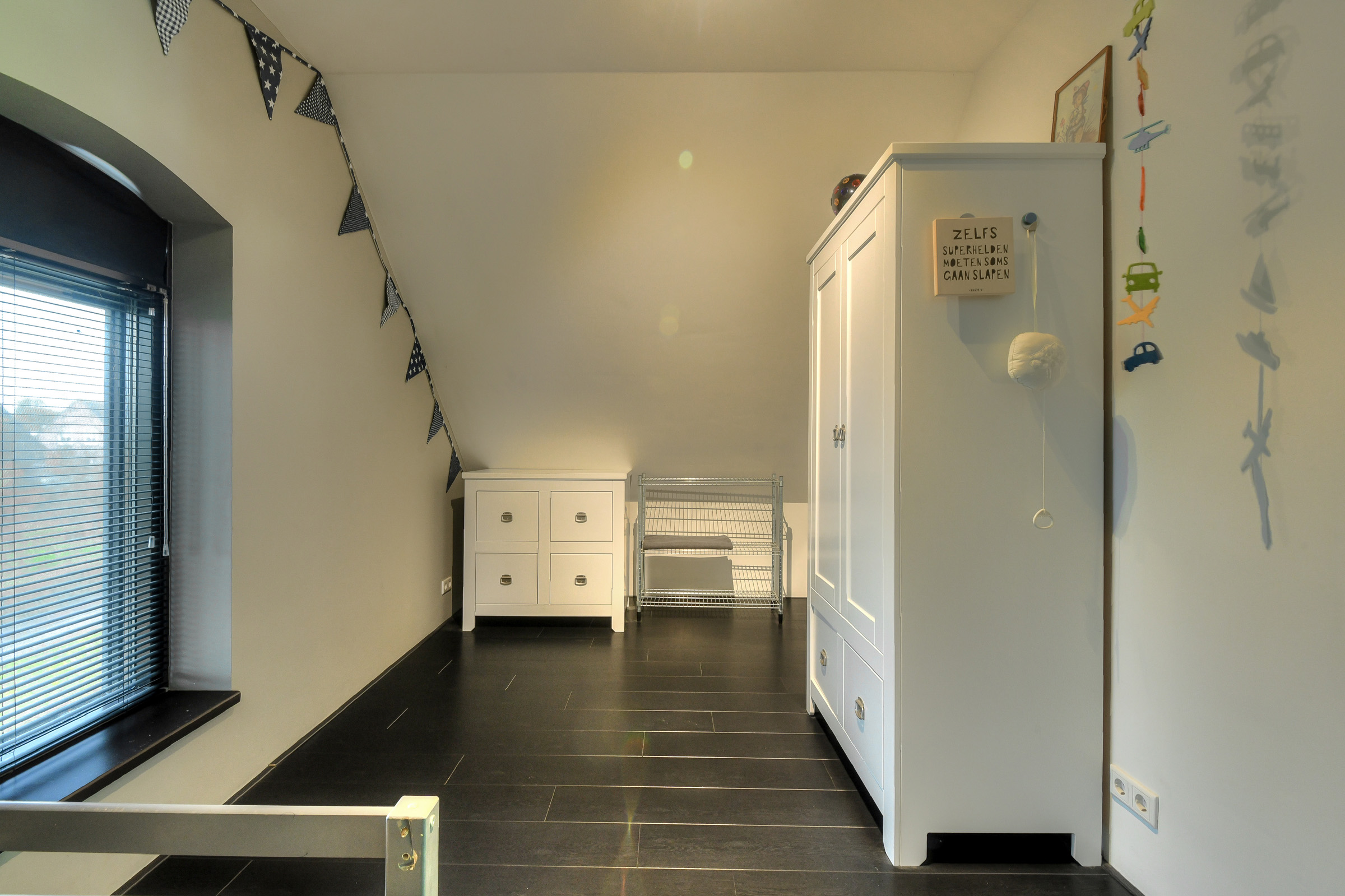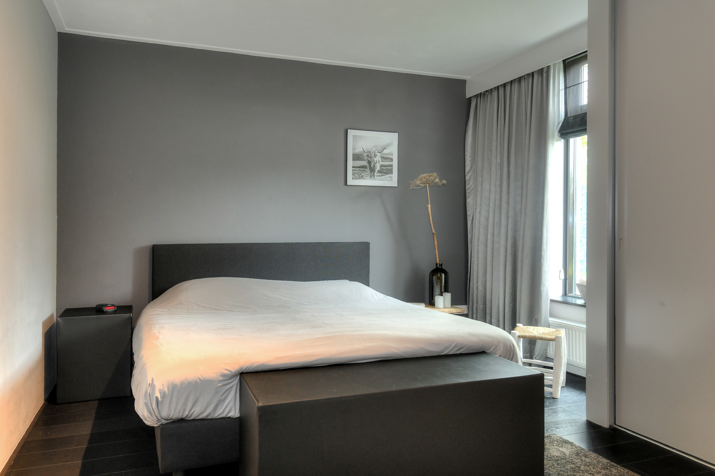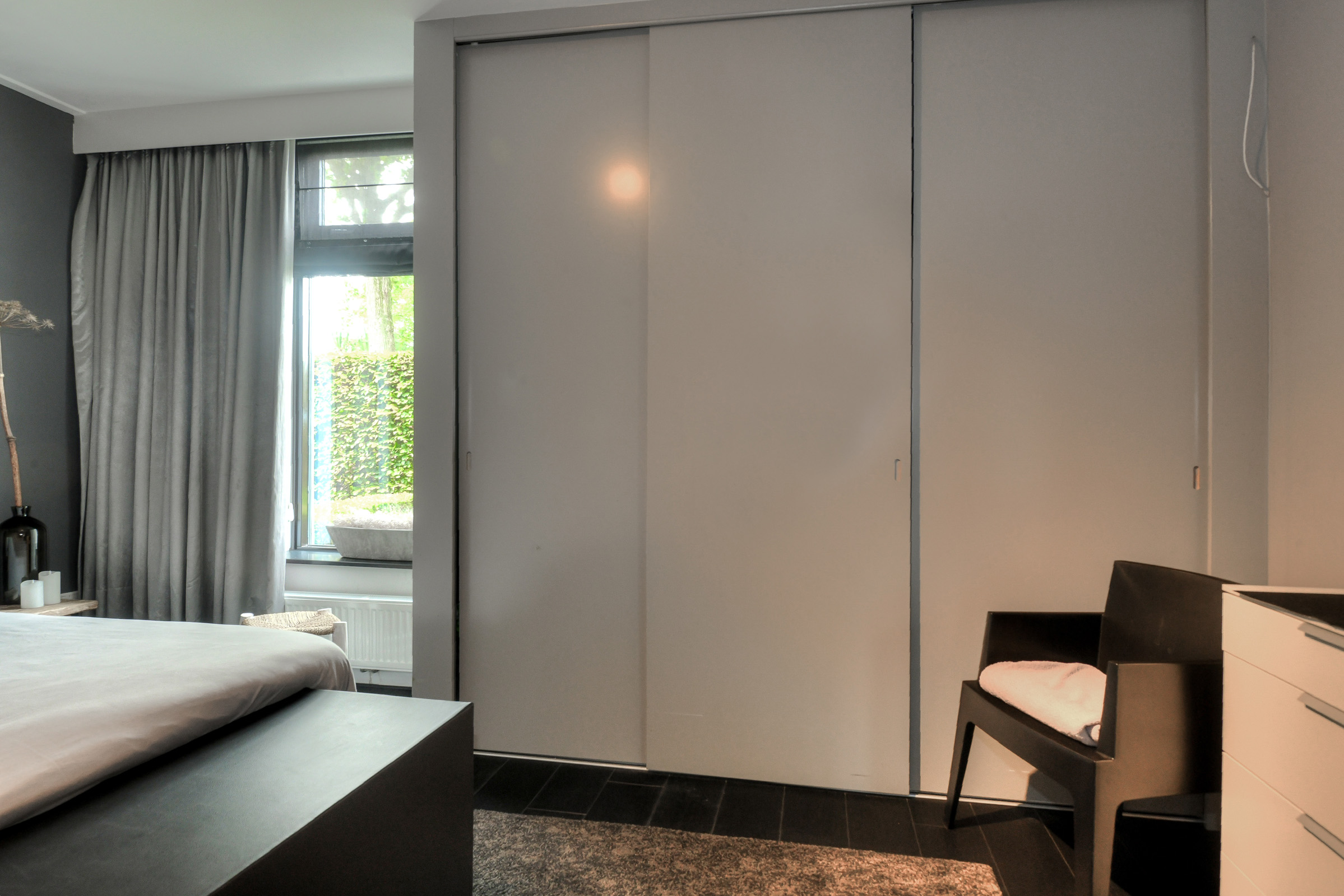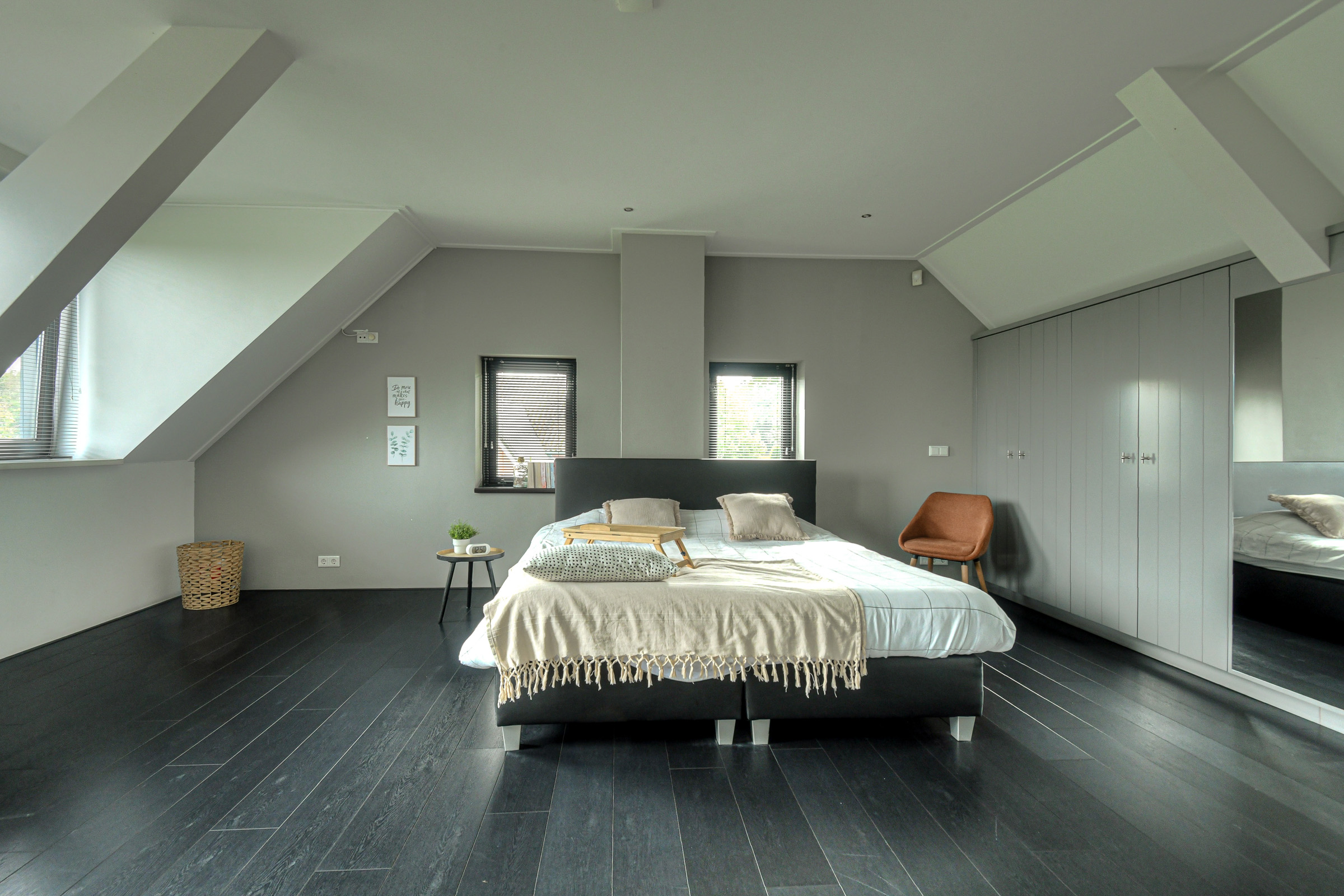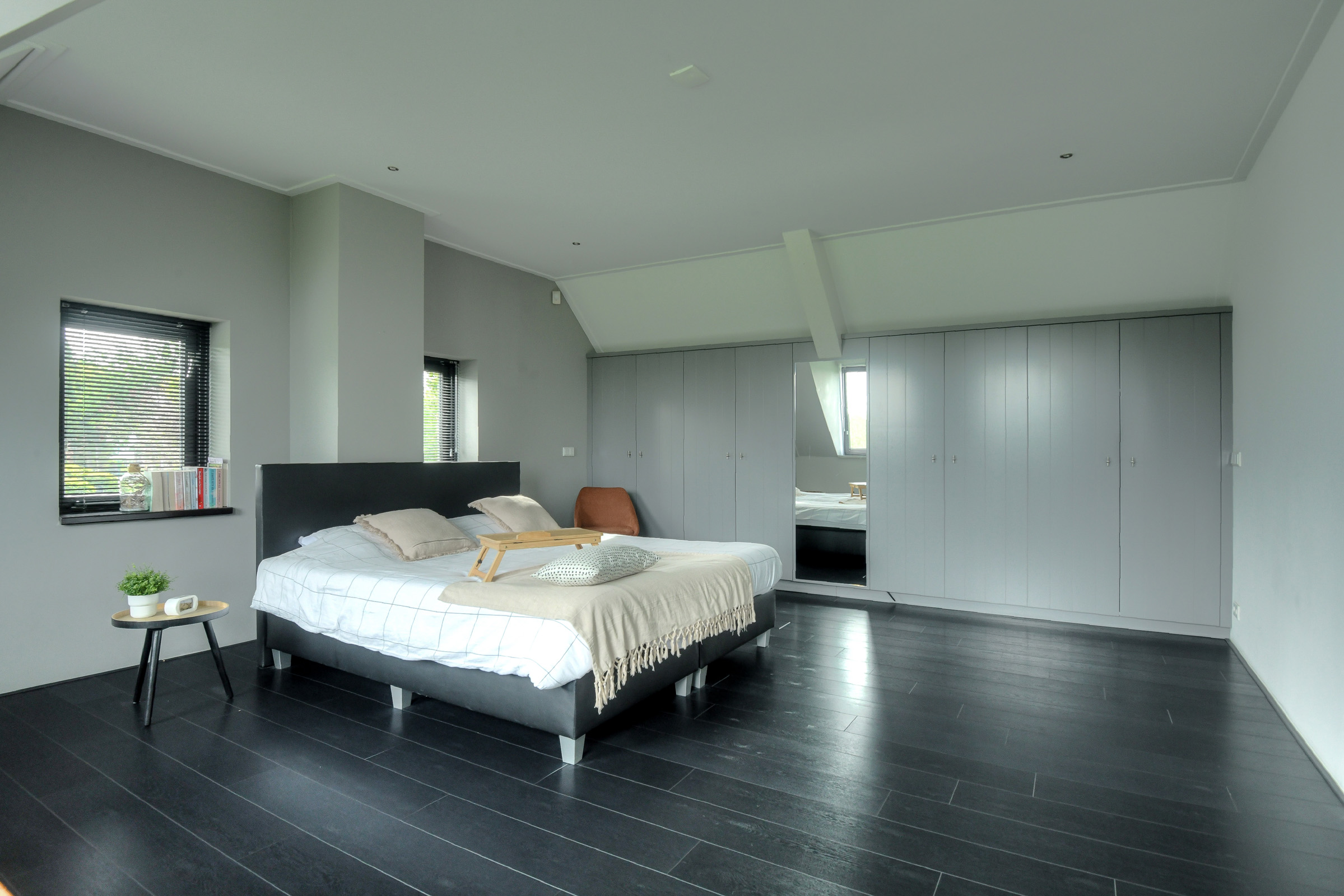 Master bedroom (approx. 4.55 x 3.00 m) with large wardrobe. This room also contains the meter cupboard (8 circuits + 3-phase power + earth leakage switch). The floor is fitted with stylish dark laminate.