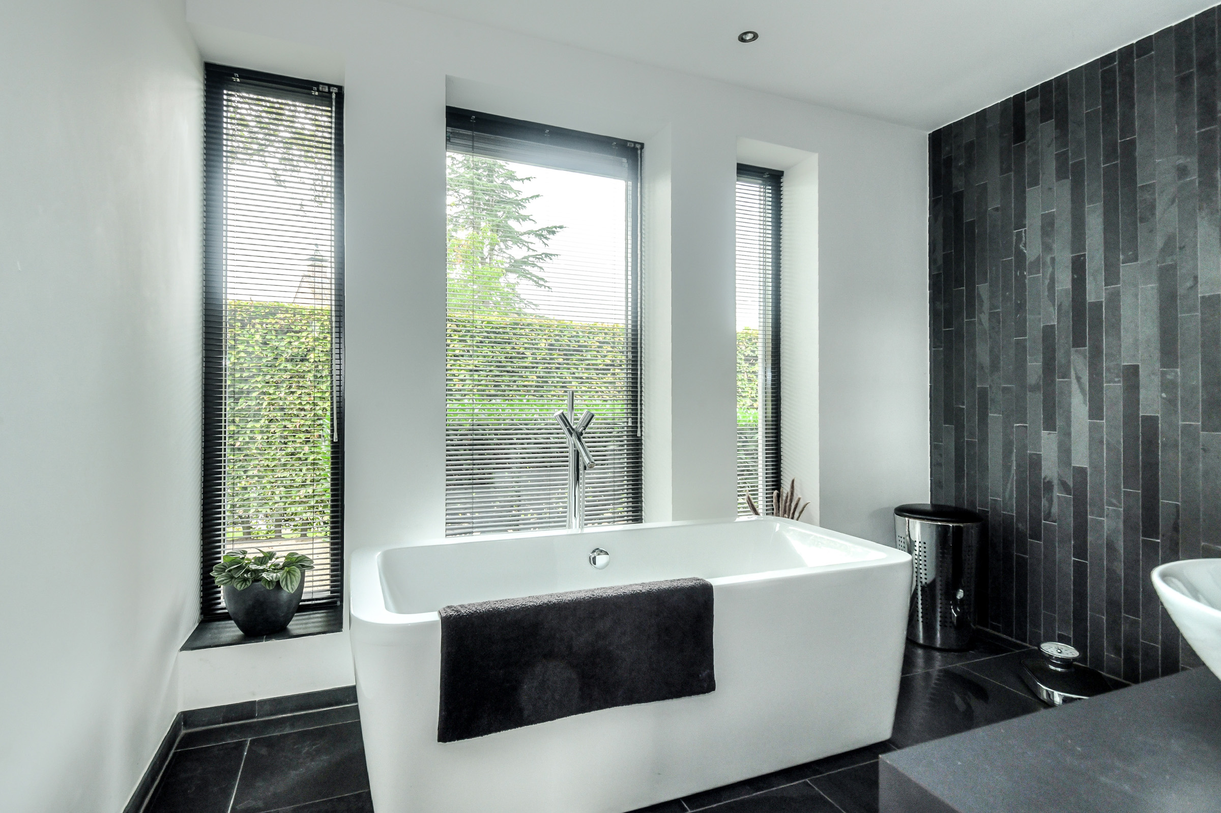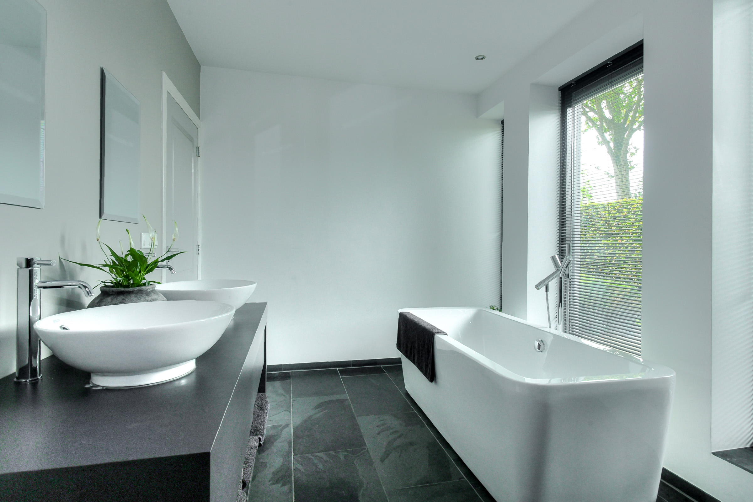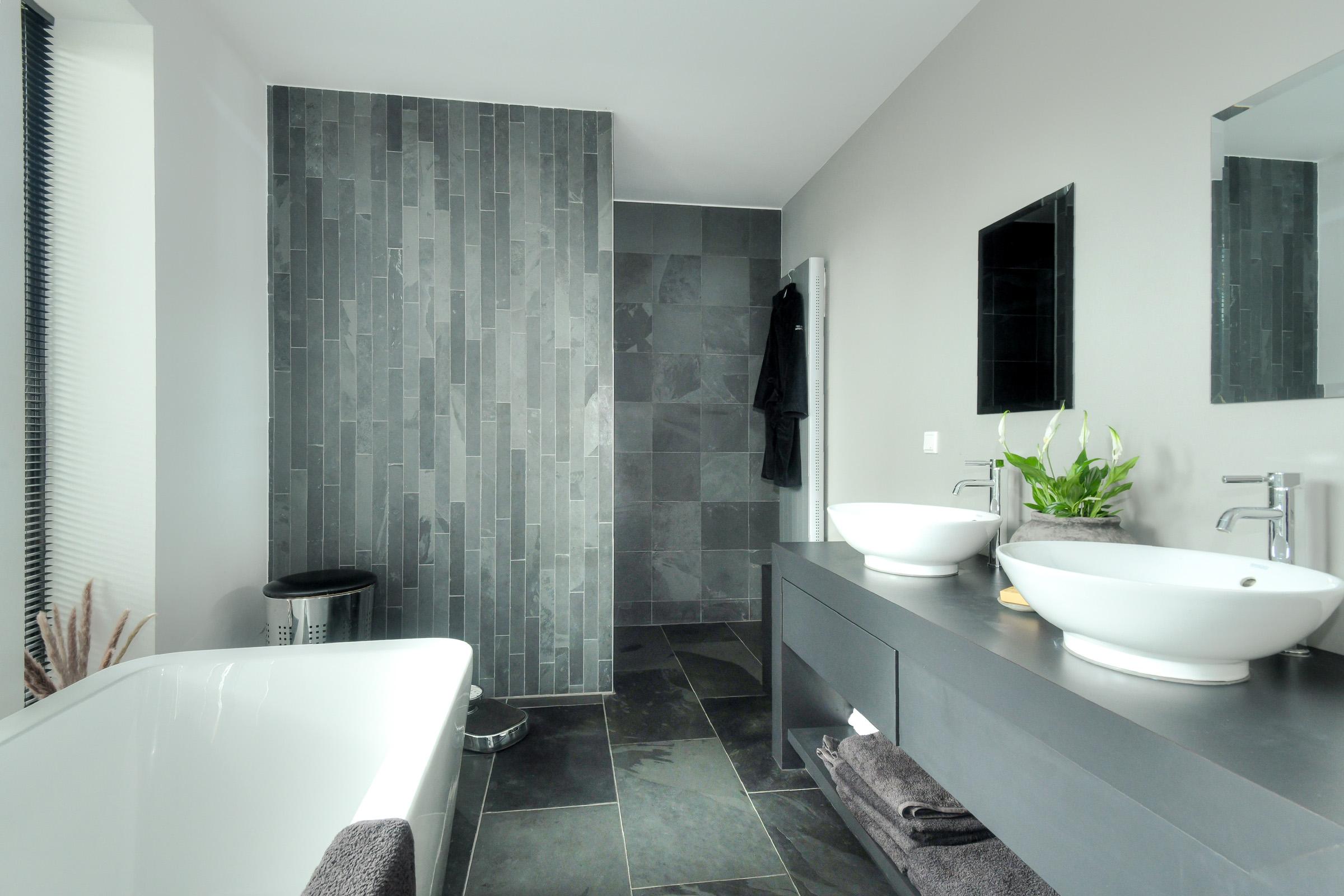 Bathroom (approx. 4.40 x 2.45 m) located at the front of the house. This bathroom includes a wide vanity with two countertop basins, a designer bathtub, and a walk-in shower with thermostatic mixer and rain/hand shower.