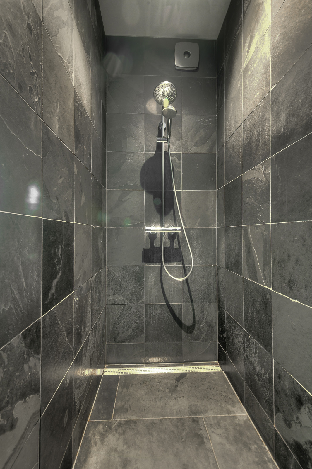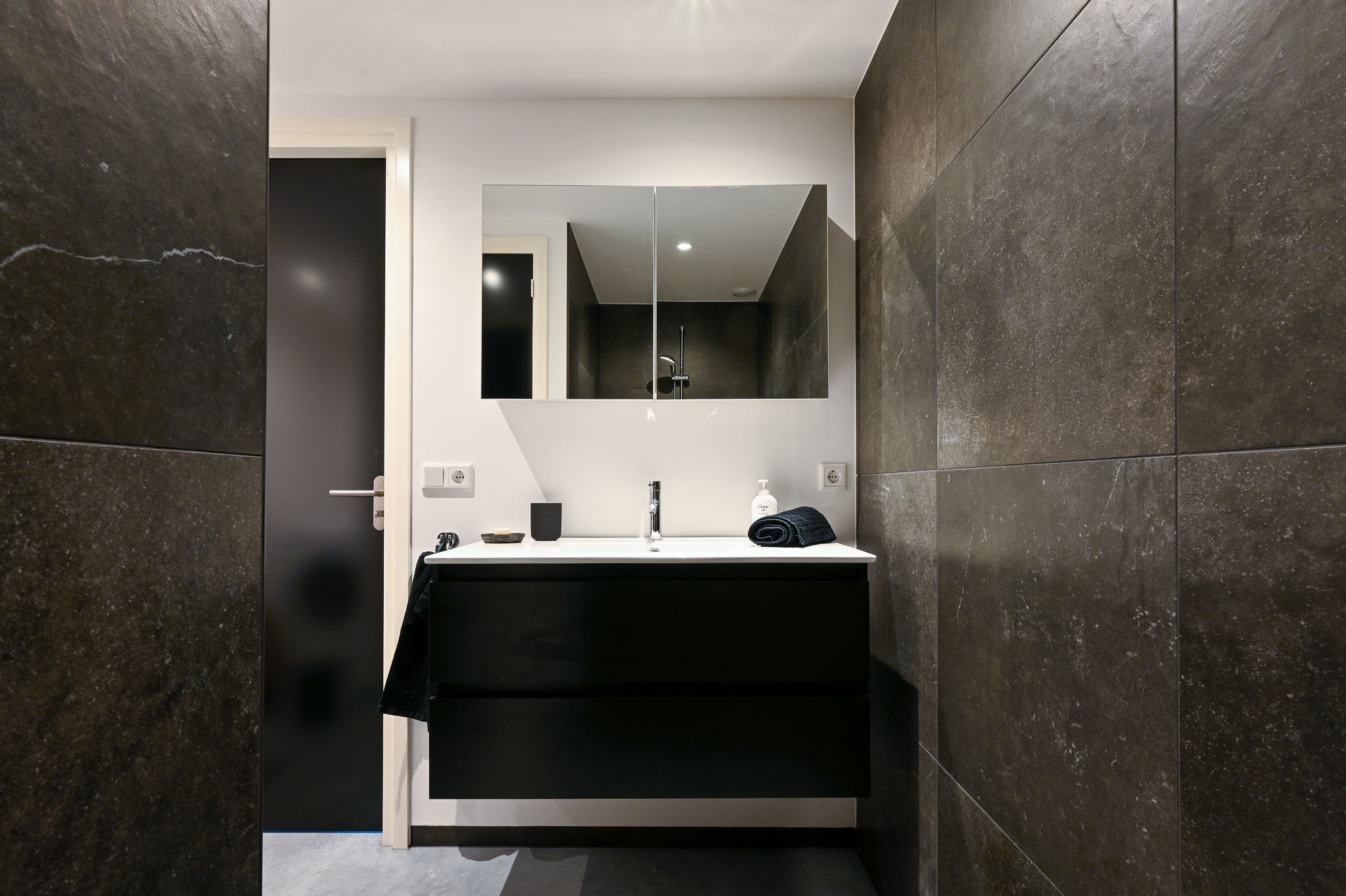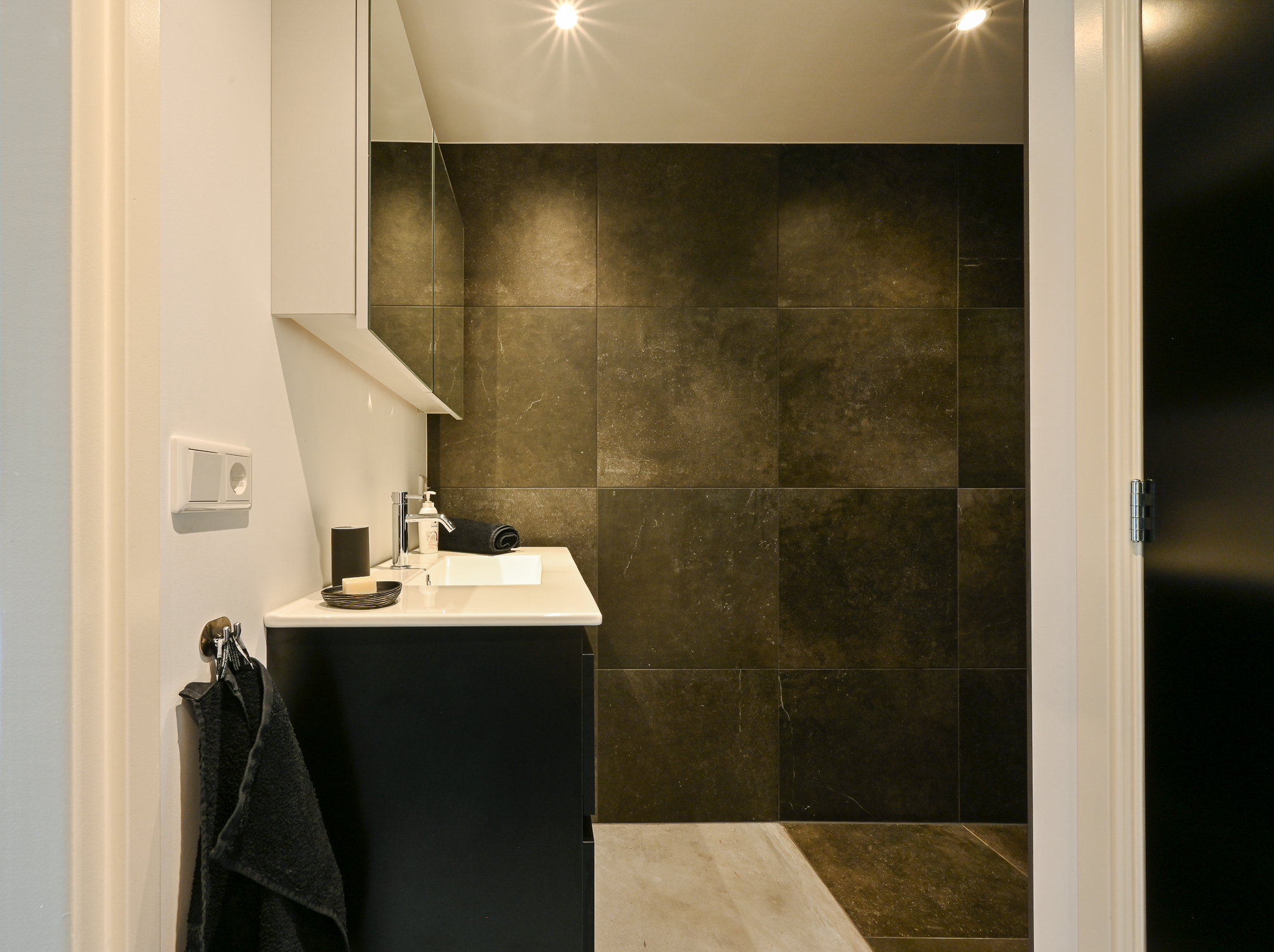 Bathroom (approx. 2.40 x 3.15 m) with walk-in shower with thermostatic controls, vanity unit, and toilet. This space also contains the connections for laundry appliances.