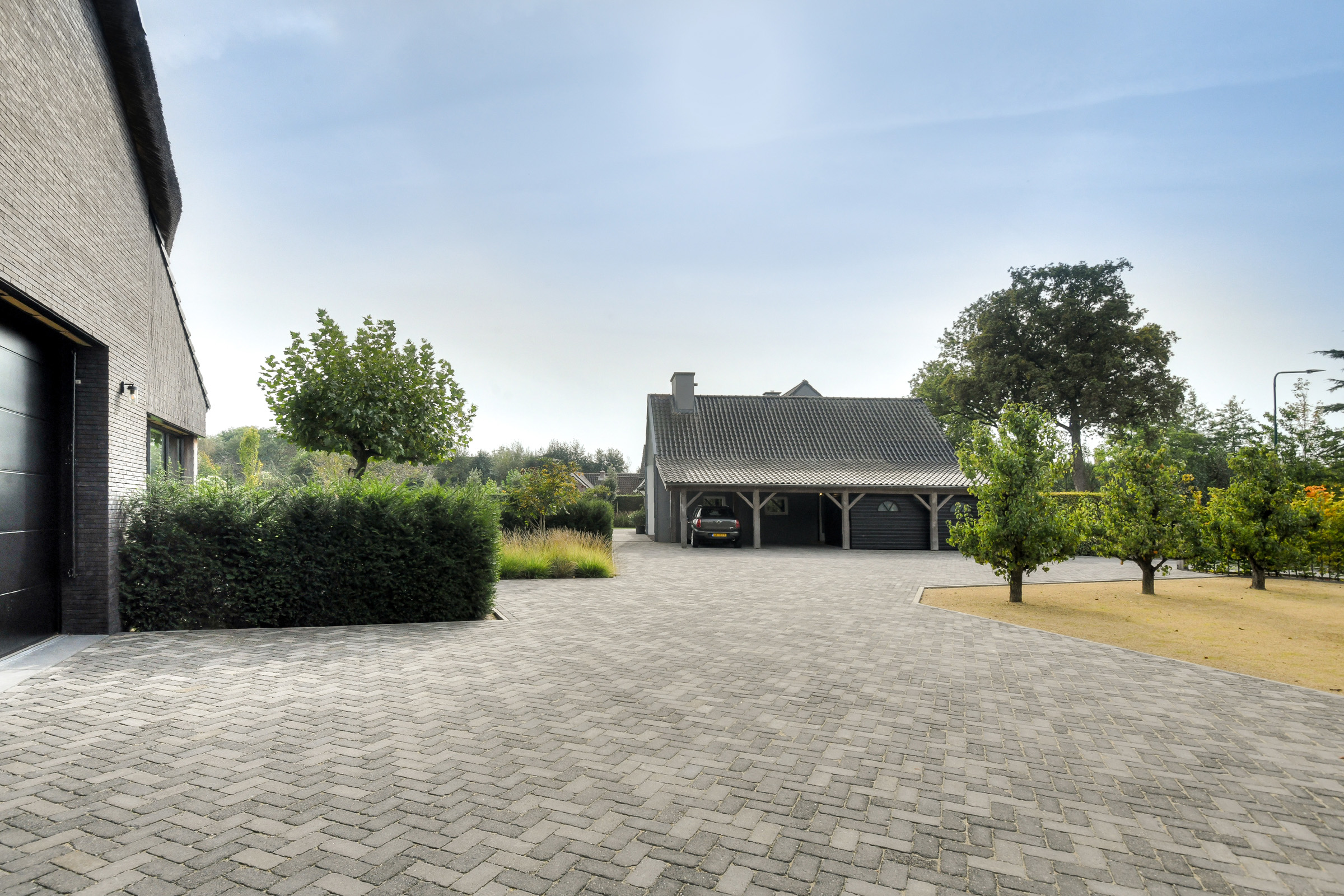 The veranda and terrace are finished with large concrete tiles. The driveway is located on the side and provides access to the premises with parking for multiple cars and access to the garage. A carport for two cars is attached to the house.