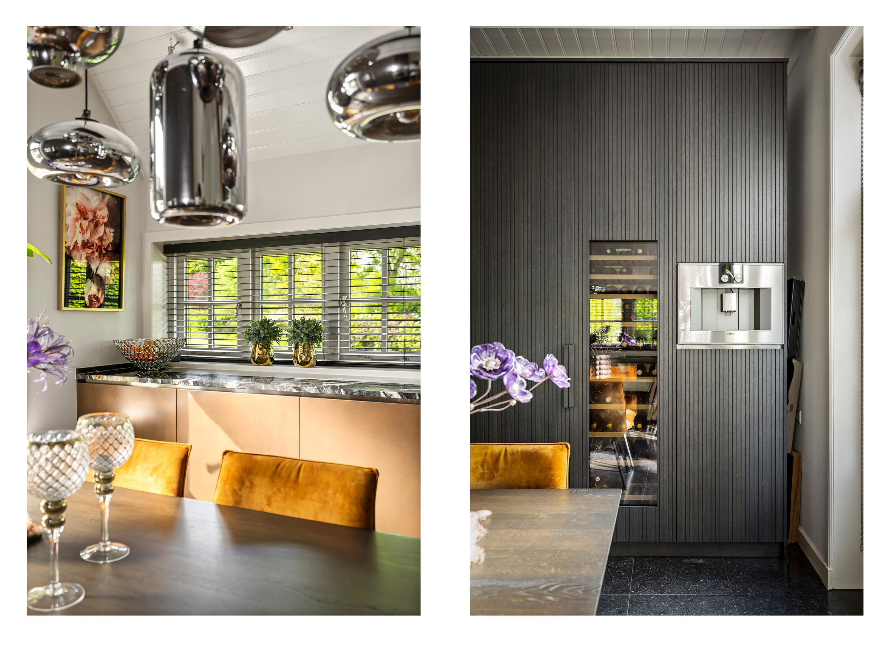 The fronts are copper-colored, which creates a beautiful interplay with the marble countertops and the sleek appliance wall. The kitchen is equipped with built-in appliances such as a dishwasher, refrigerator, and freezer. Furthermore, there is an induction hob (90 cm), a coffee machine (Gaggenau), a 4-in-1 boiling water tap (Quooker), and a generous wine climate cabinet (Liebherr).