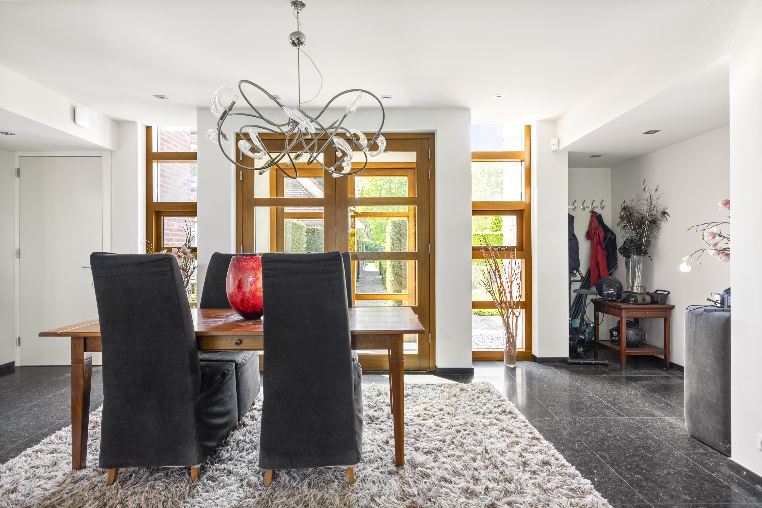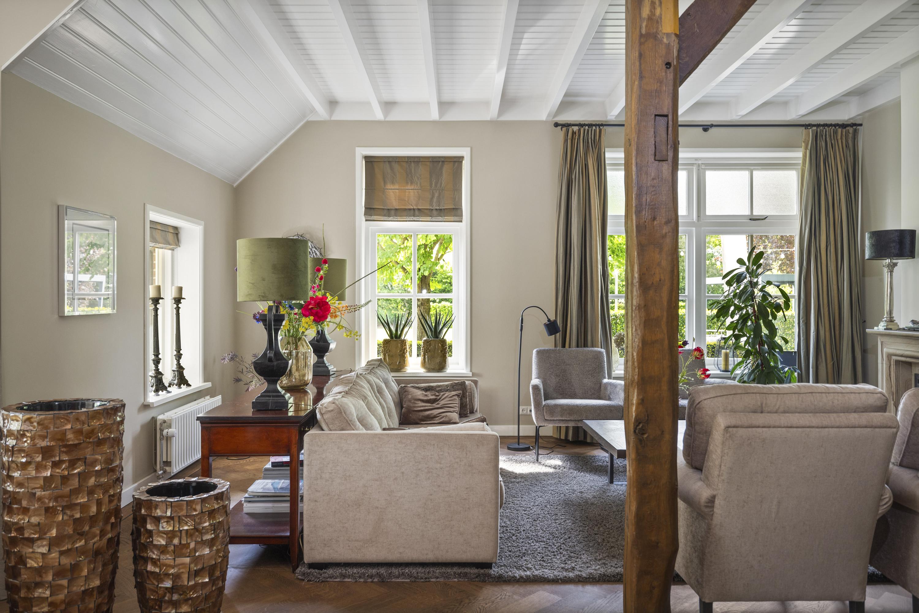 On the right is the kitchen, the beating heart of this house. The design is truly beautiful: traditional craftsmanship by Lodder Keukens from Barneveld, equipped with all modern conveniences. Every door, drawer, and function has been carefully considered. The kitchen has an L-shaped layout and is very spacious, so there is plenty of work space and room for all your guests at the large dining table.