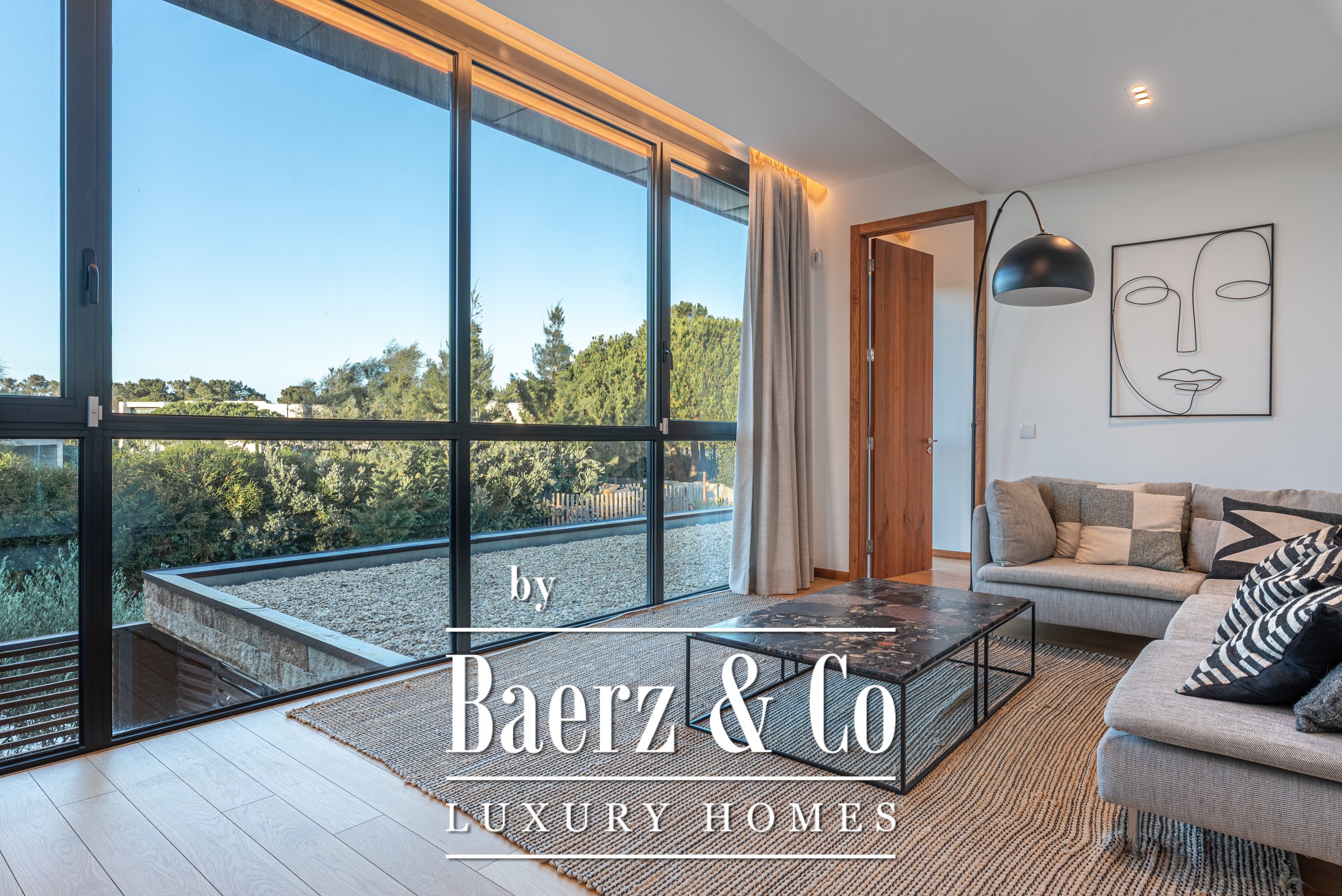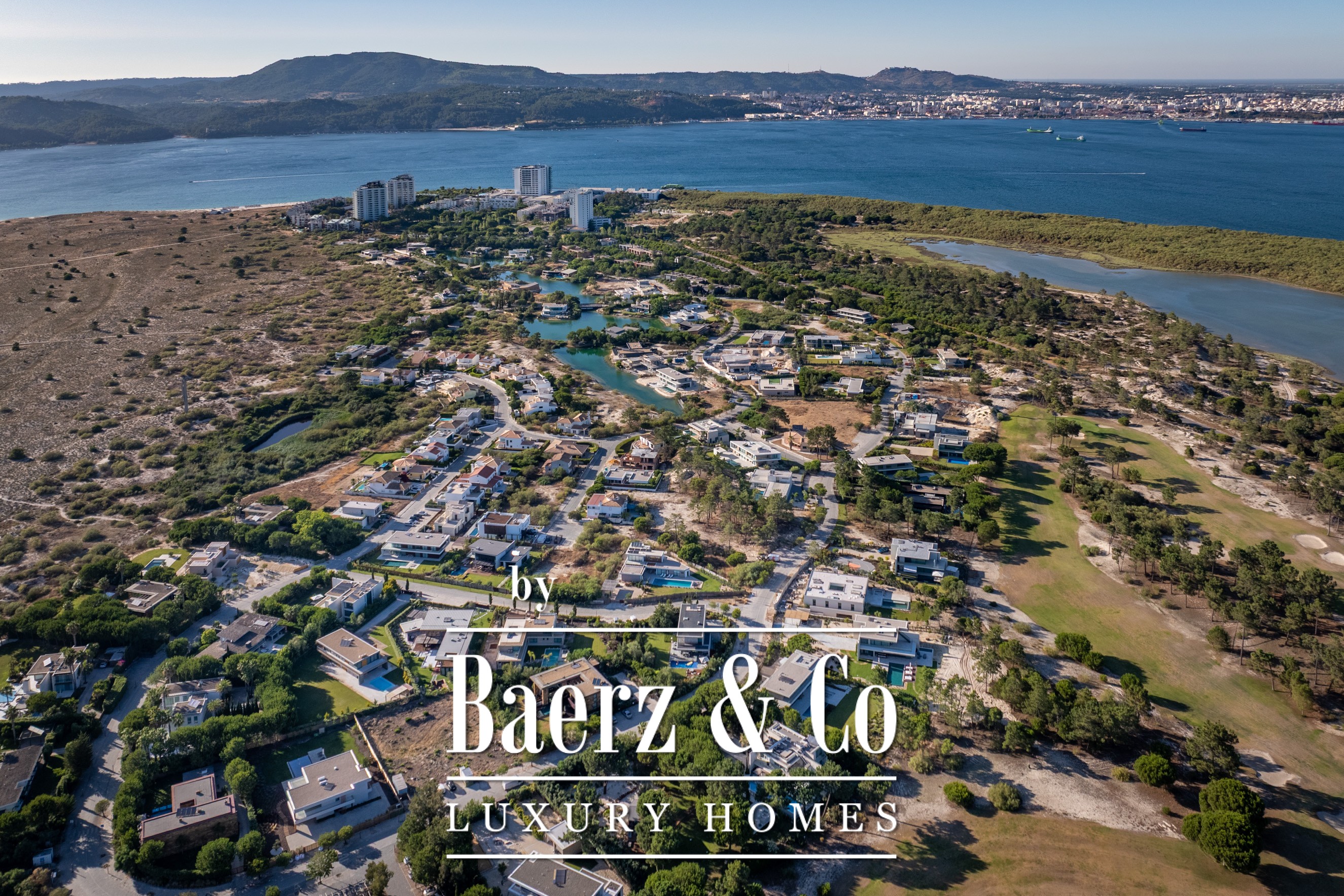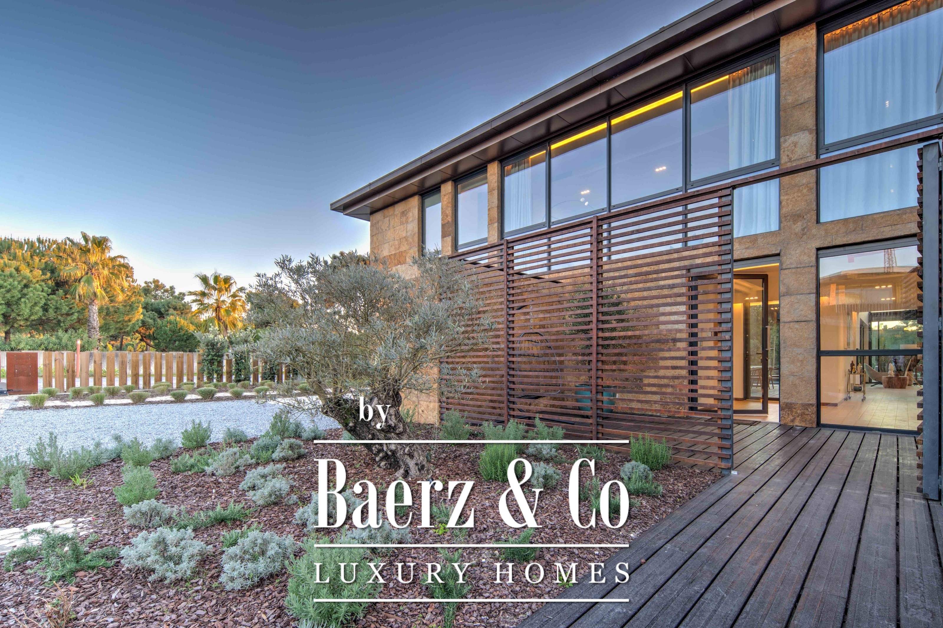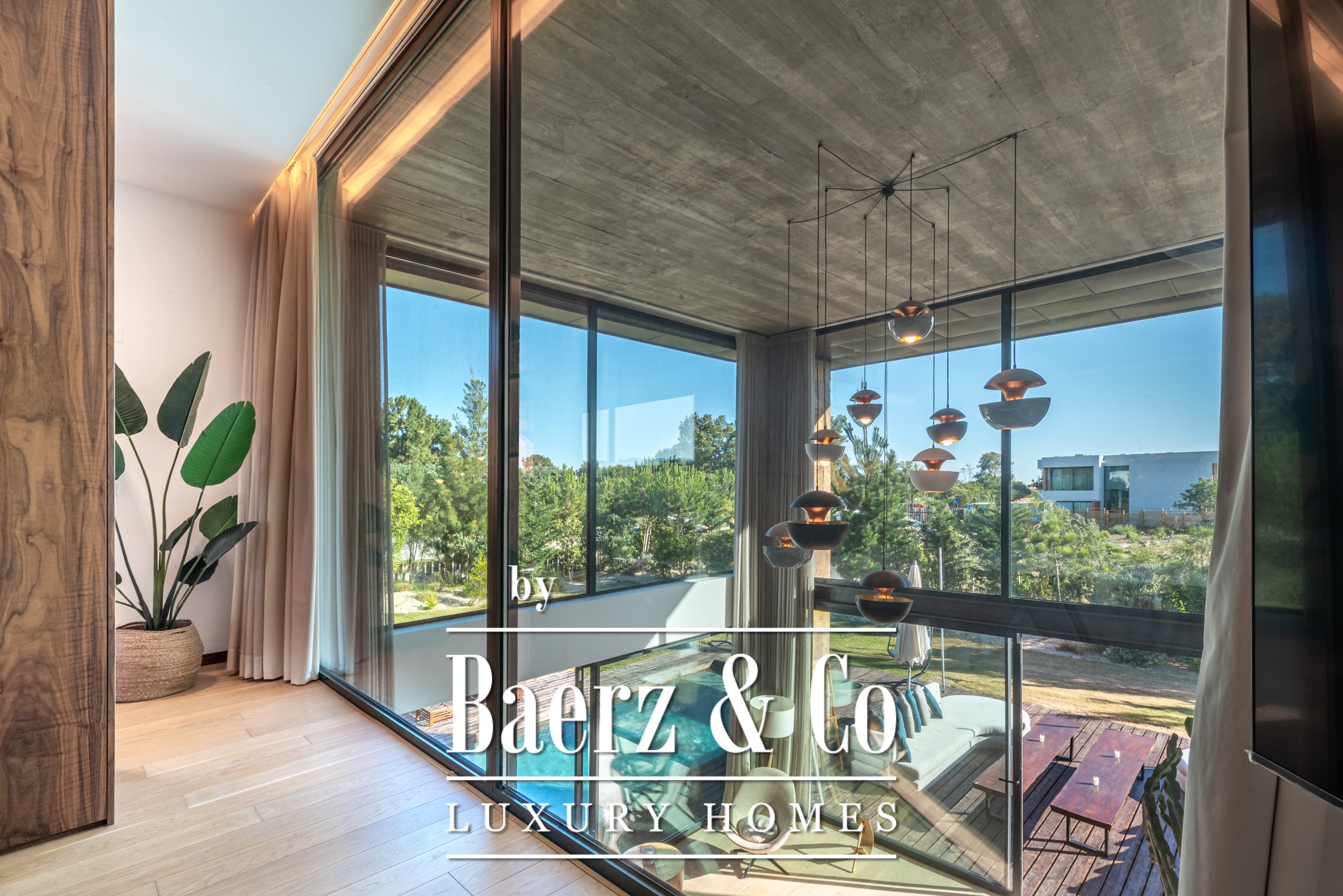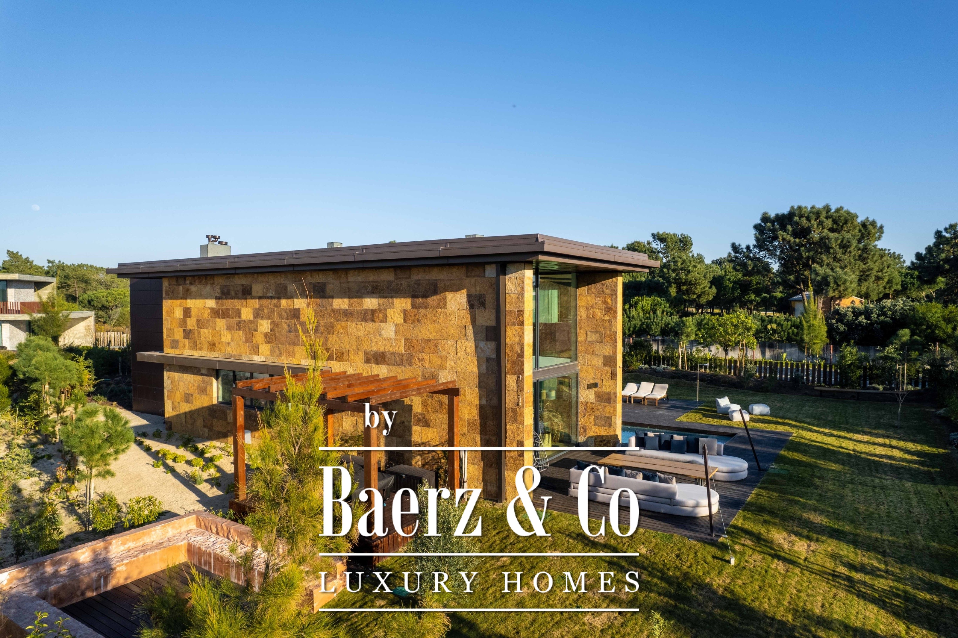 Located in exclusive Tróia Atlantic Villas near Comporta, this stunning modern villa sits moments from the Atlantic Ocean with pristine beaches just a 5-minute walk away. Only 90 minutes from Lisbon, it perfectly balances coastal tranquility with urban accessibility.The striking design features sand-coloured bricks, rich wood, and expansive glass seamlessly connecting indoors and outdoors. Floor-to-ceiling windows flood the space with natural light while showcasing sweeping garden views. An elegant wooden deck wraps around the house.Outdoor spaces shine with a sleek private pool surrounded by sun loungers, plus a handcrafted wooden dining table seating 10+ guests under warm timber beam lighting. The cozy fire pit lounge area creates intimate evening gatherings. The rooftop terrace offers breathtaking sea views—perfect for sunset drinks or stargazing.Inside, the open-plan layout maximizes natural light. The living room features velvet sofas, bold contemporary artwork, and custom lighting. The dining area includes a central island and spacious table for shared meals.Four beautifully designed suites each have king-size beds, with three