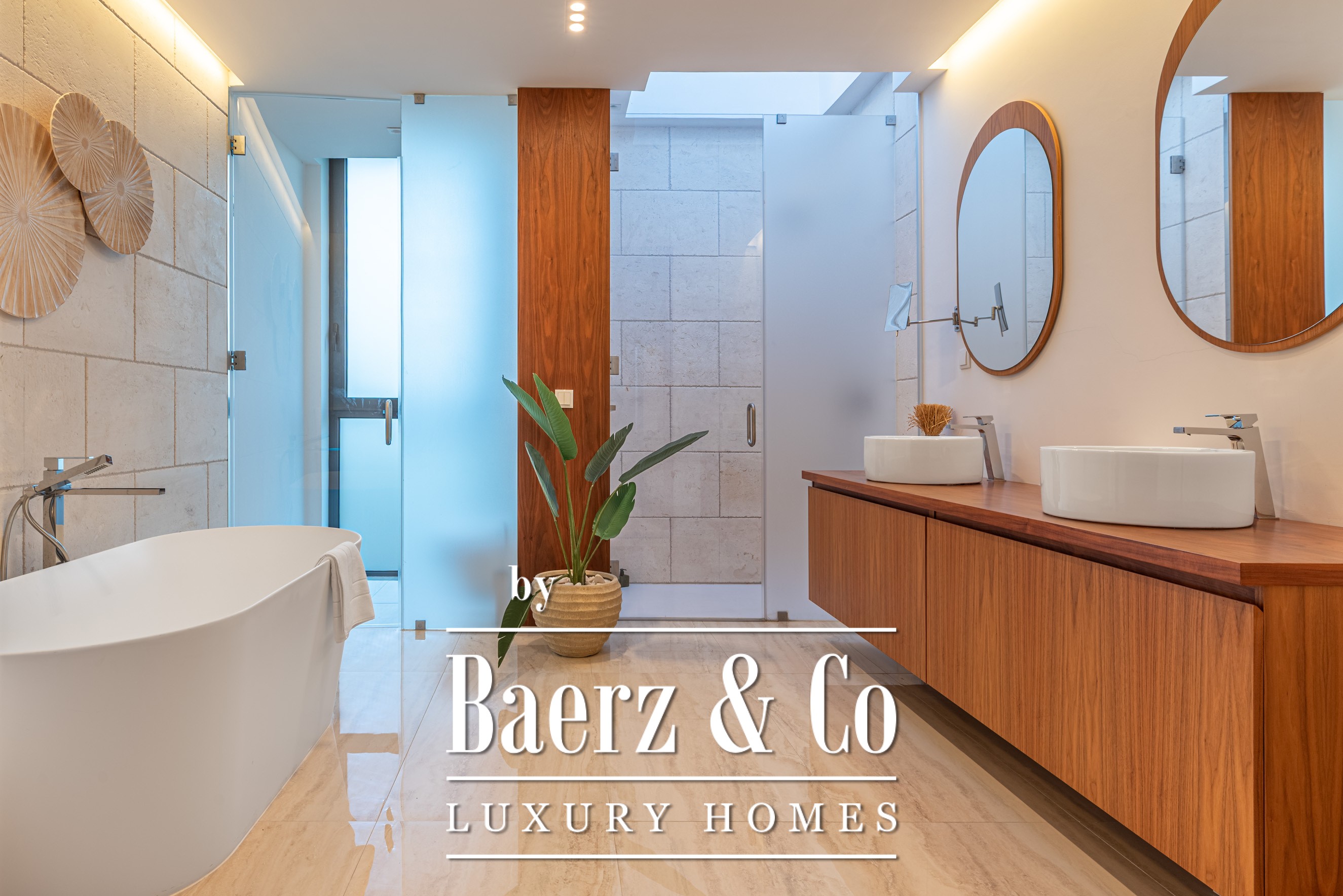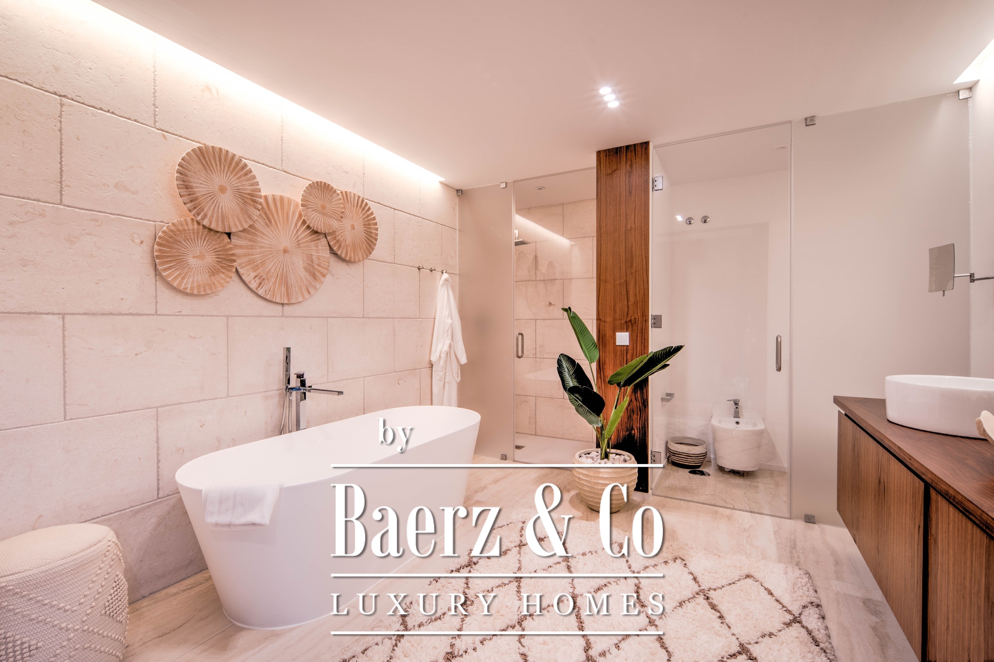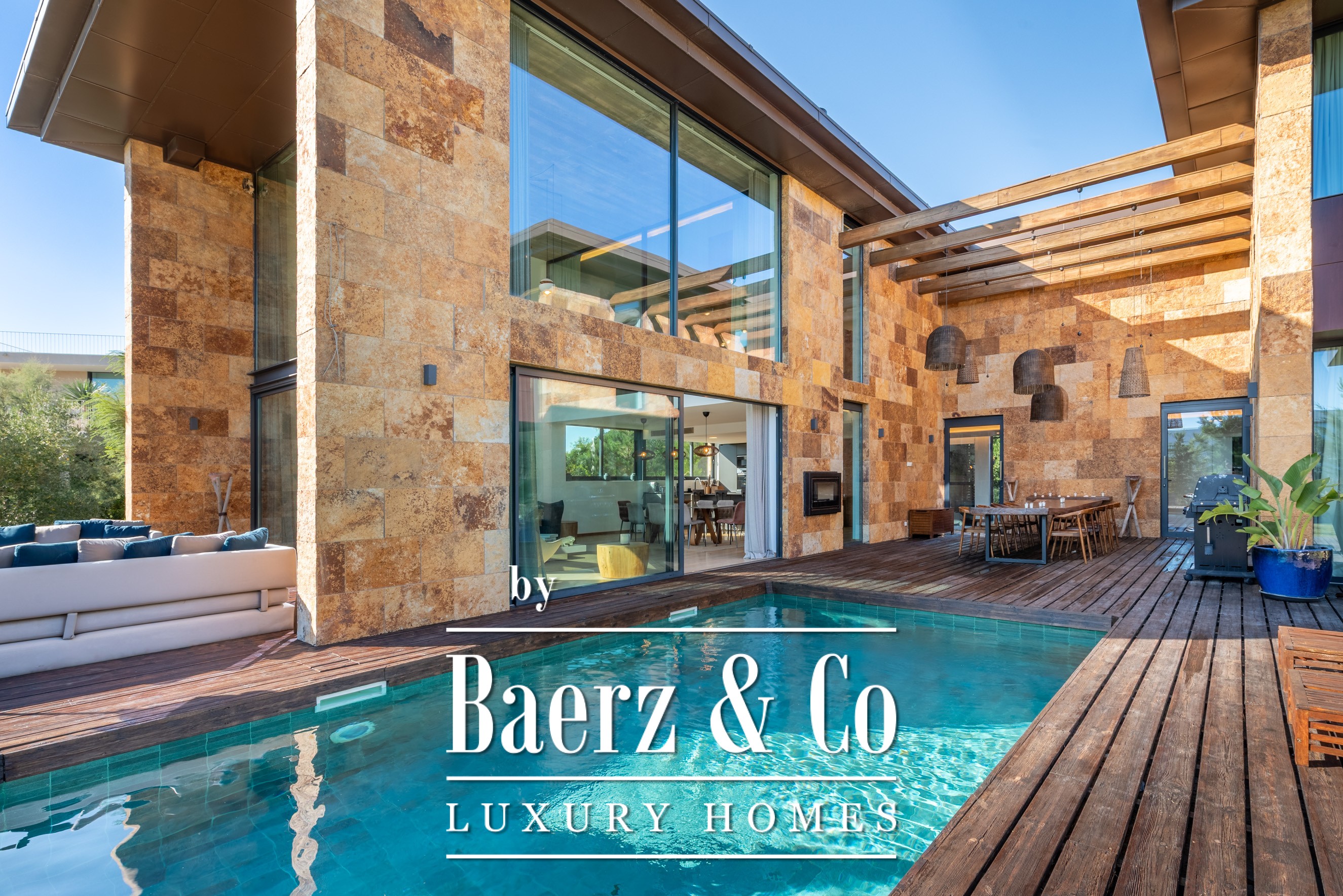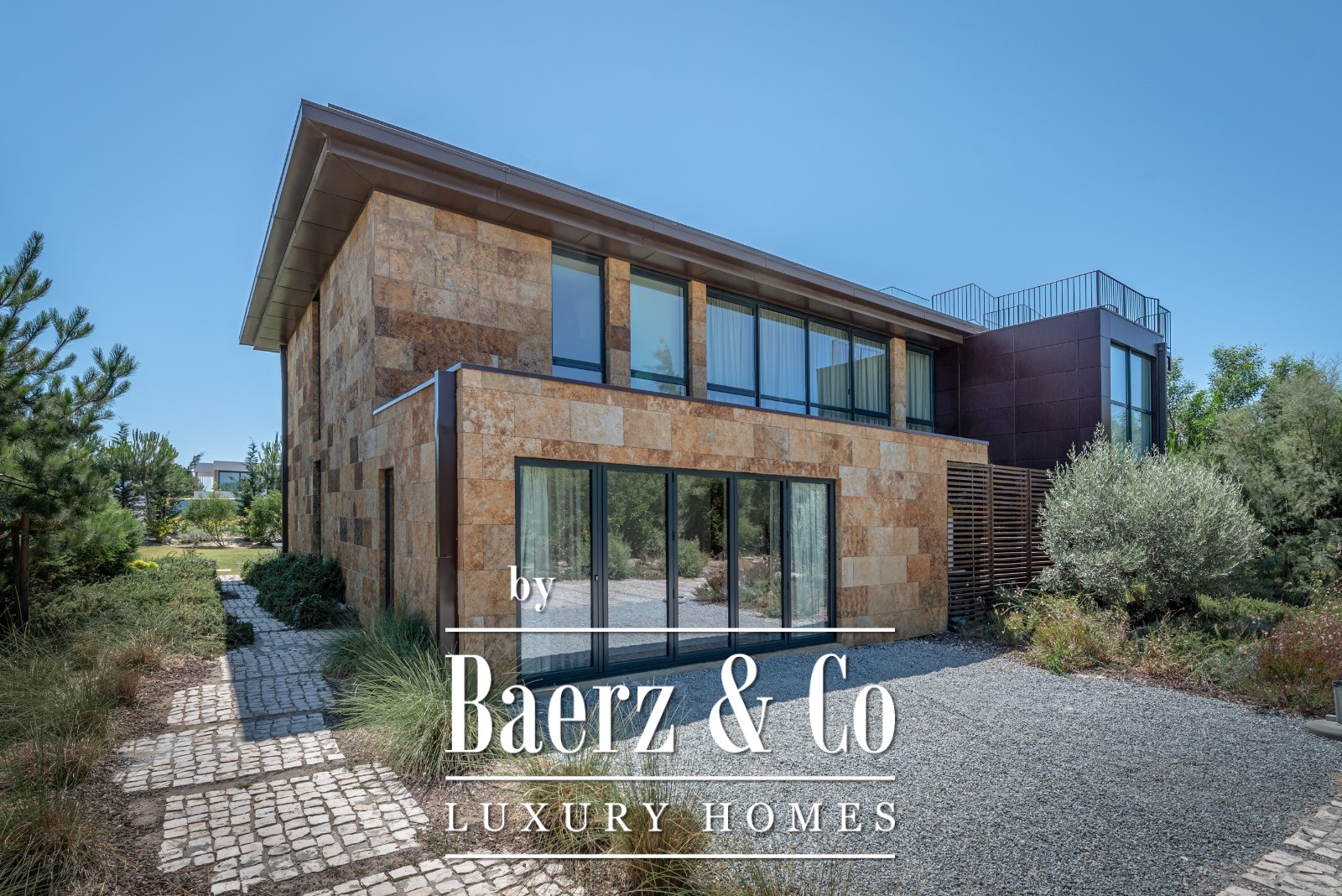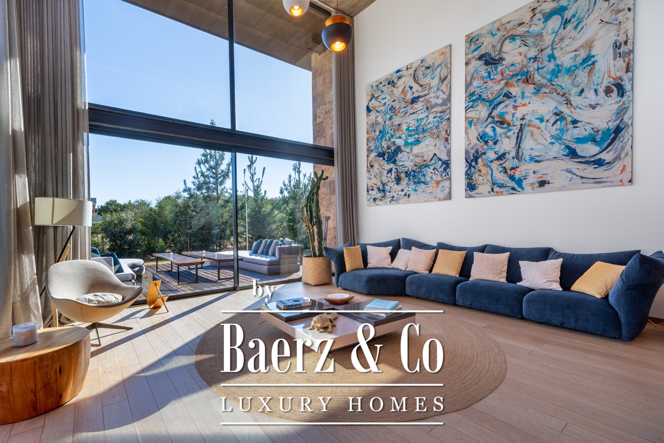 Located in exclusive Tróia Atlantic Villas near Comporta, this stunning modern villa sits moments from the Atlantic Ocean with pristine beaches just a 5-minute walk away. Only 90 minutes from Lisbon, it perfectly balances coastal tranquility with urban accessibility.The striking design features sand-coloured bricks, rich wood, and expansive glass seamlessly connecting indoors and outdoors. Floor-to-ceiling windows flood the space with natural light while showcasing sweeping garden views. An elegant wooden deck wraps around the house.Outdoor spaces shine with a sleek private pool surrounded by sun loungers, plus a handcrafted wooden dining table seating 10+ guests under warm timber beam lighting. The cozy fire pit lounge area creates intimate evening gatherings. The rooftop terrace offers breathtaking sea views—perfect for sunset drinks or stargazing.Inside, the open-plan layout maximizes natural light. The living room features velvet sofas, bold contemporary artwork, and custom lighting. The dining area includes a central island and spacious table for shared meals.Four beautifully designed suites each have king-size beds, with three
