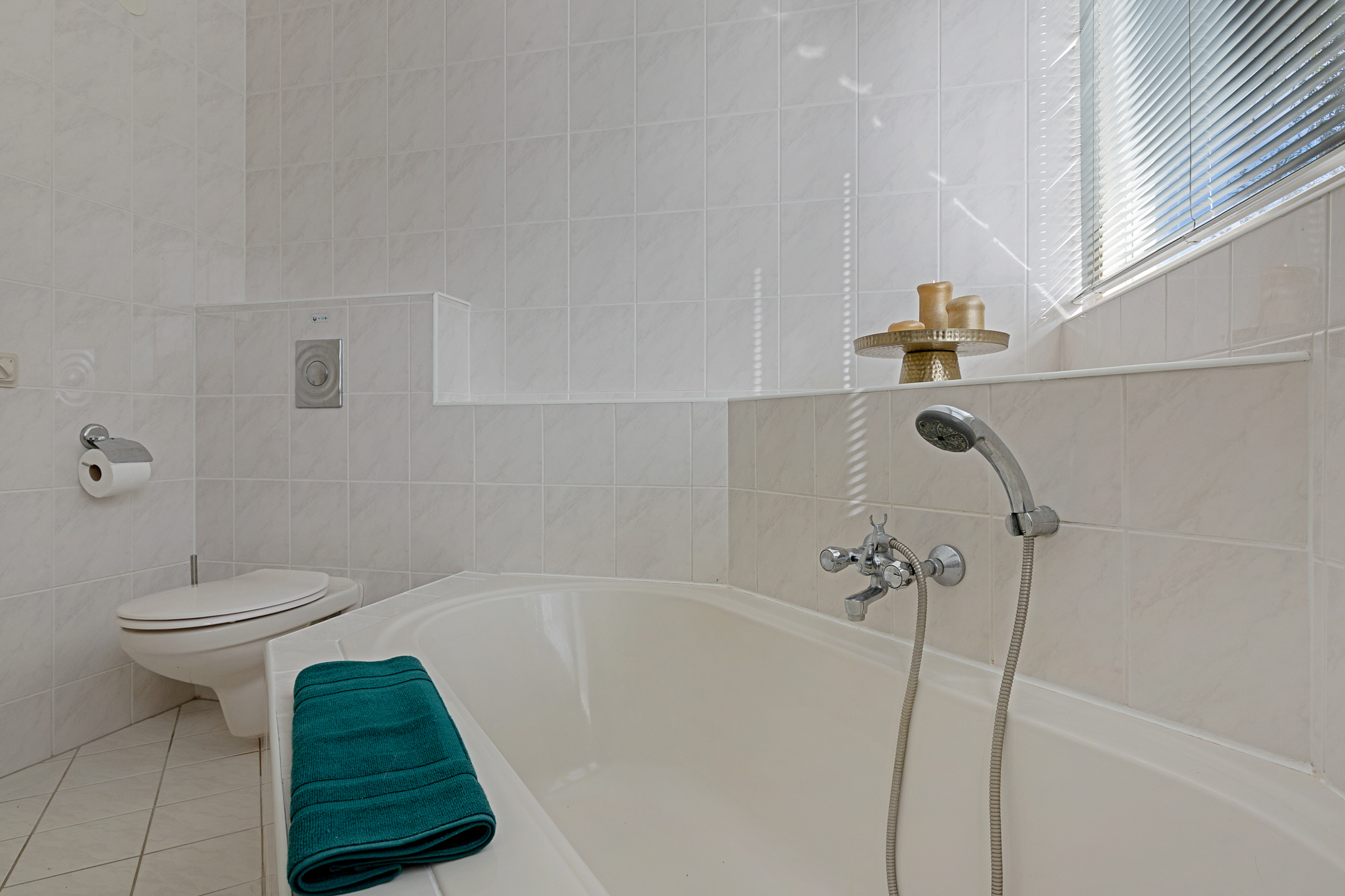 The bathroom, in a neutral colour scheme, is enhanced by a large dormer window, and offers a bathtub, shower, toilet, and double washbasins. The large windows here also provide beautiful garden and water views.