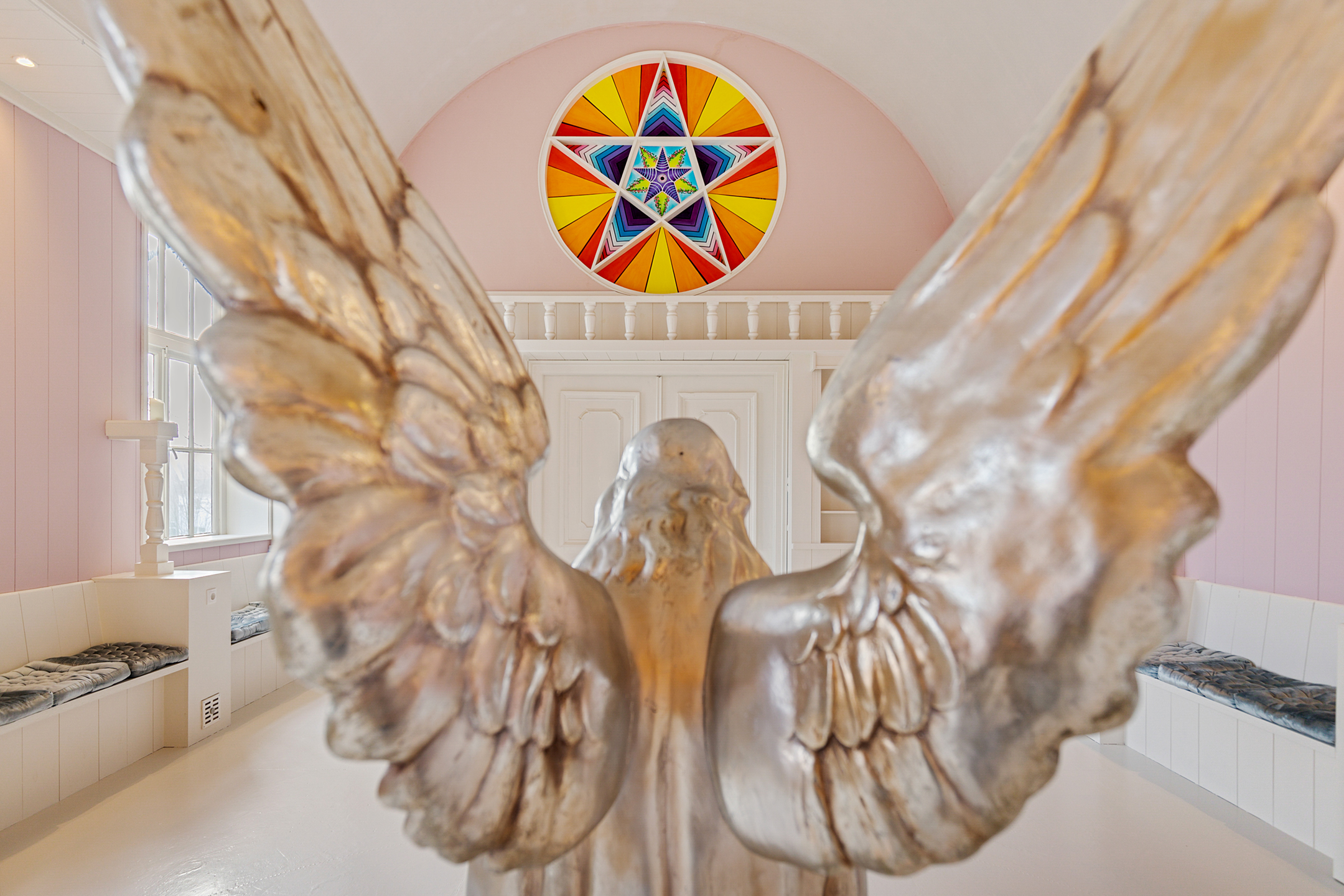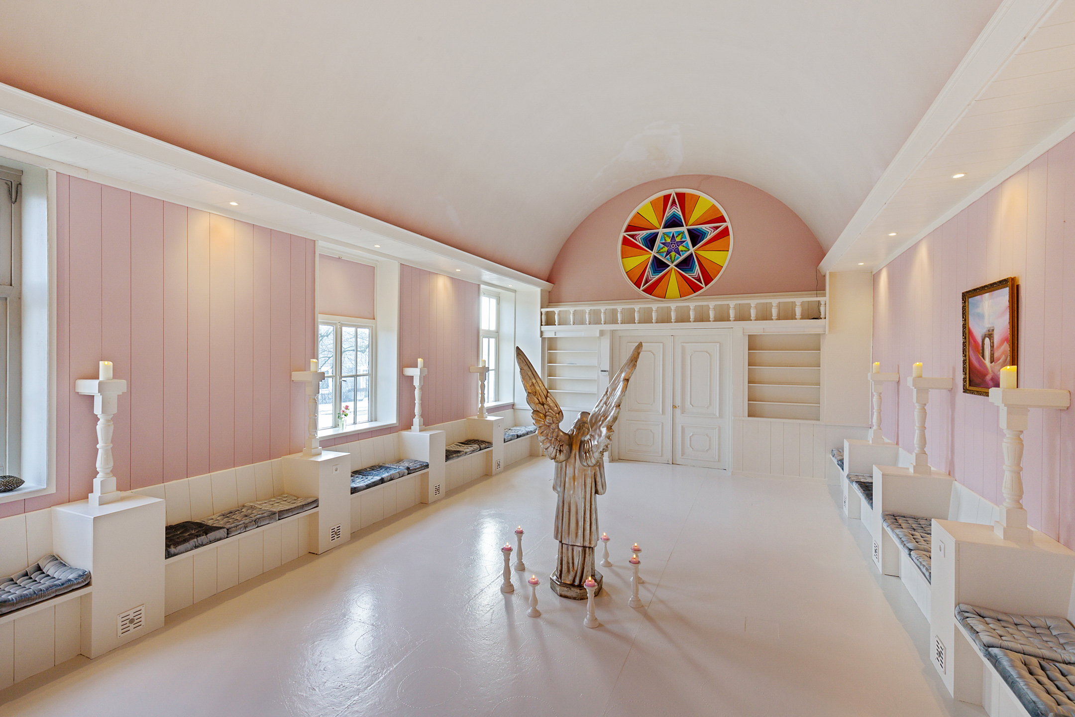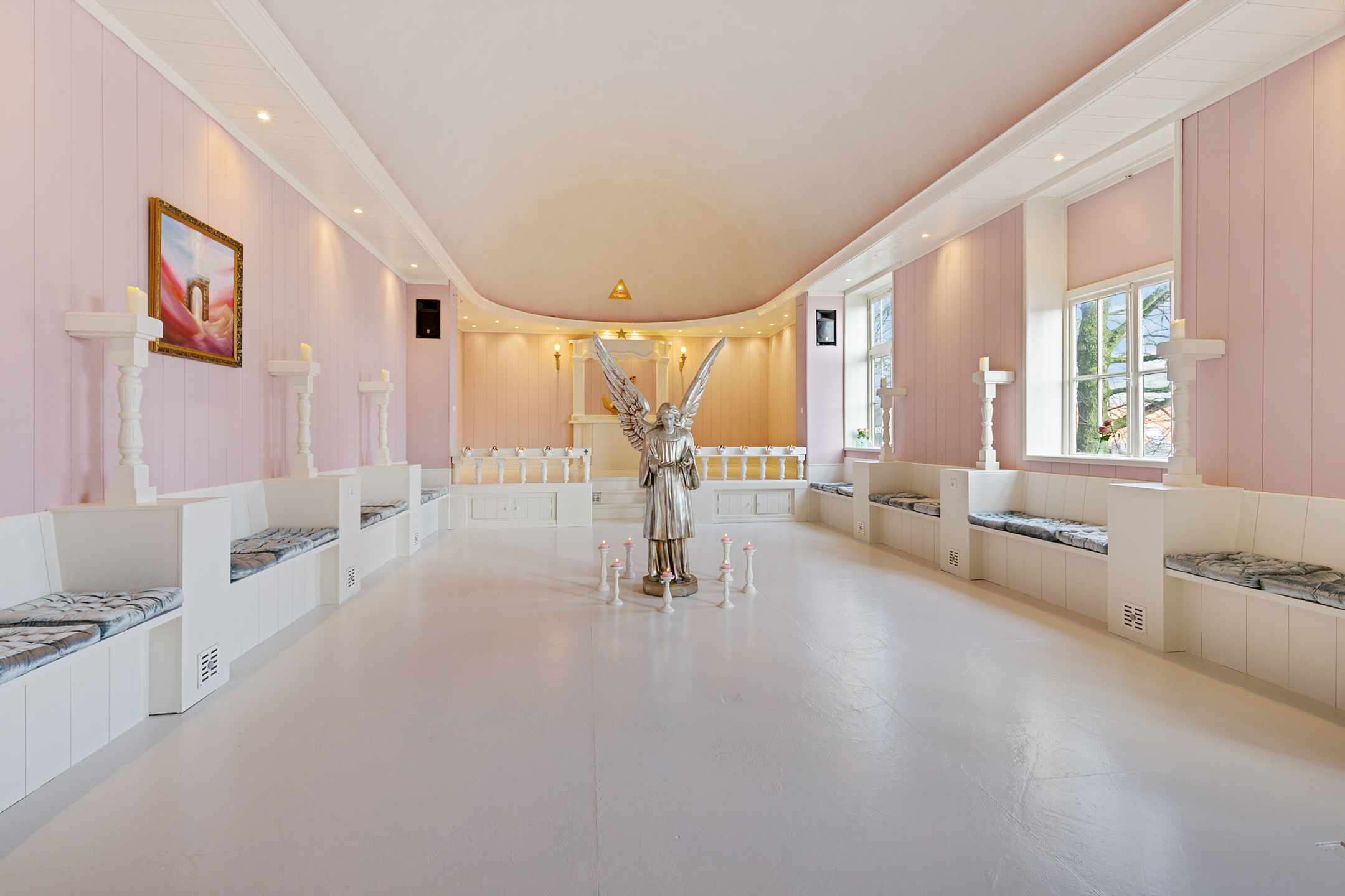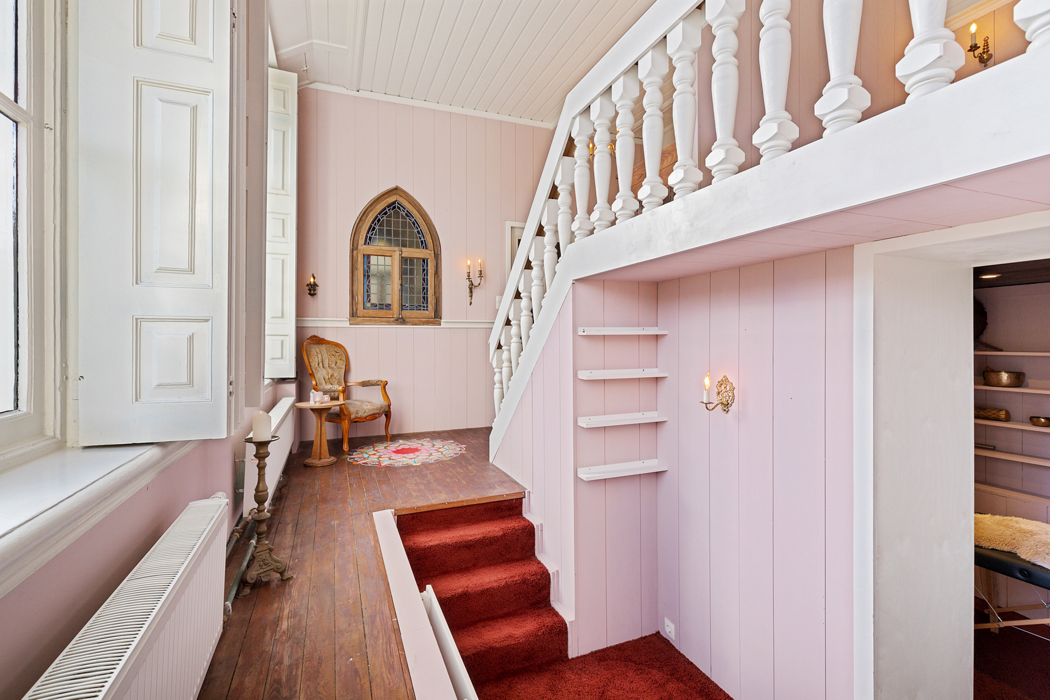 The rear room now a practice space is playfully arranged with a mezzanine and a treatment room below. From here there is access to the chapel, a transitional space with an original decorative niche in the side wall.