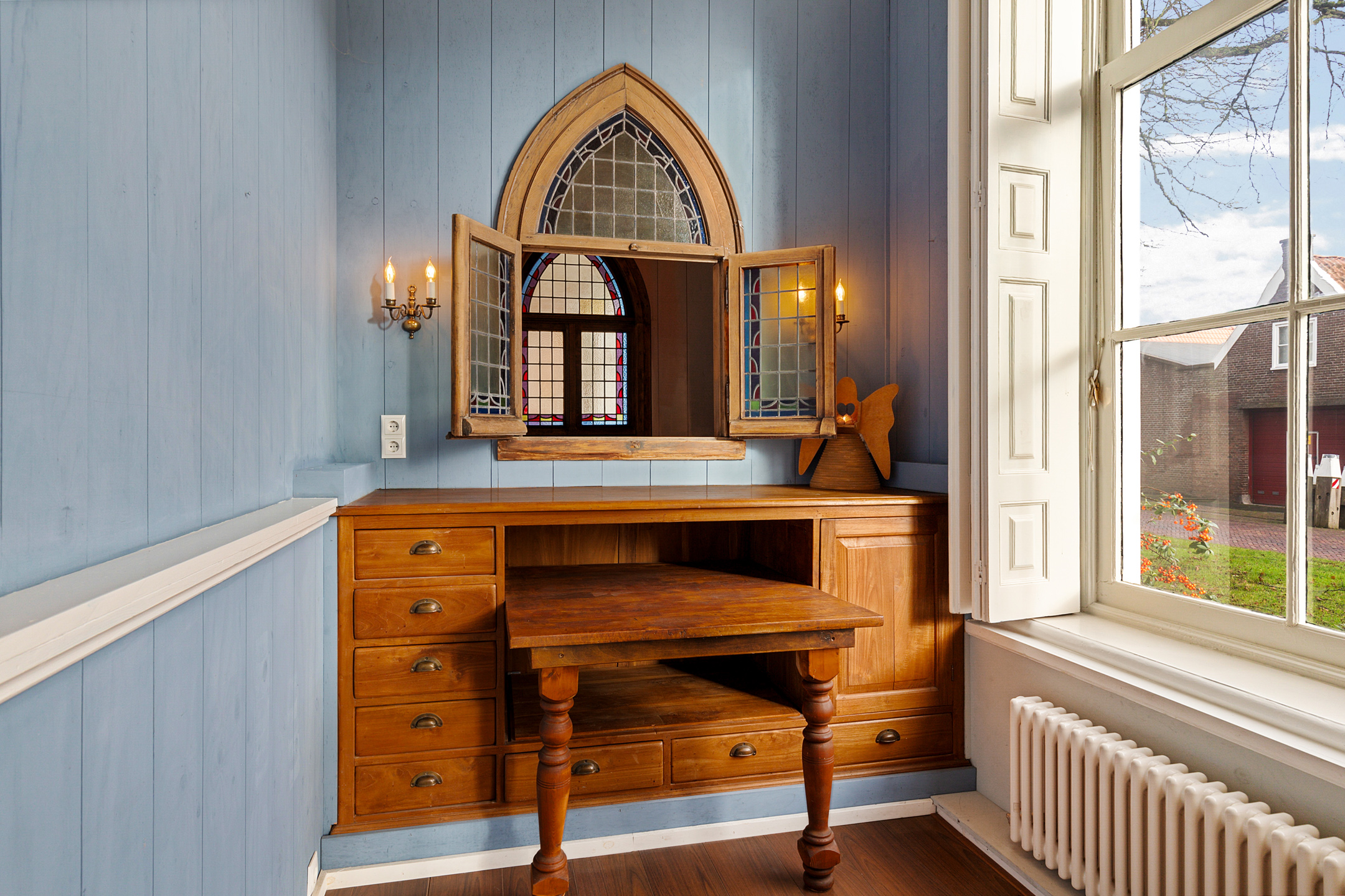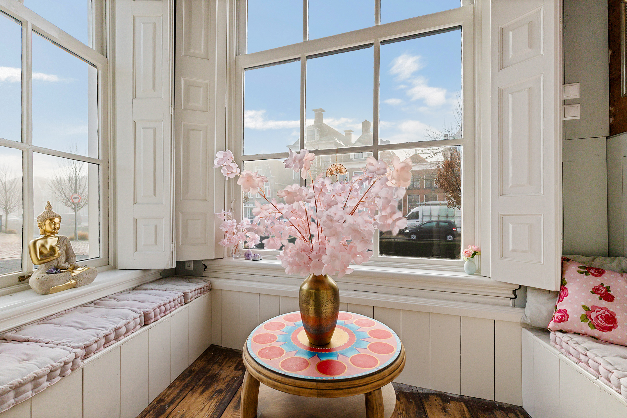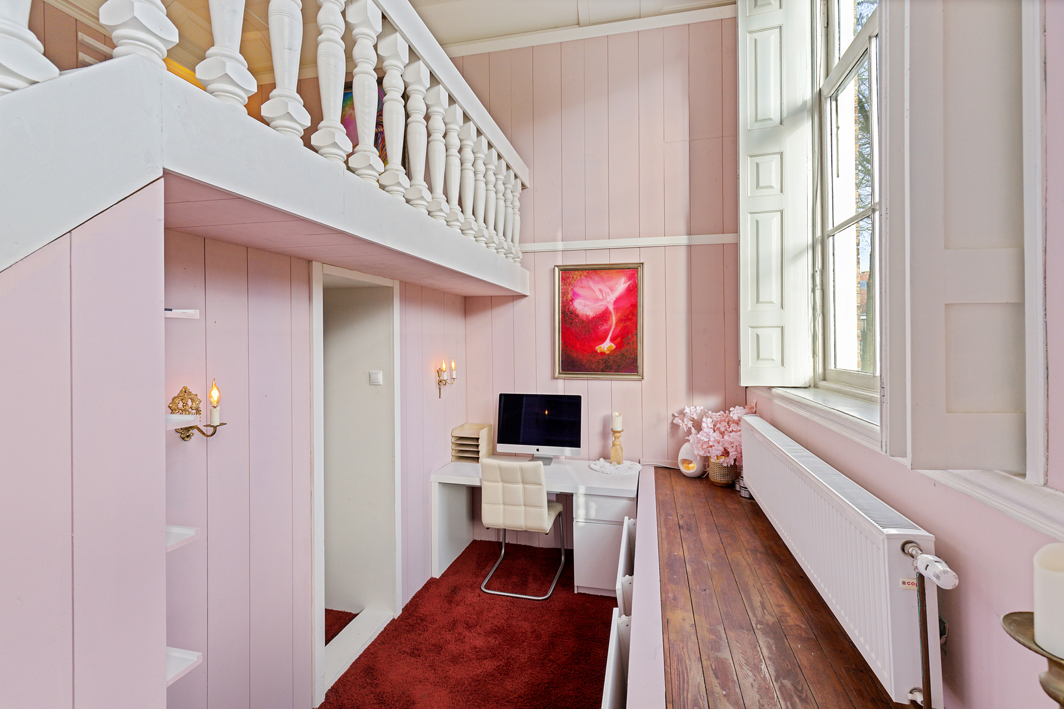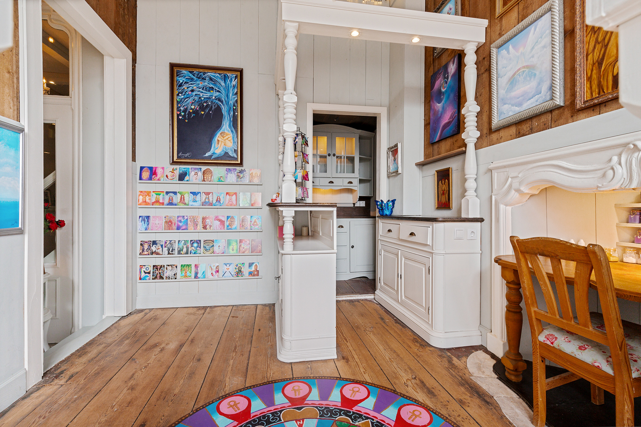 The front room currently used as a gallery shop enjoys a beautiful view of the canal through its corner windows.
