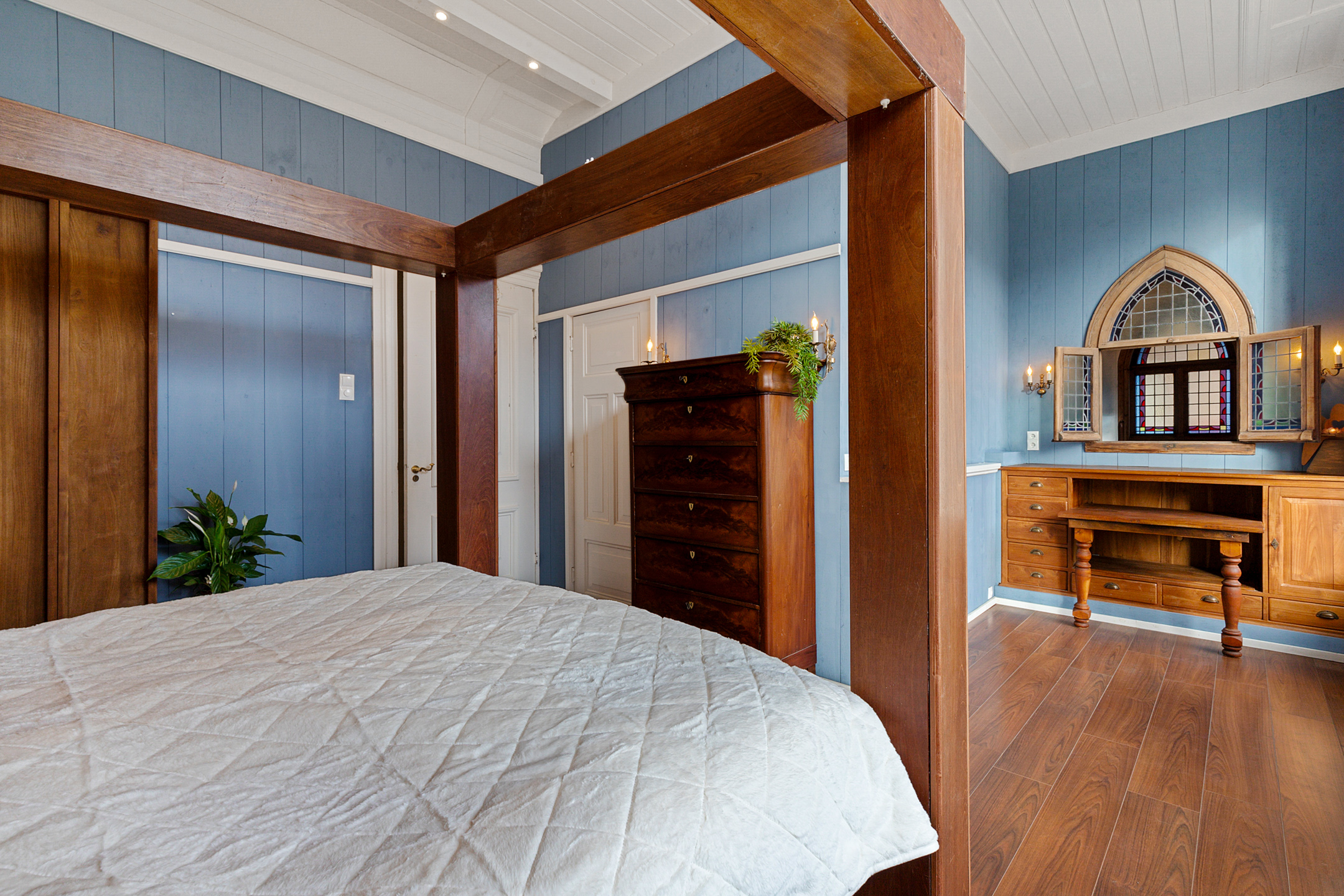 The middle room arranged as a bedroom features an ensuite dressing room, washbasin and tall windows allowing for a remarkable play of light.