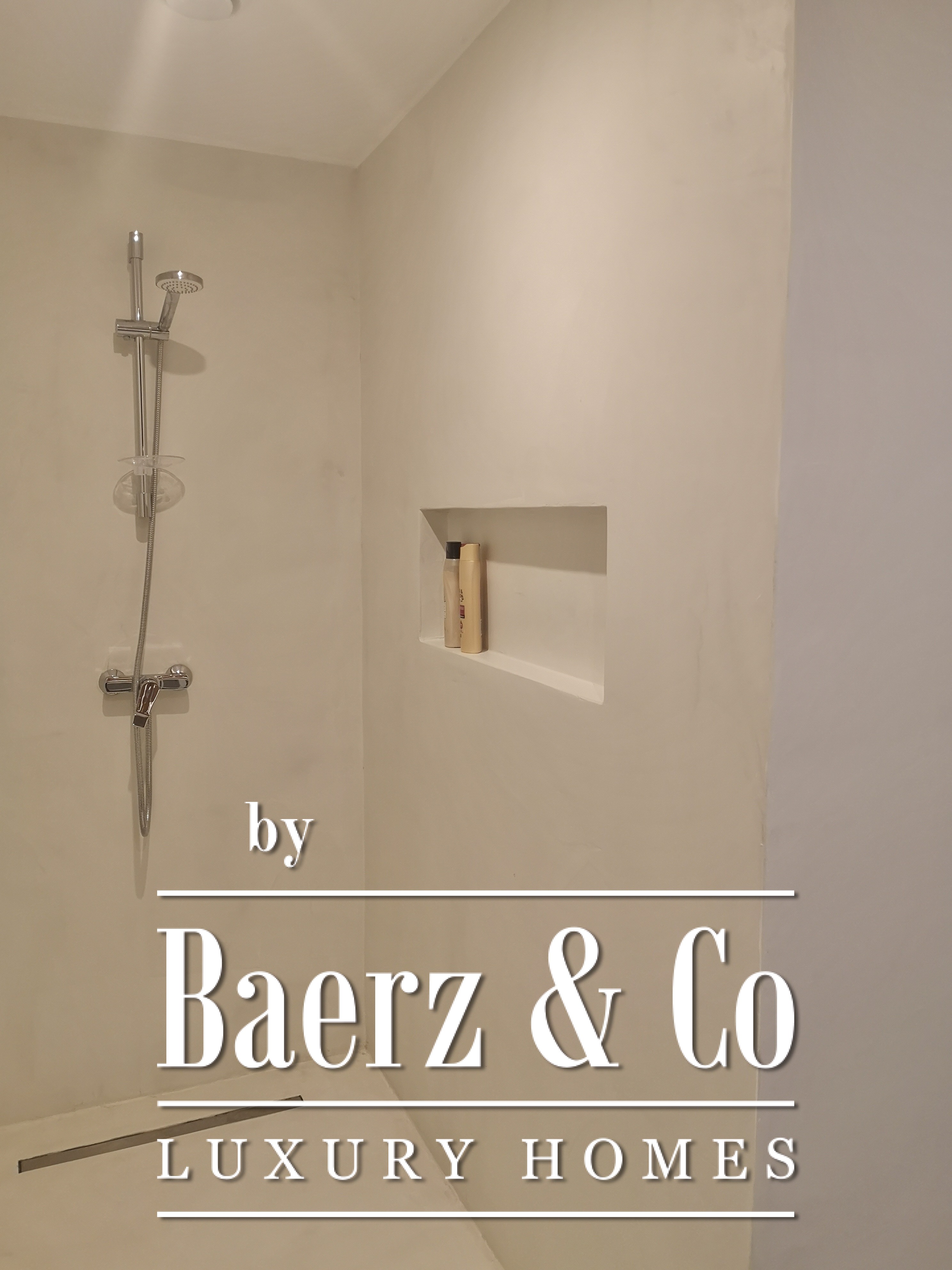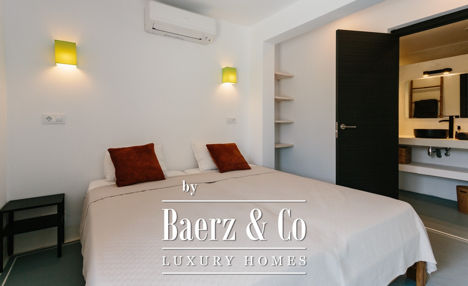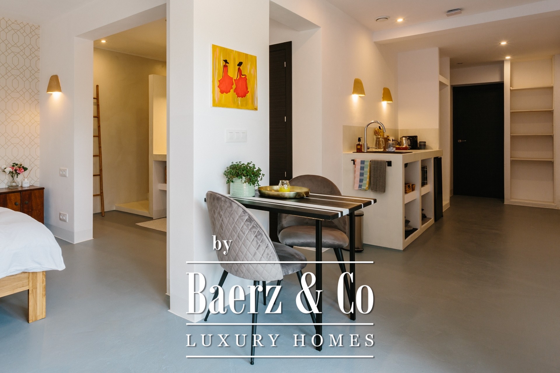 A staircase leads to the lower level of the property, where the 4 independent studio apartments are located — each designed to a high standard. All offer a private kitchenette, an en-suite bathroom and access to individual terraces that connect seamlessly to the landscaped garden.