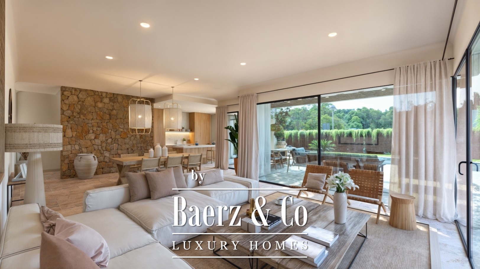 The thoughtful layout centers on open spaces, featuring an airy kitchen, bright living room, and expansive windows that offer seamless transitions from inside to out. Three double bedrooms all have en suite bathrooms, including a dressing area, with a guest toilet for added convenience. A private pool of 36 m², sun drenched terraces, and a 33 m² pergola invite quiet mornings and leisurely evenings, reflecting the pleasure of privacy and outdoor living.
