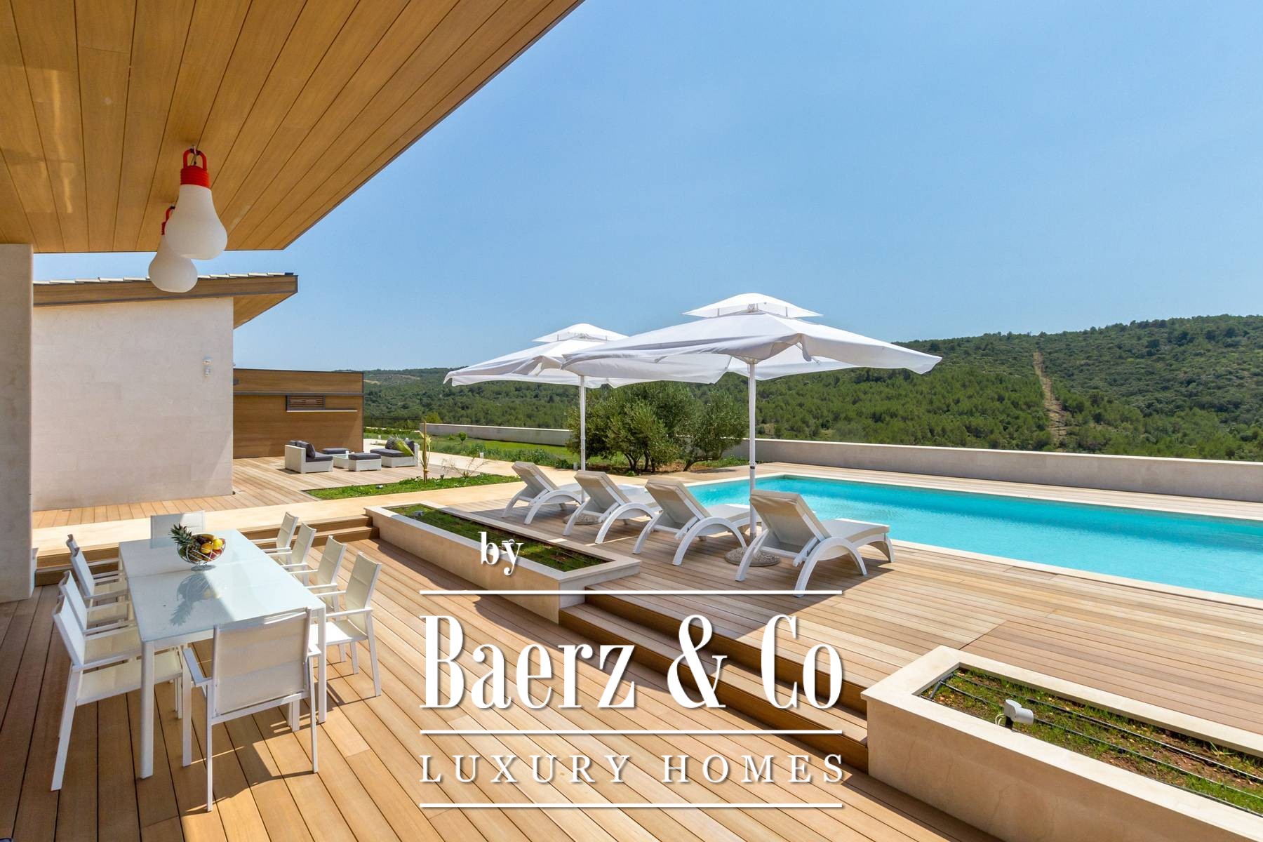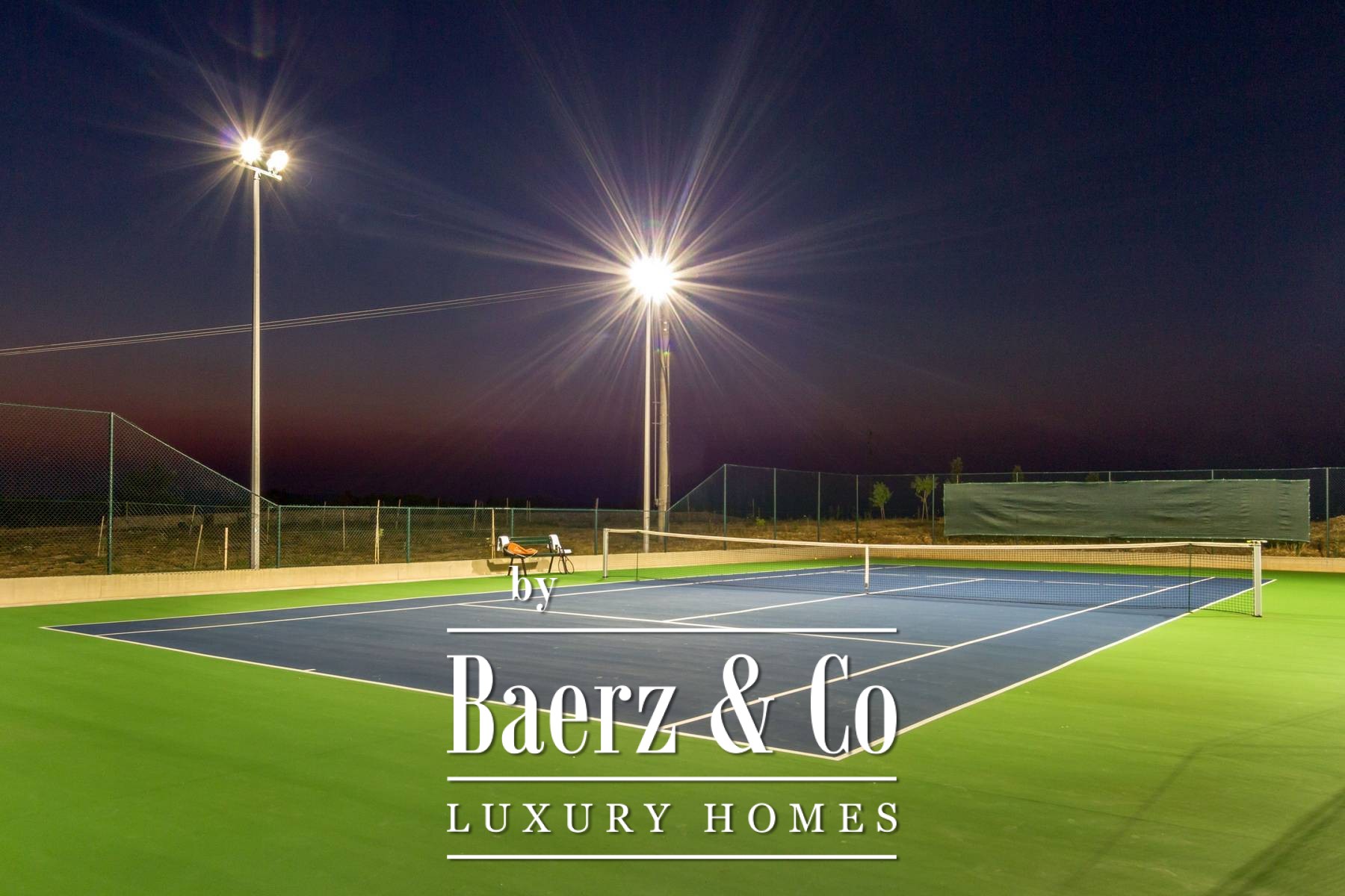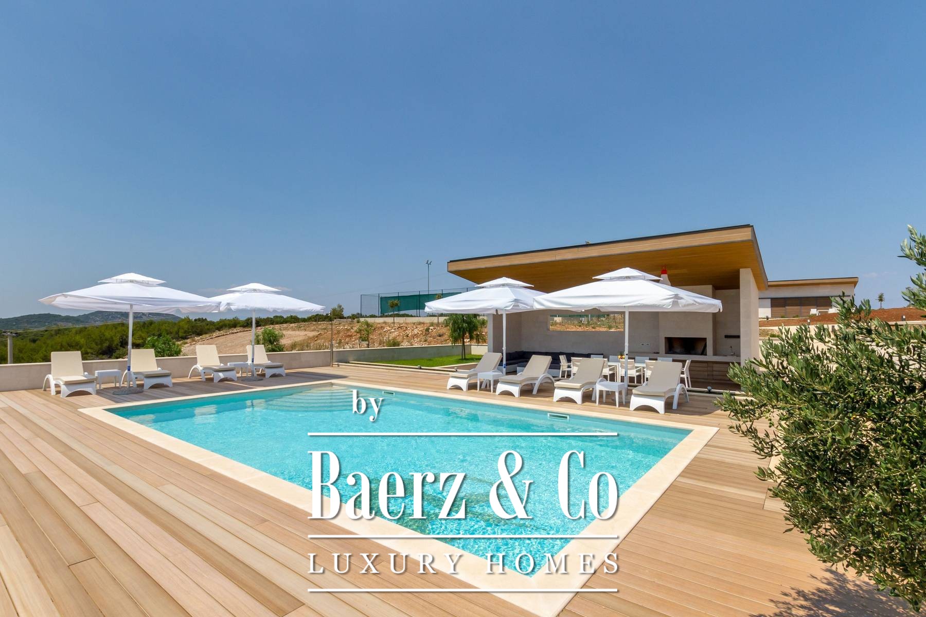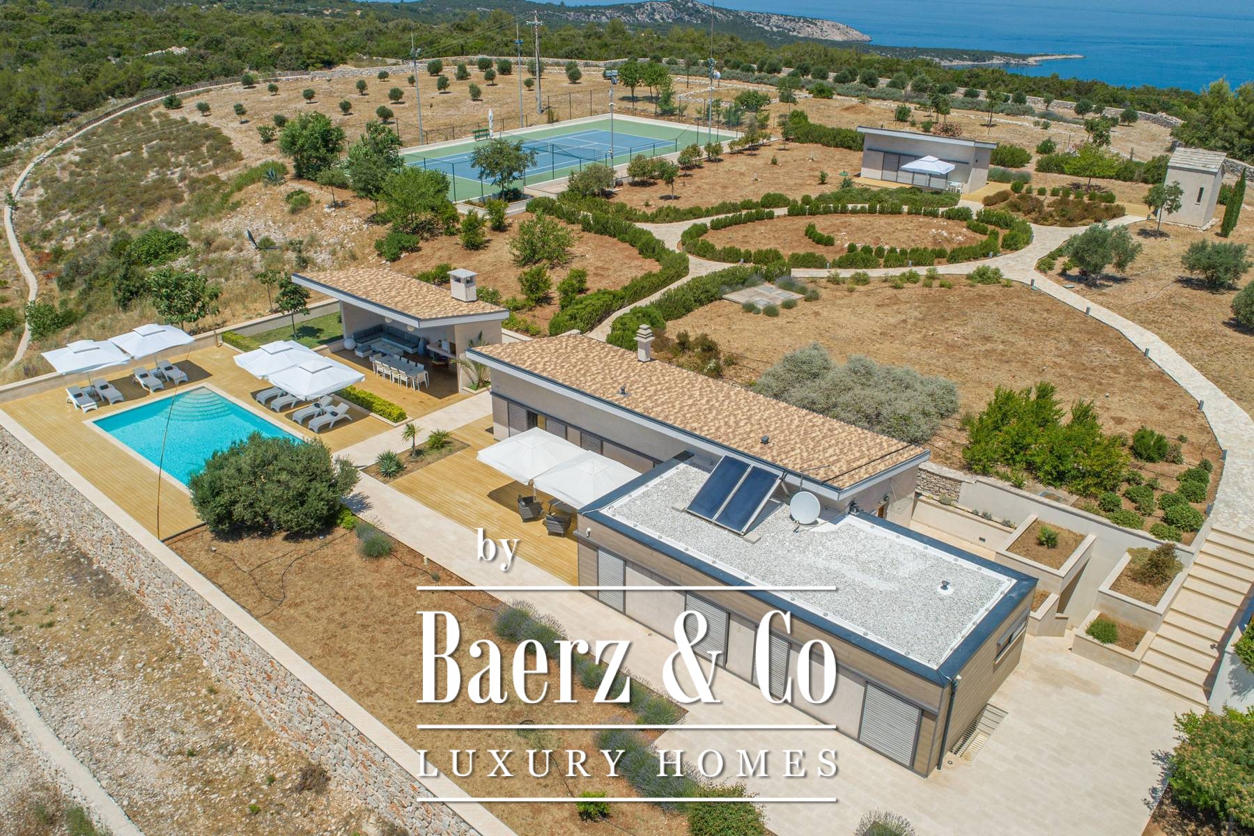 Outdoor living is elevated by a pool positioned to capture sea vistas and the interplay of Mediterranean light with untouched nature. A barbecue area, illuminated tennis court, bowling alley, and a separate garden house with studio apartment enhance the scope for refined gatherings. The property incorporates advanced electronic access, video surveillance, and an alarm system for assured discretion.