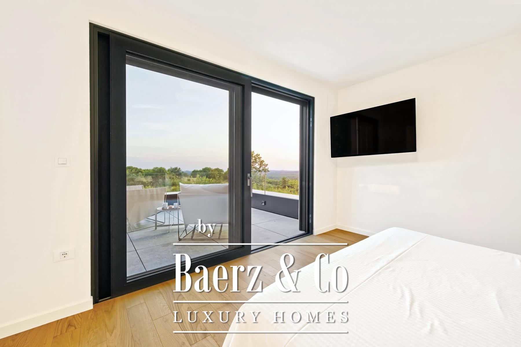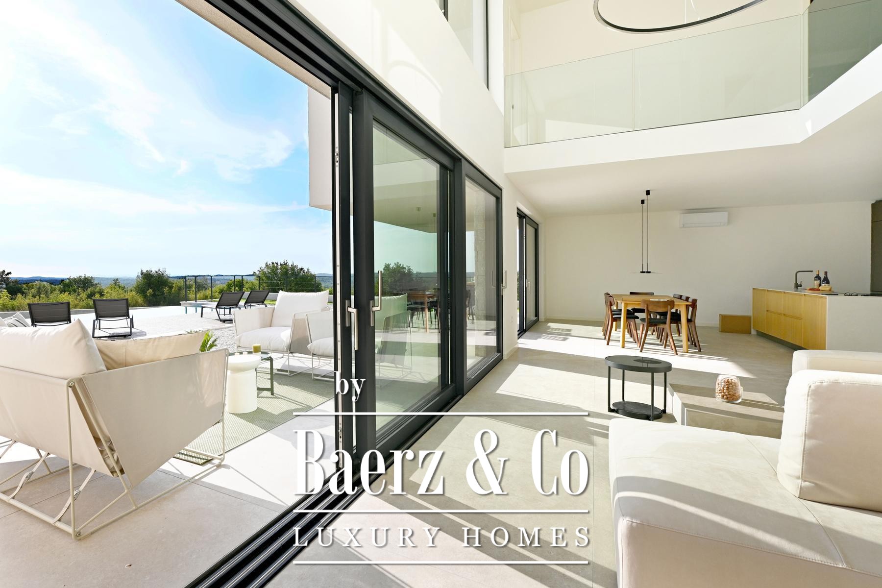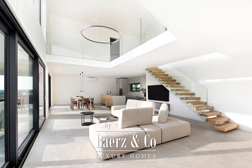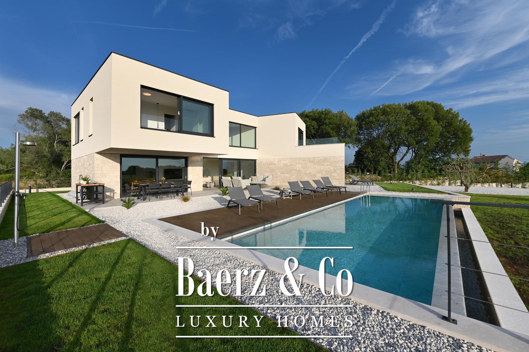Villa Kanfanar with pool invites discovery just outside Rovinj, nestled in the peaceful village of Jural. This 272 m² villa embodies refined Mediterranean living, surrounded by pristine nature and situated only 1,500 meters from the sea, granting both privacy and tranquility. The villa offers a considered layout over two floors. The ground floor features an inviting entrance hall, a luminous glazed living room, a kitchen with an island, a dining area, a guest bedroom with parquet flooring, a bathroom, an additional toilet, and two generous covered terraces designed for relaxed gatherings. Ascending to the first floor, three bedrooms each benefit from private en-suite bathrooms, complemented by an uncovered terrace with ideal views over Lim Bay and the Adriatic. Set on an 871 m² plot, the property includes a swimming pool of 11 by 4 meters, an outdoor shower, select garden furnishings, and ample space for outdoor enjoyment. Air conditioning in every room and the option for underfloor heating ensure comfort year round. Villa Kanfanar with pool stands as a rare offering in Croatia, equally suited for private family life or the discerning investor seeking a tranquil context near the sea.