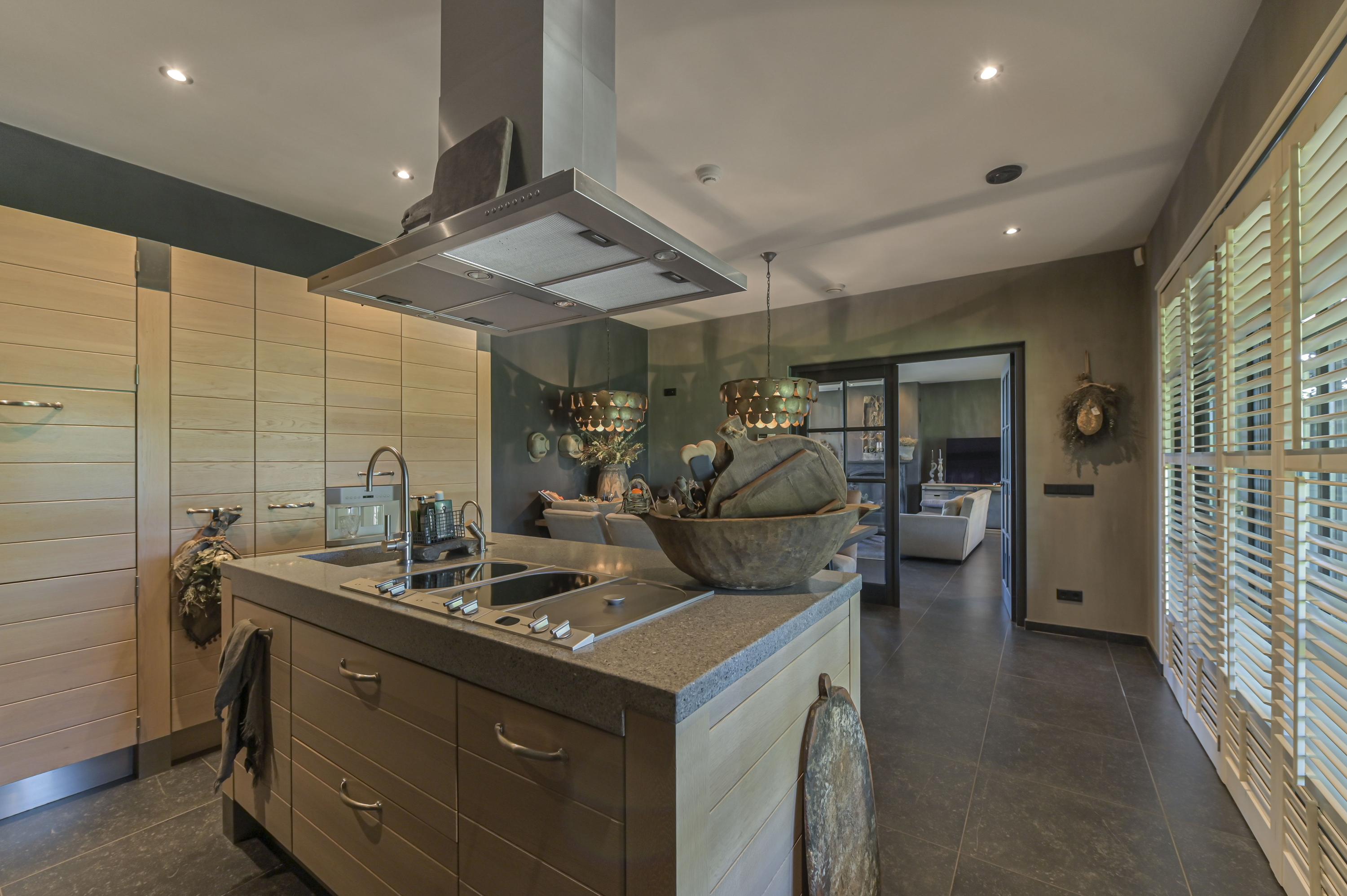 The modern kitchen is equipped with a cooking and sink island, induction hob, built-in fryer, Quooker, combi oven/microwave, refrigerator, freezer, dishwasher, and extractor. From here, the utility room is accessible, with a fixed cupboard, laundry connections, sink, underfloor heating unit, and direct access to the garden.