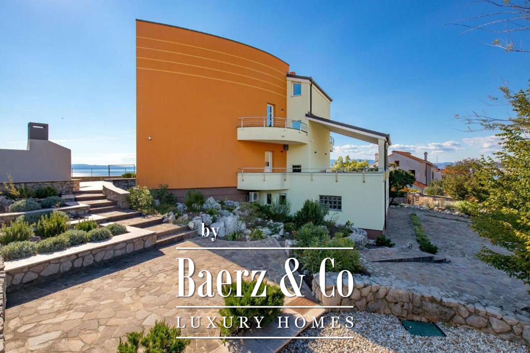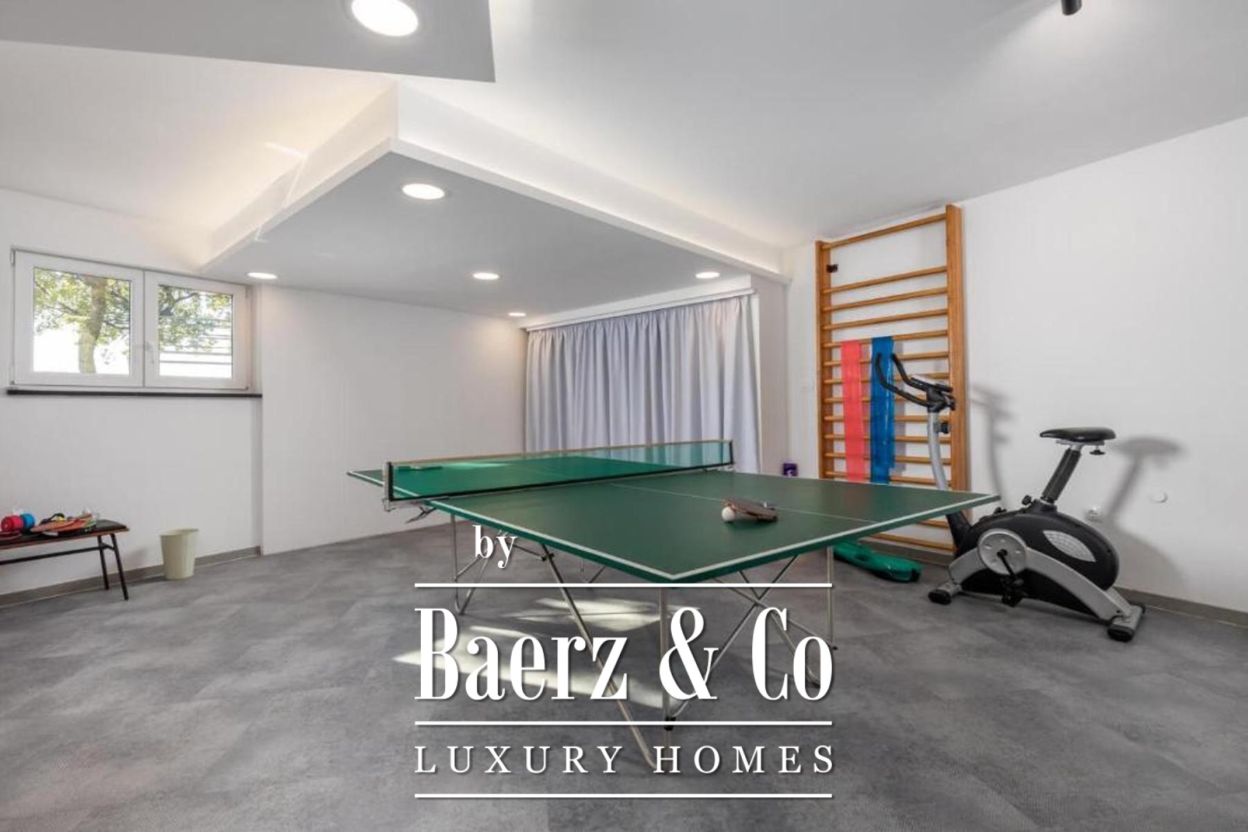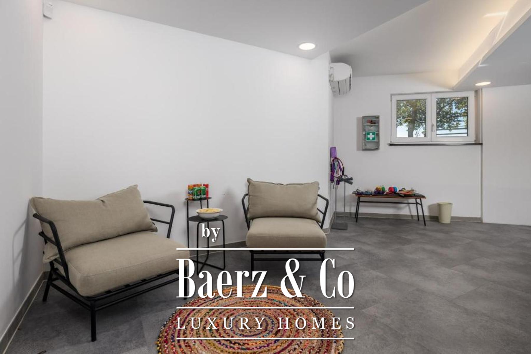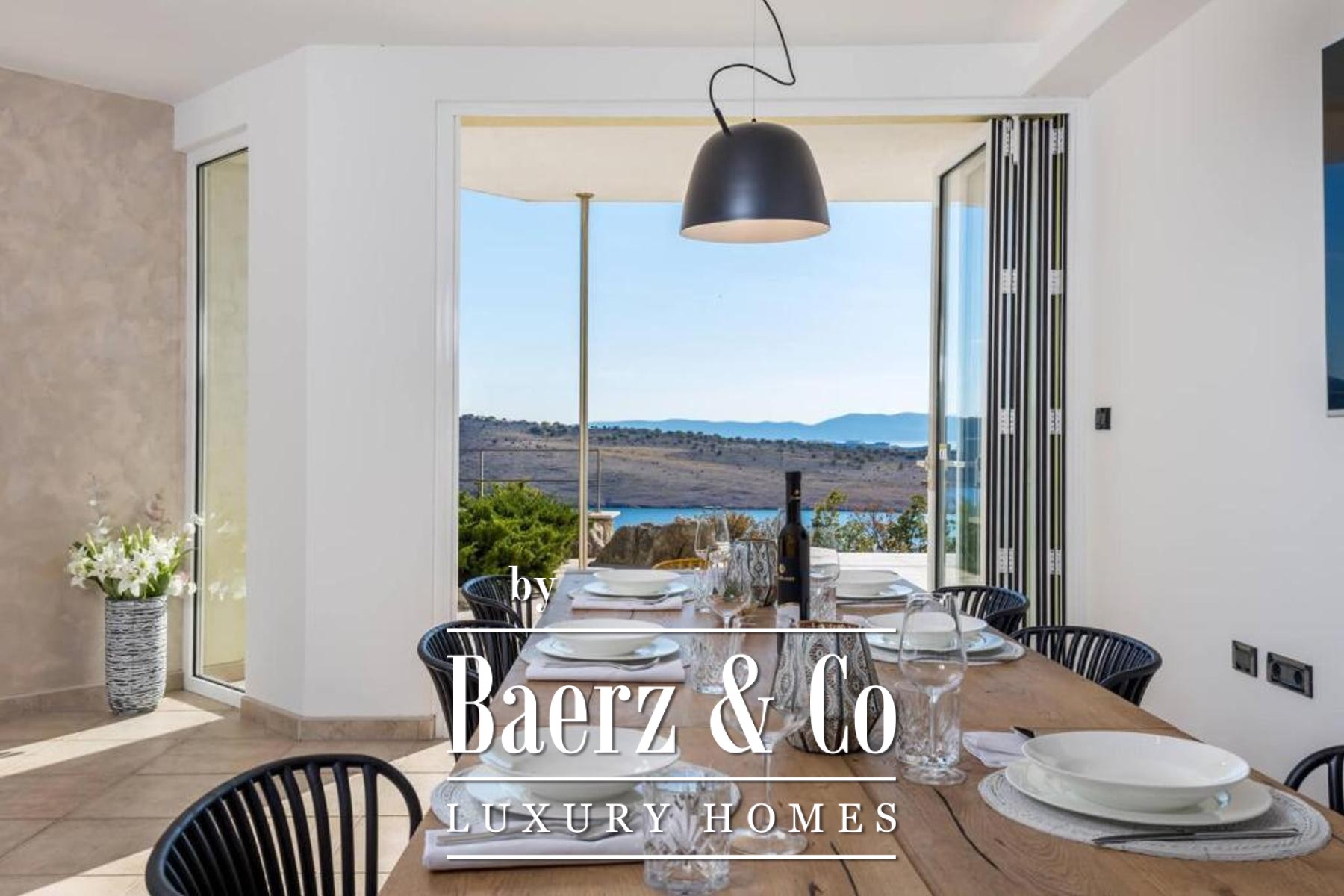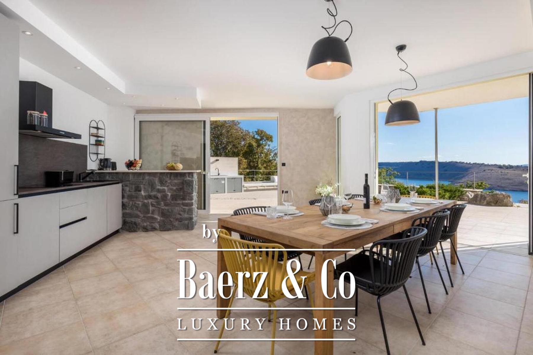 Set on a 1,585 m² plot, the property welcomes guests with a spacious private garage, a laundry, a hobby area, and a self-contained one-bedroom apartment in the basement, cultivating privacy and flexibility. The dedicated summer kitchen opens to a generous terrace with an infinity pool and sun deck, orchestrating sea views and tranquility.