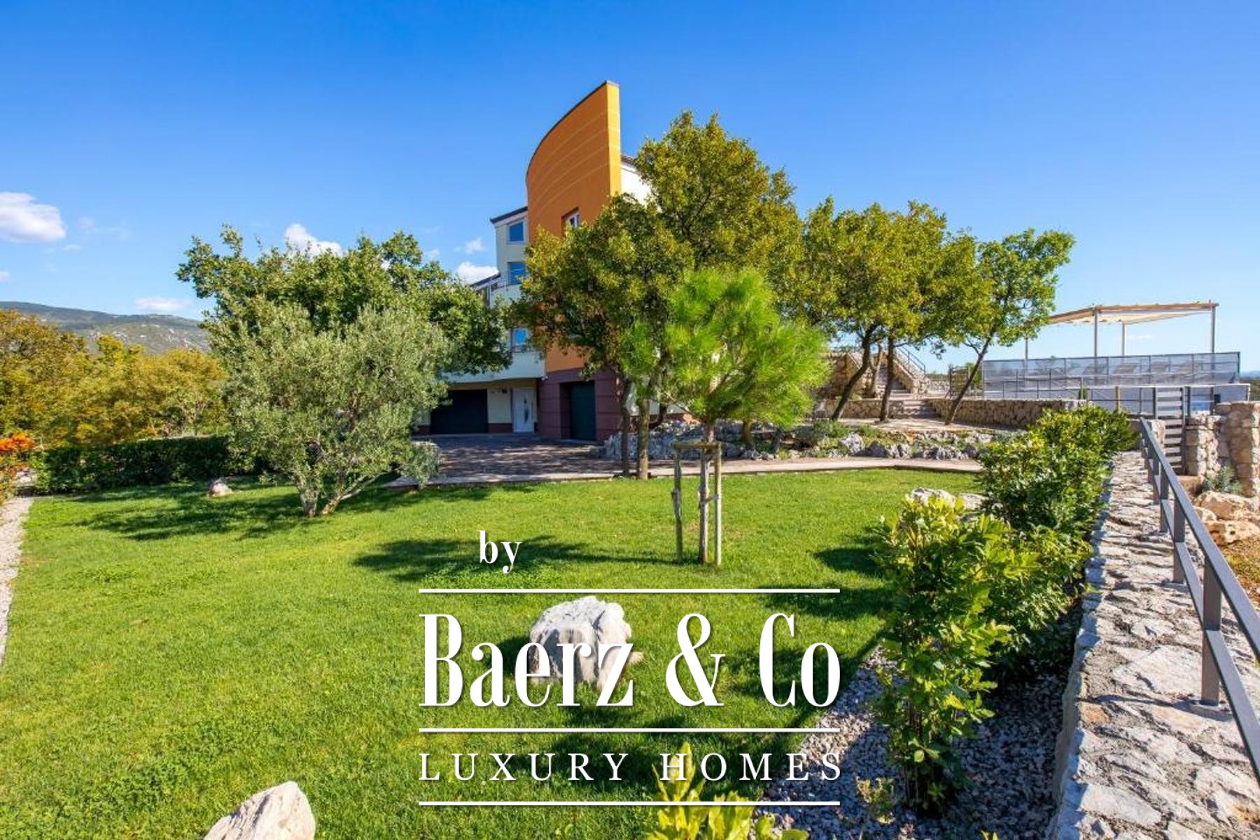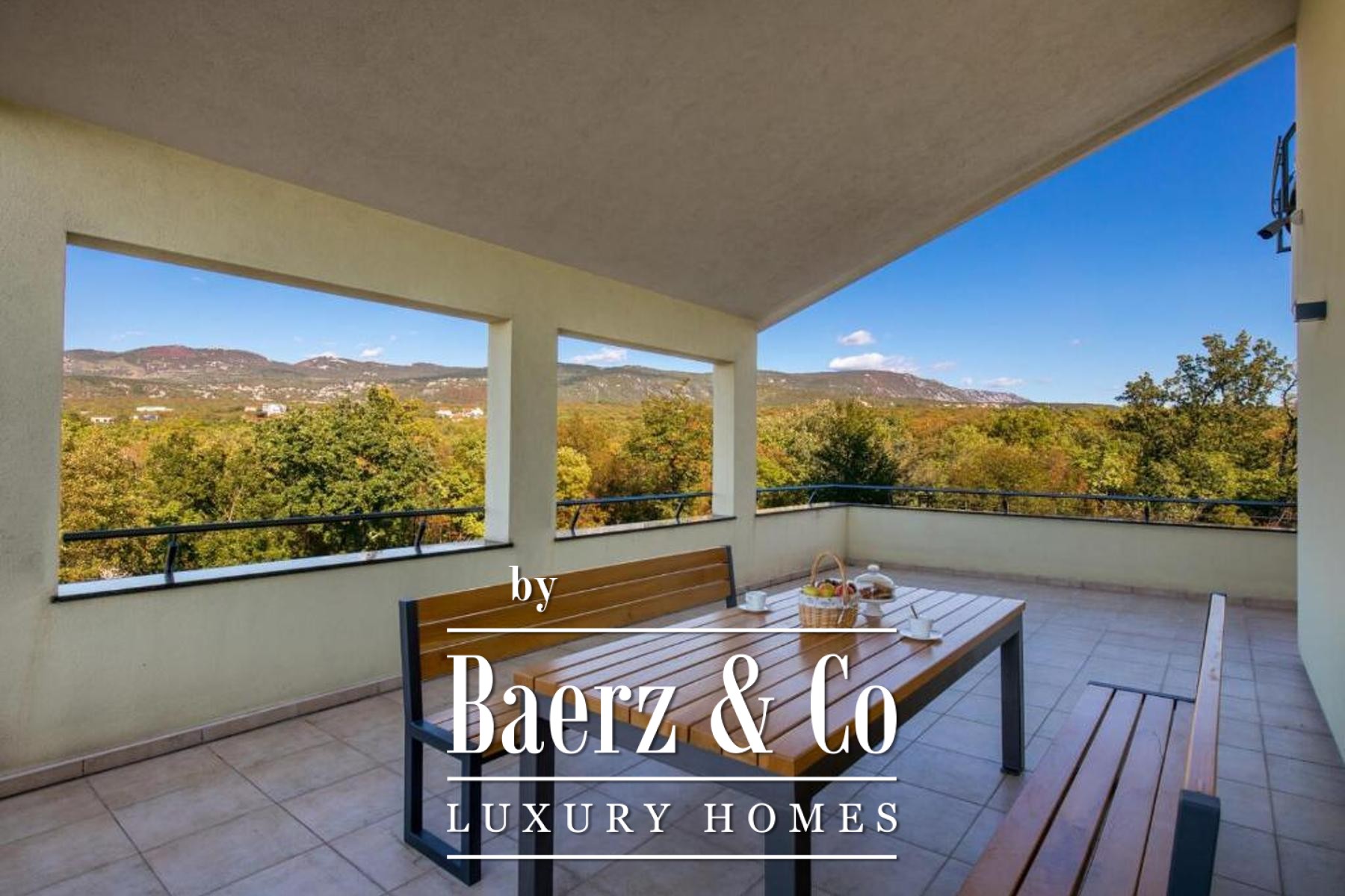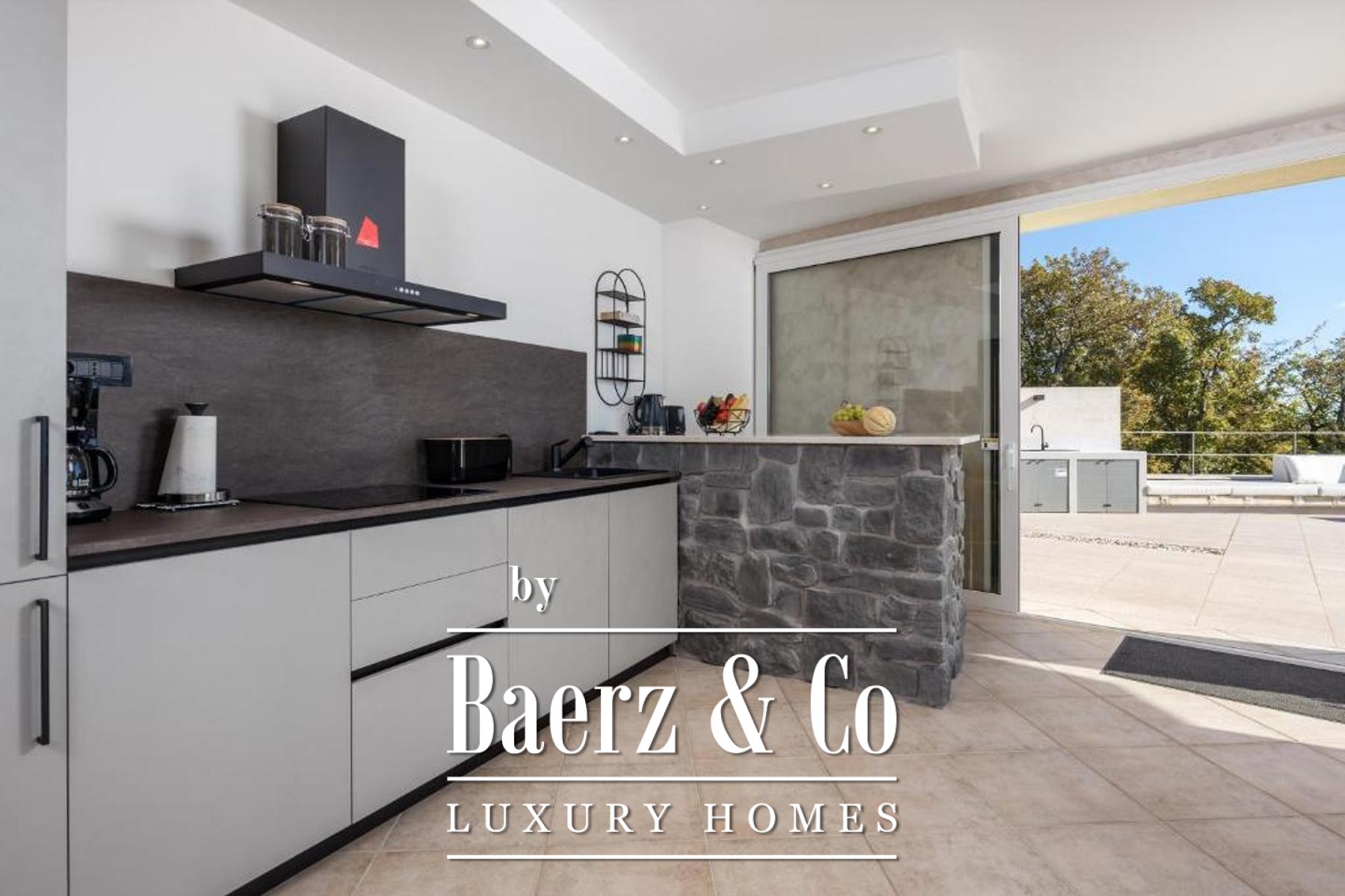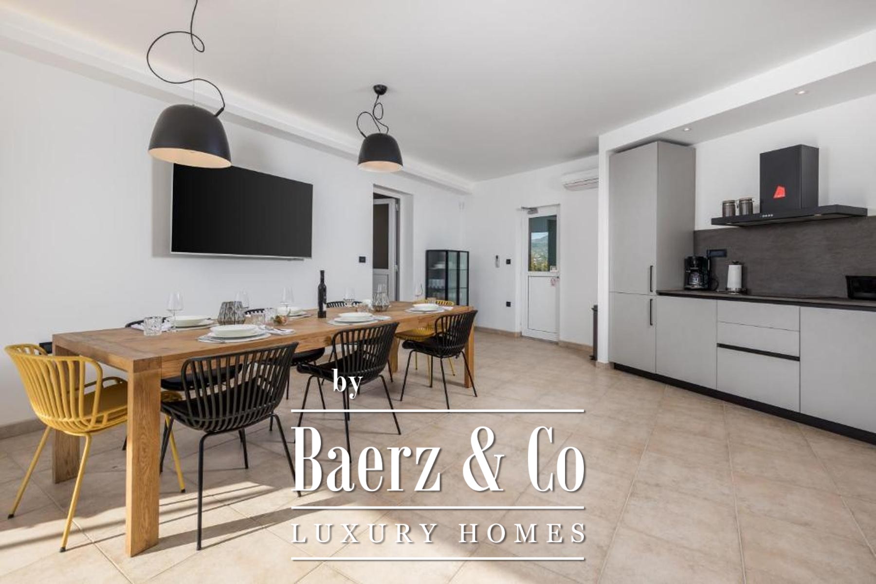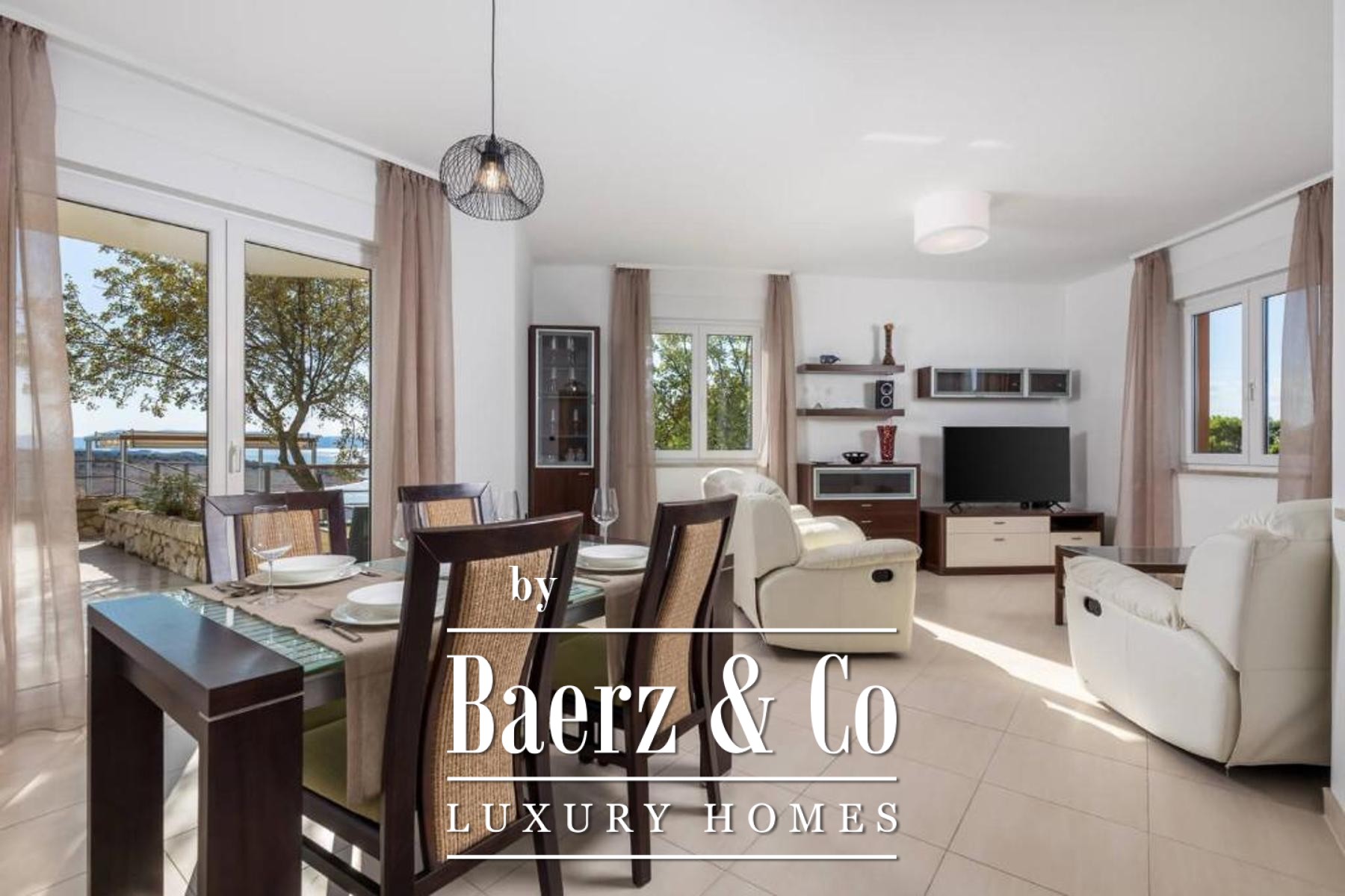 Set on a 1,585 m² plot, the property welcomes guests with a spacious private garage, a laundry, a hobby area, and a self-contained one-bedroom apartment in the basement, cultivating privacy and flexibility. The dedicated summer kitchen opens to a generous terrace with an infinity pool and sun deck, orchestrating sea views and tranquility.