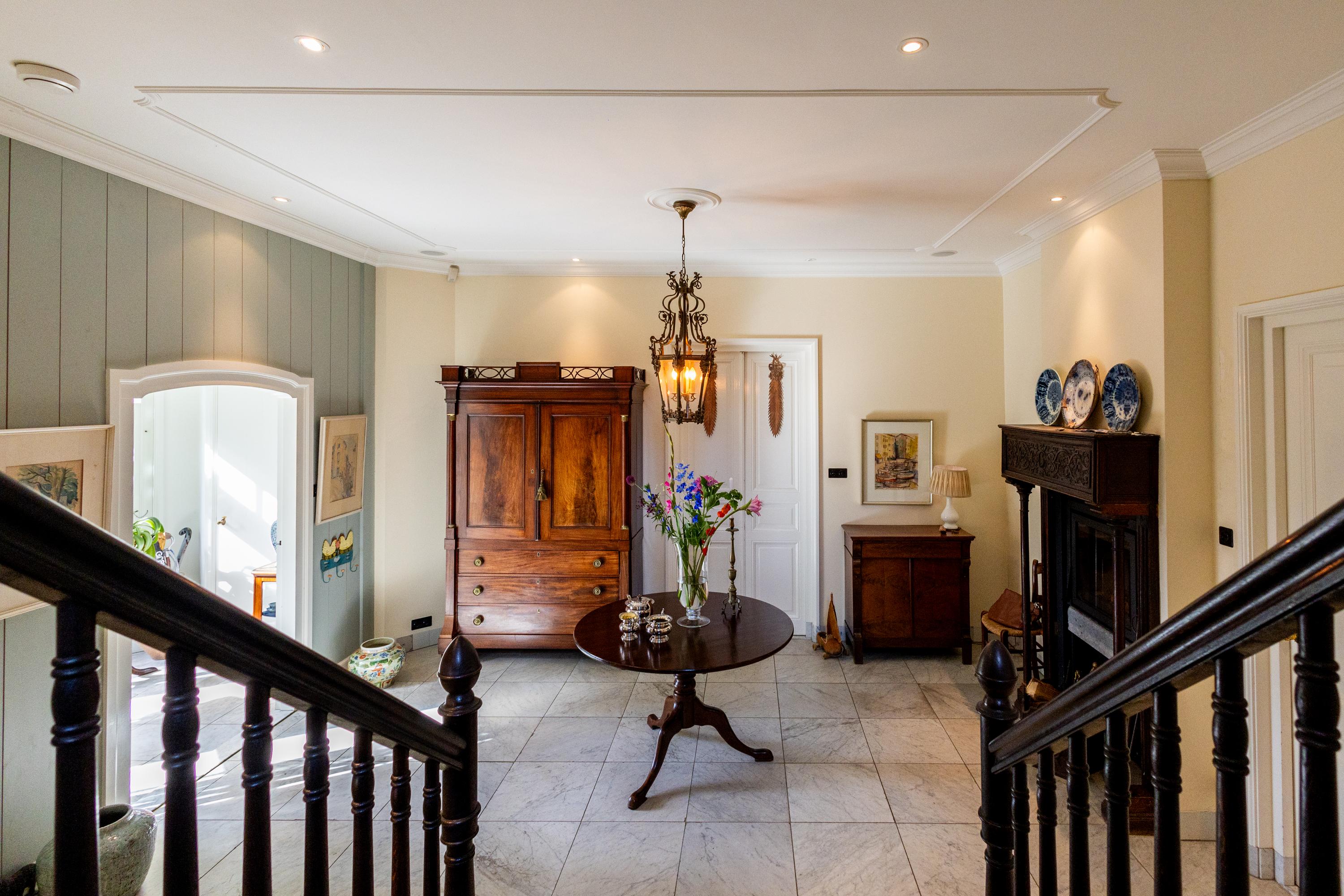 Inside, the villa is as surprising as it is enchanting. With a living area of approximately 350 m² and an additional 150 m² in the basement, the house offers an abundance of space. The ceilings on the ground floor reach nearly three meters high, giving every room a sense of airy openness. The stately entrance hall, with its fireplace and sweeping staircase, feels like a promise of what’s to come.