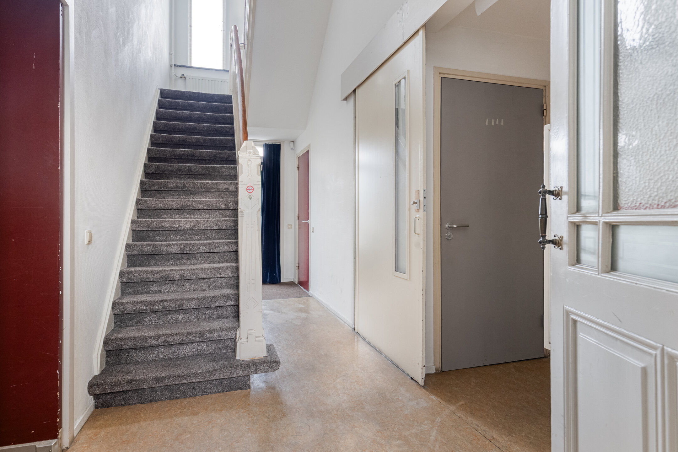 Entrance hall with staircase to the first floor; plastered walls, linoleum flooring, plastered ceiling