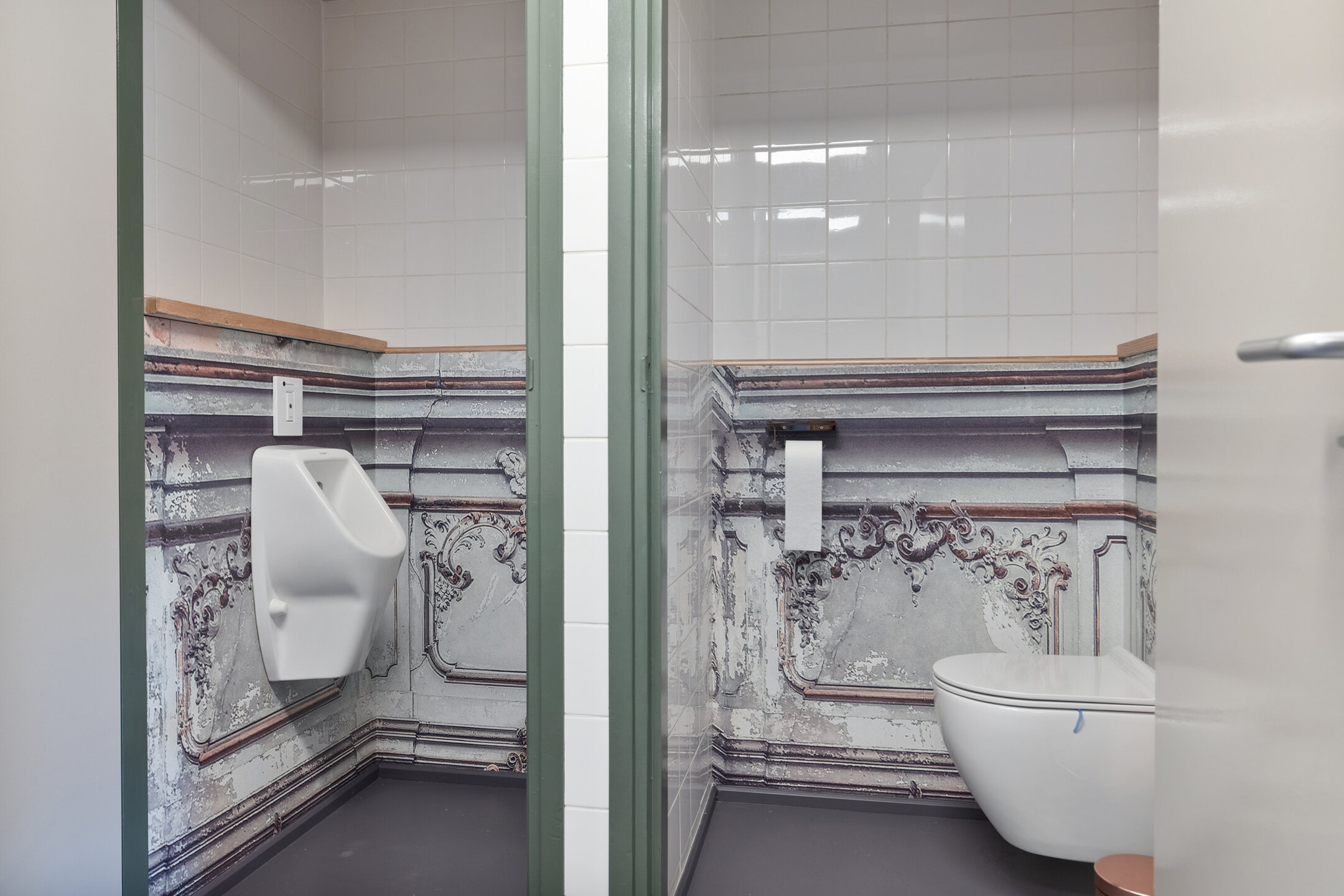Tiled toilet with wall-mounted unit