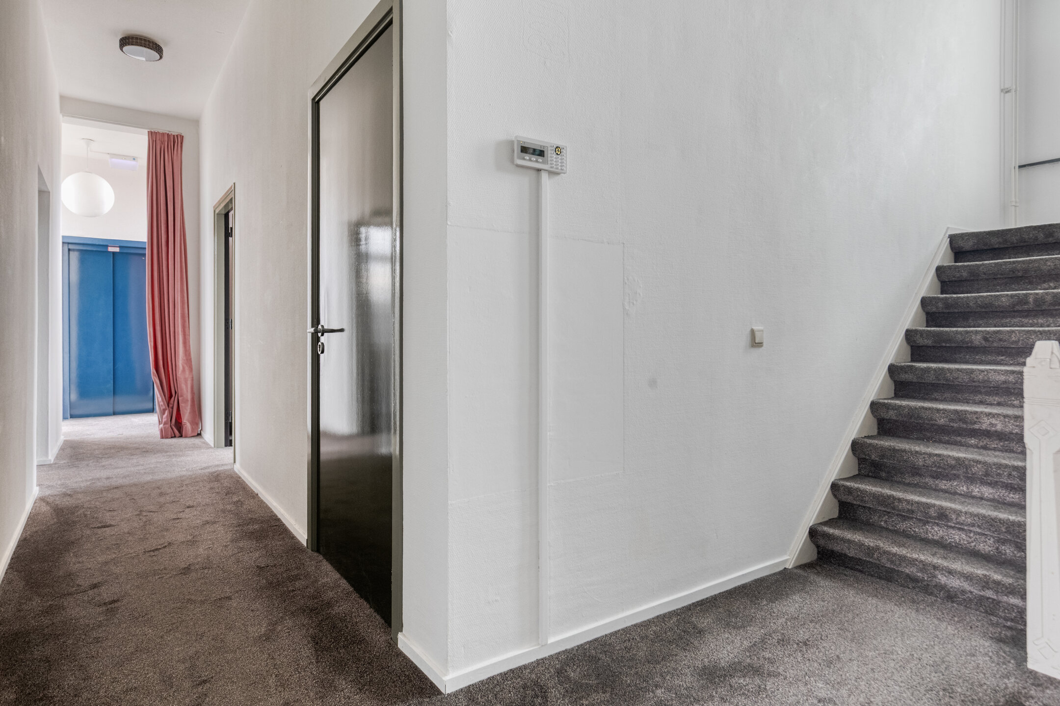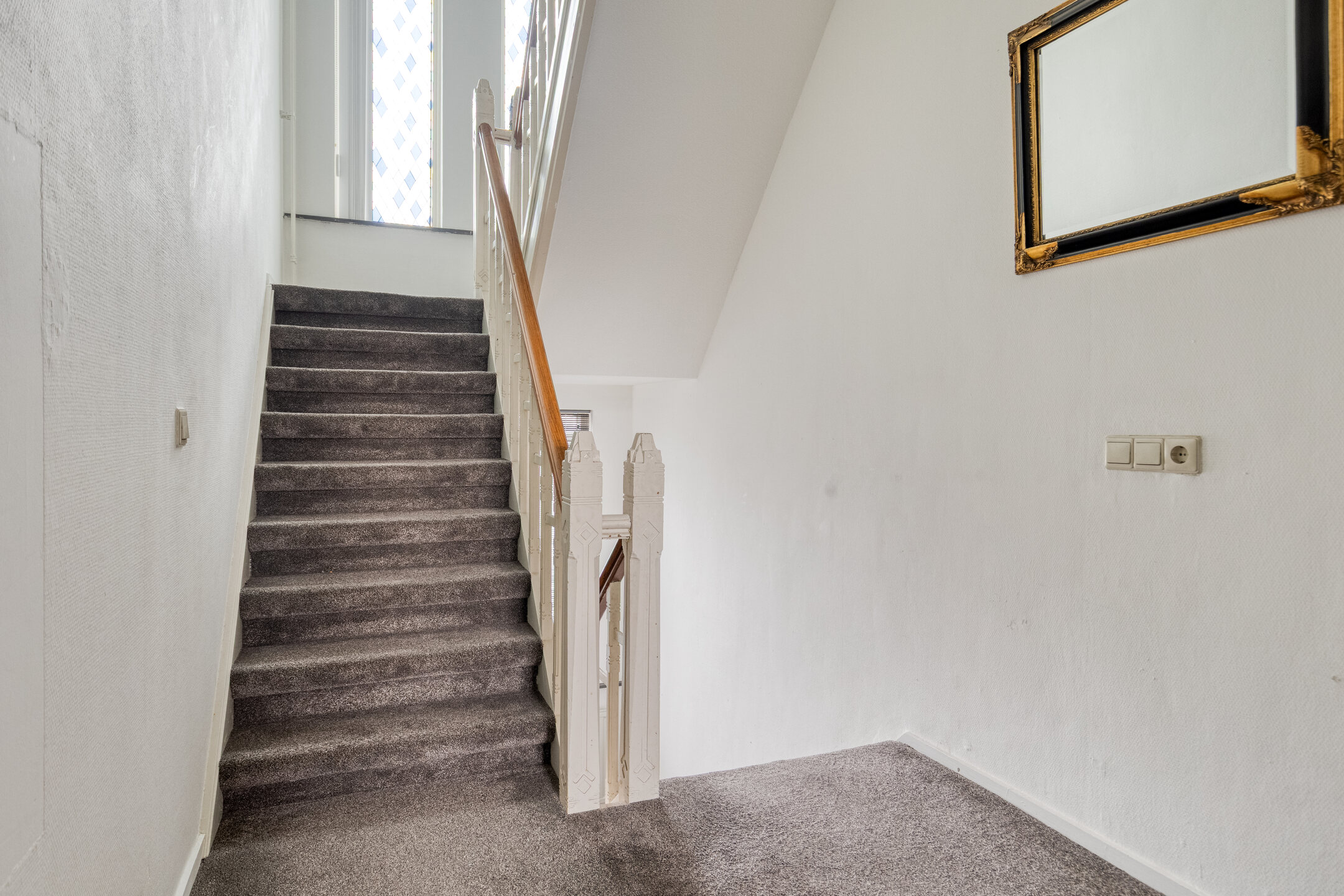 Landing with fixed staircase to the second floor; fiberglass wallpaper, carpeted floor, spray-finished ceiling
