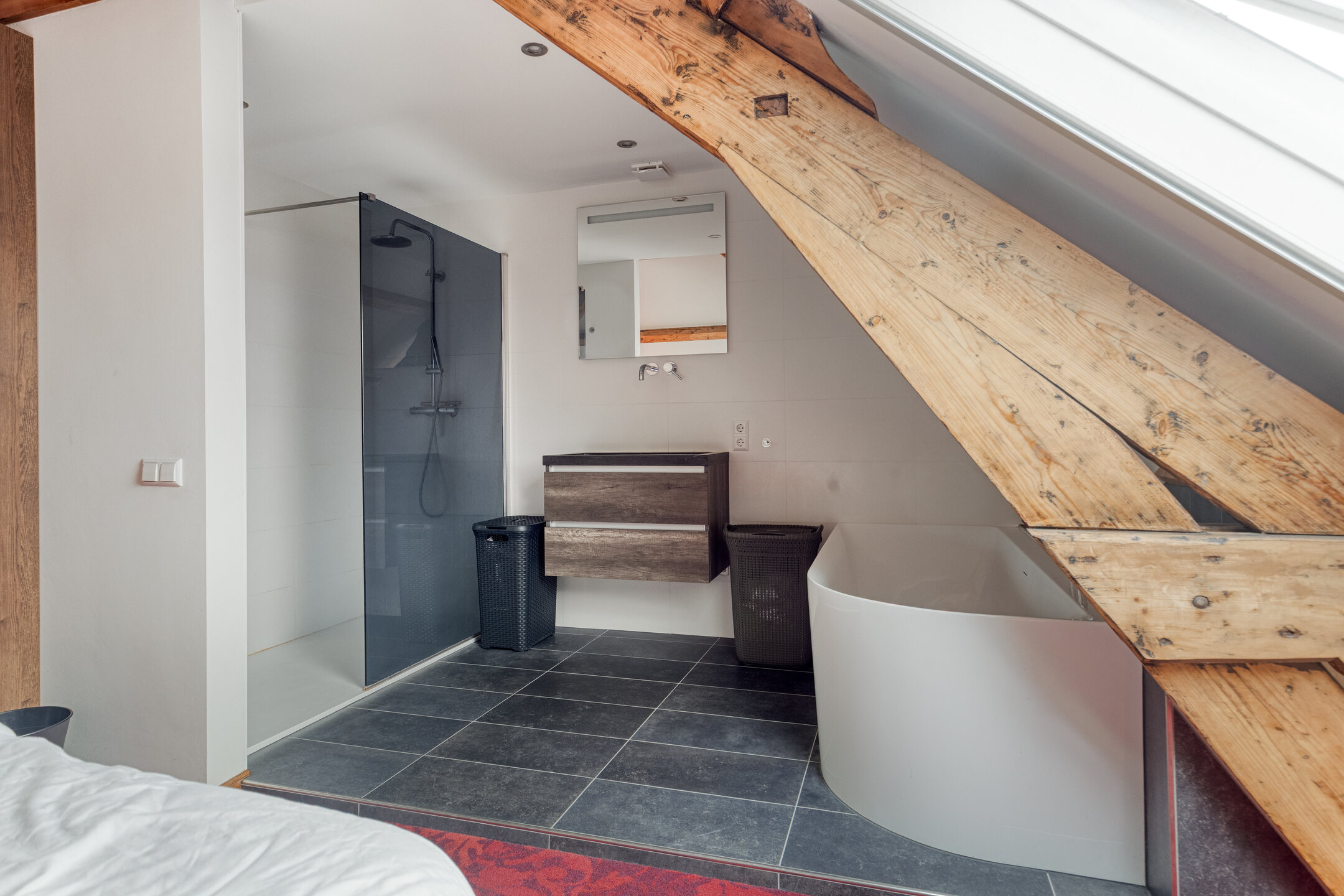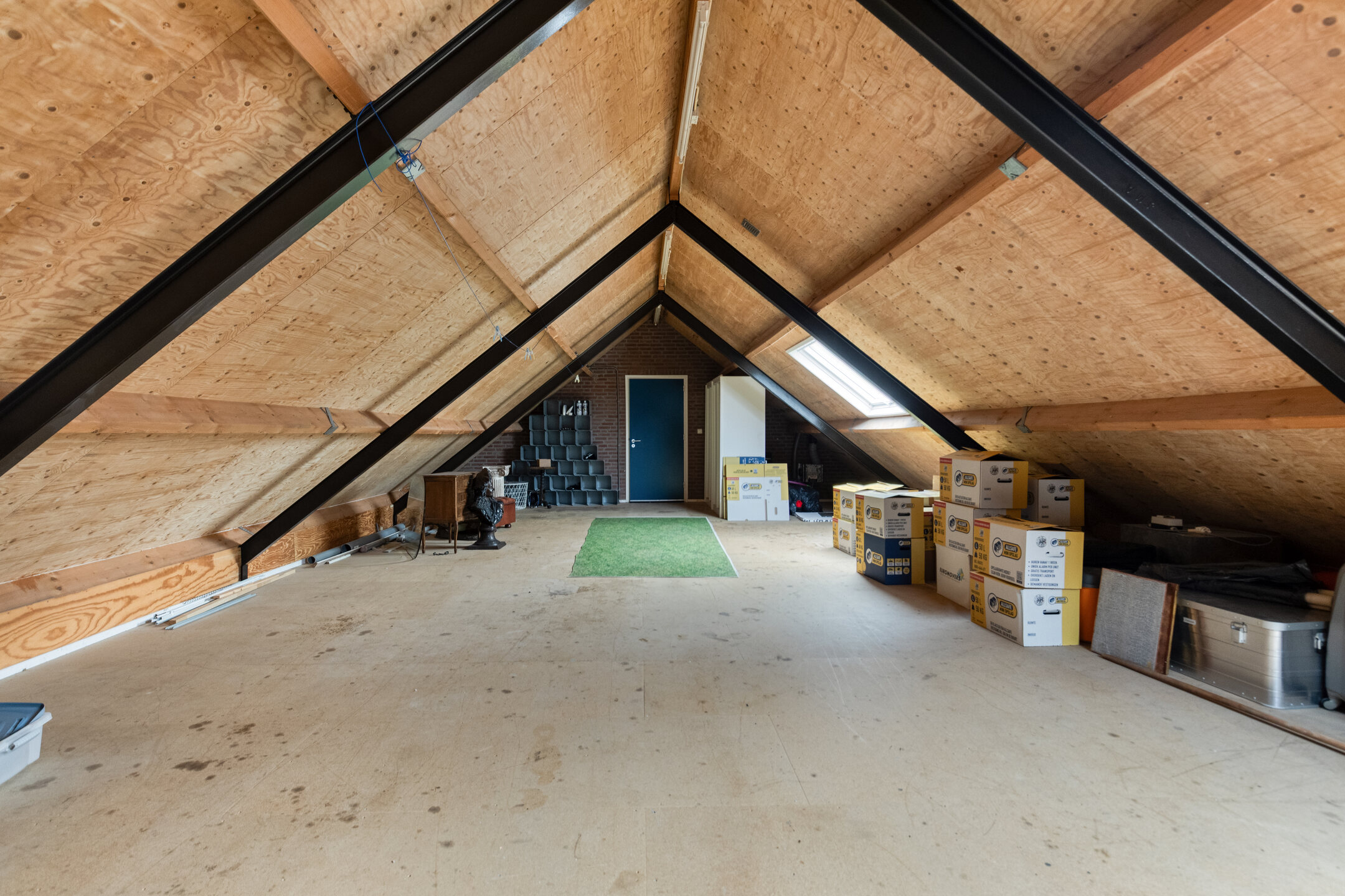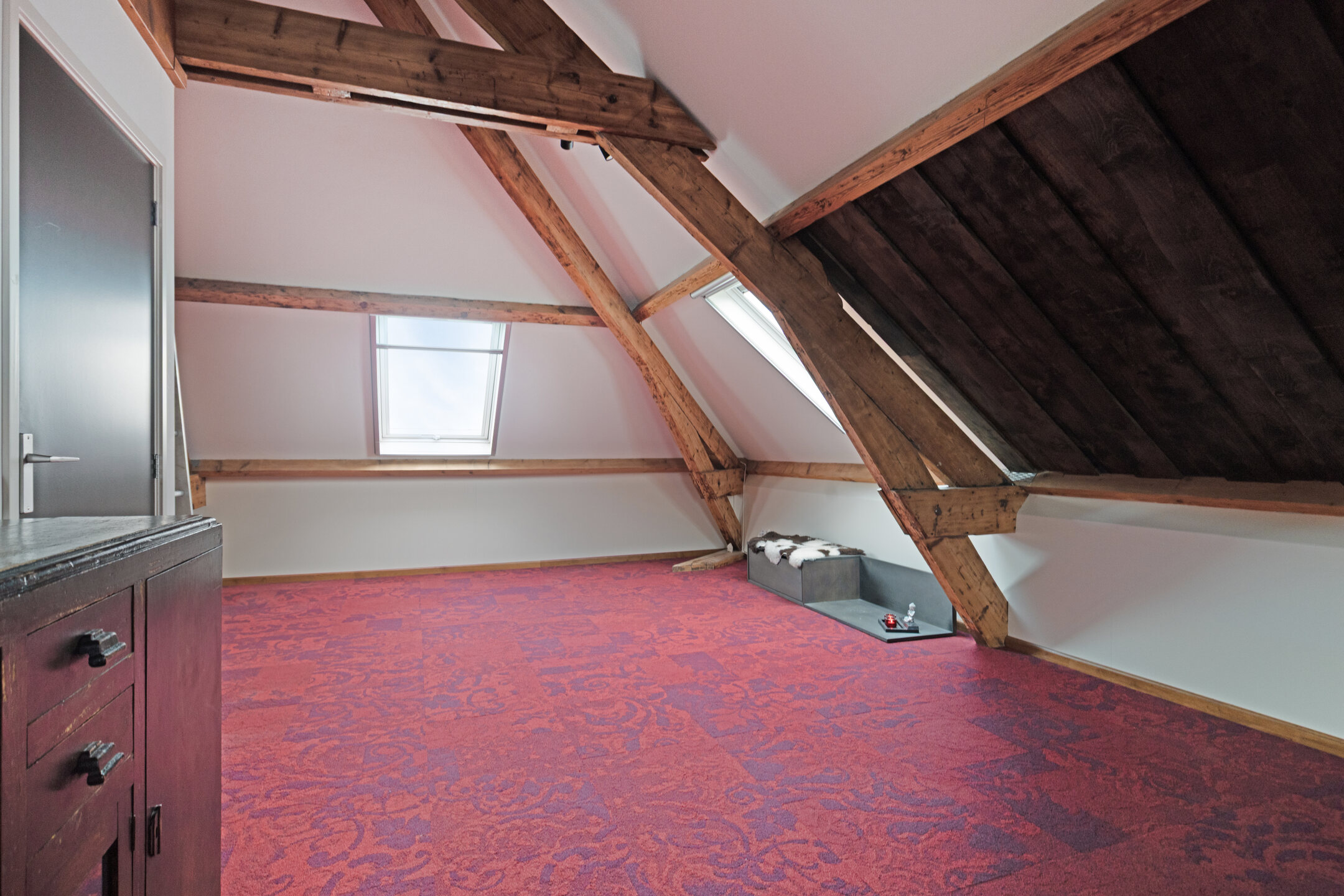 Spacious attic room on the right with potential for an additional bedroom/hobby/work room, two skylights, plastered walls, wooden floor, visible roof structure