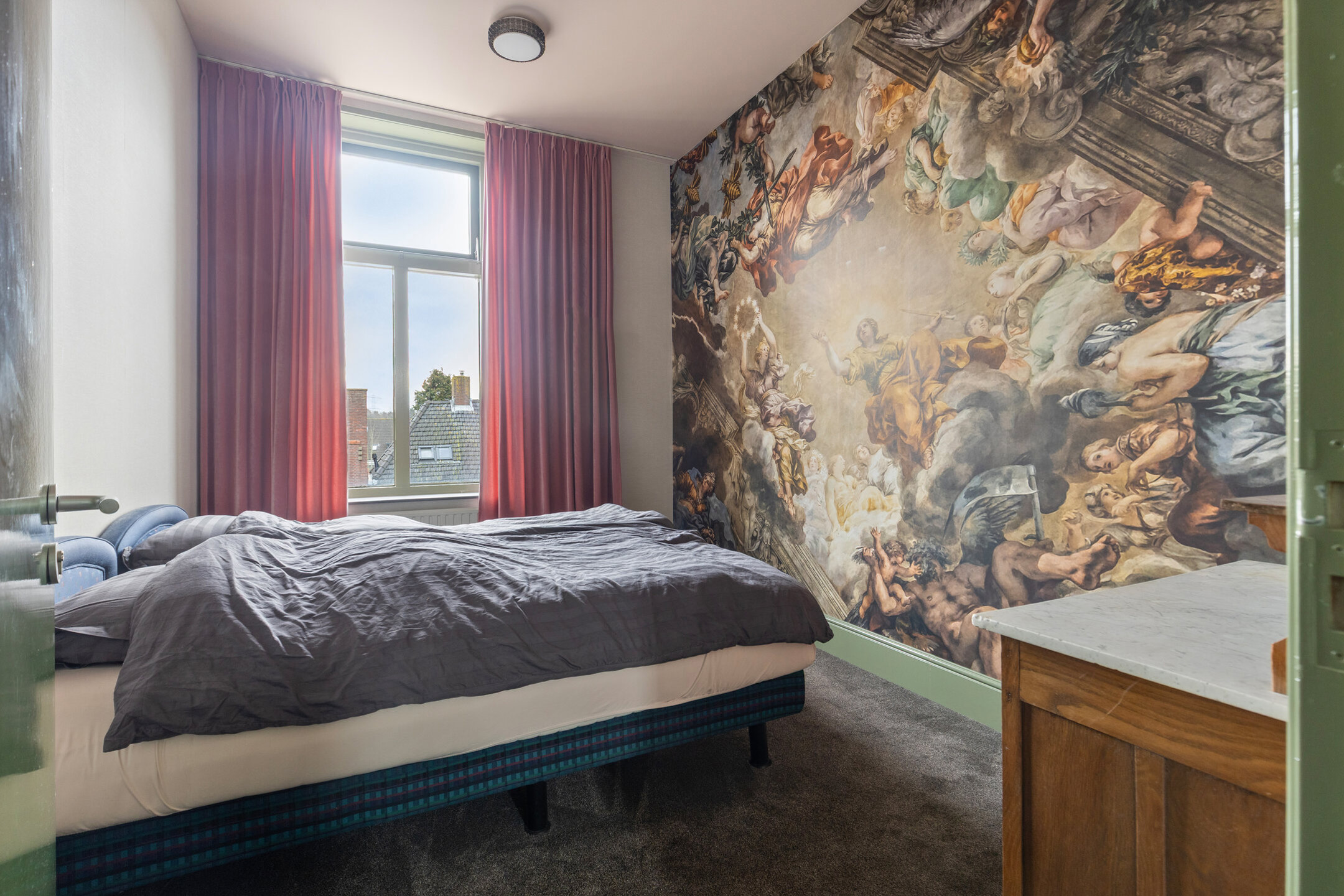 Front left bedroom; wallpapered walls, carpeted floor, plastered ceiling