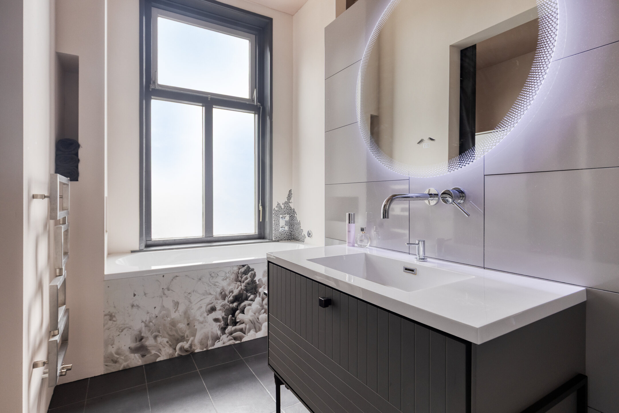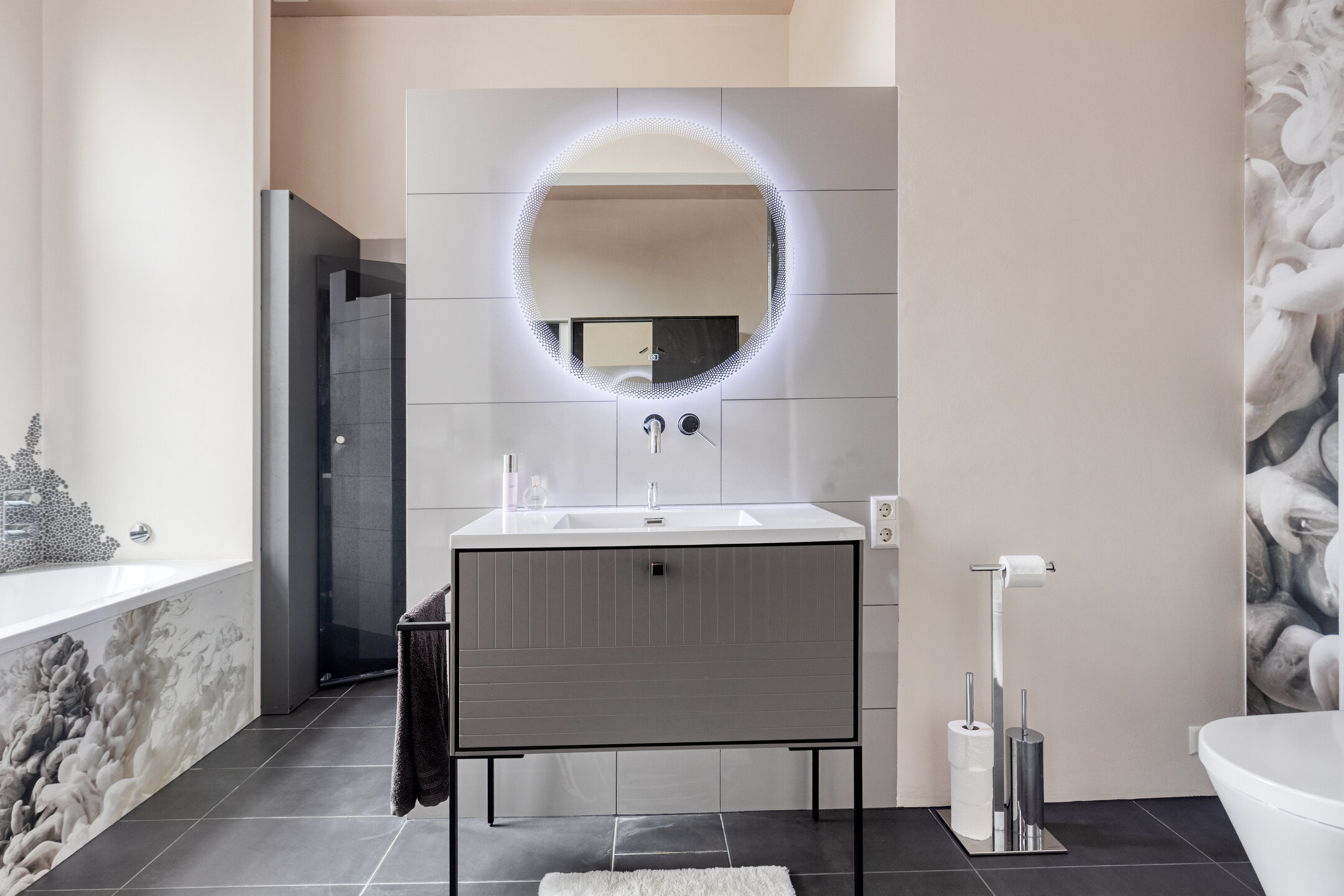 Modern tiled bathroom with bathtub, walk-in shower, wall-mounted toilet, vanity unit with washbasin, cabinet with washer/dryer connections, electric underfloor heating, and mechanical ventilation