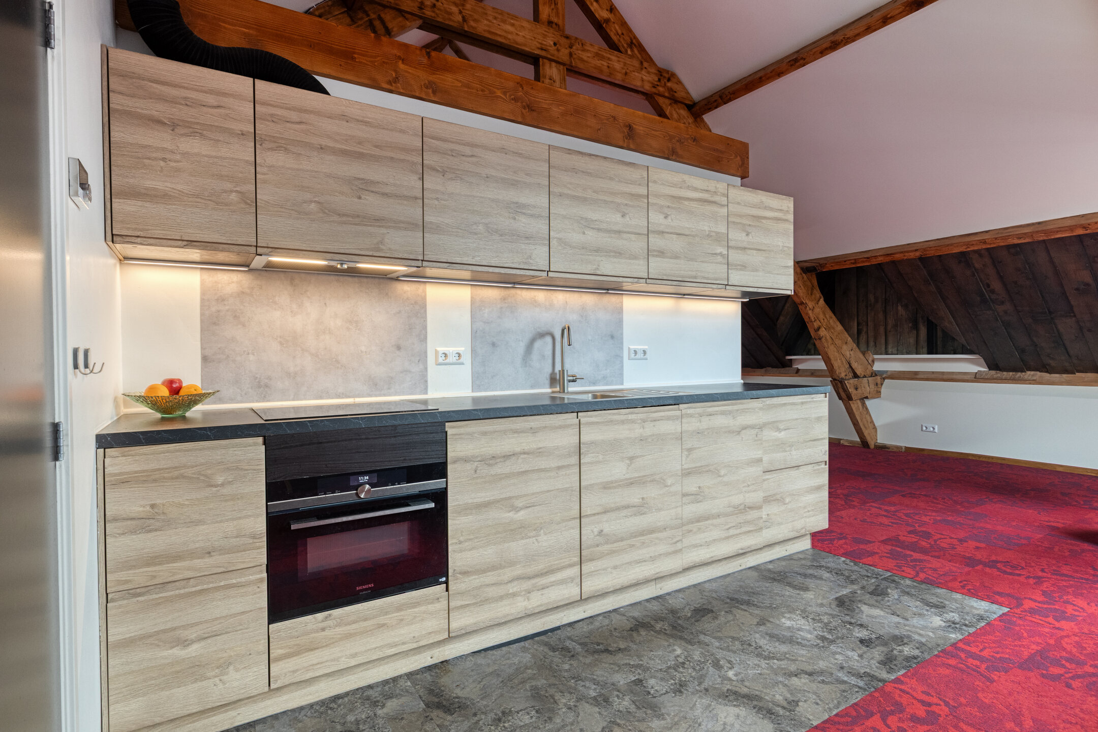 Open kitchen with fitted units, cooking island and bar area, composite worktop with sink, built-in induction hob with integrated extraction system, refrigerator drawer, combination oven/microwave, and dishwasher; plastered walls, vinyl flooring, plastered ceiling; steps and door to attic space