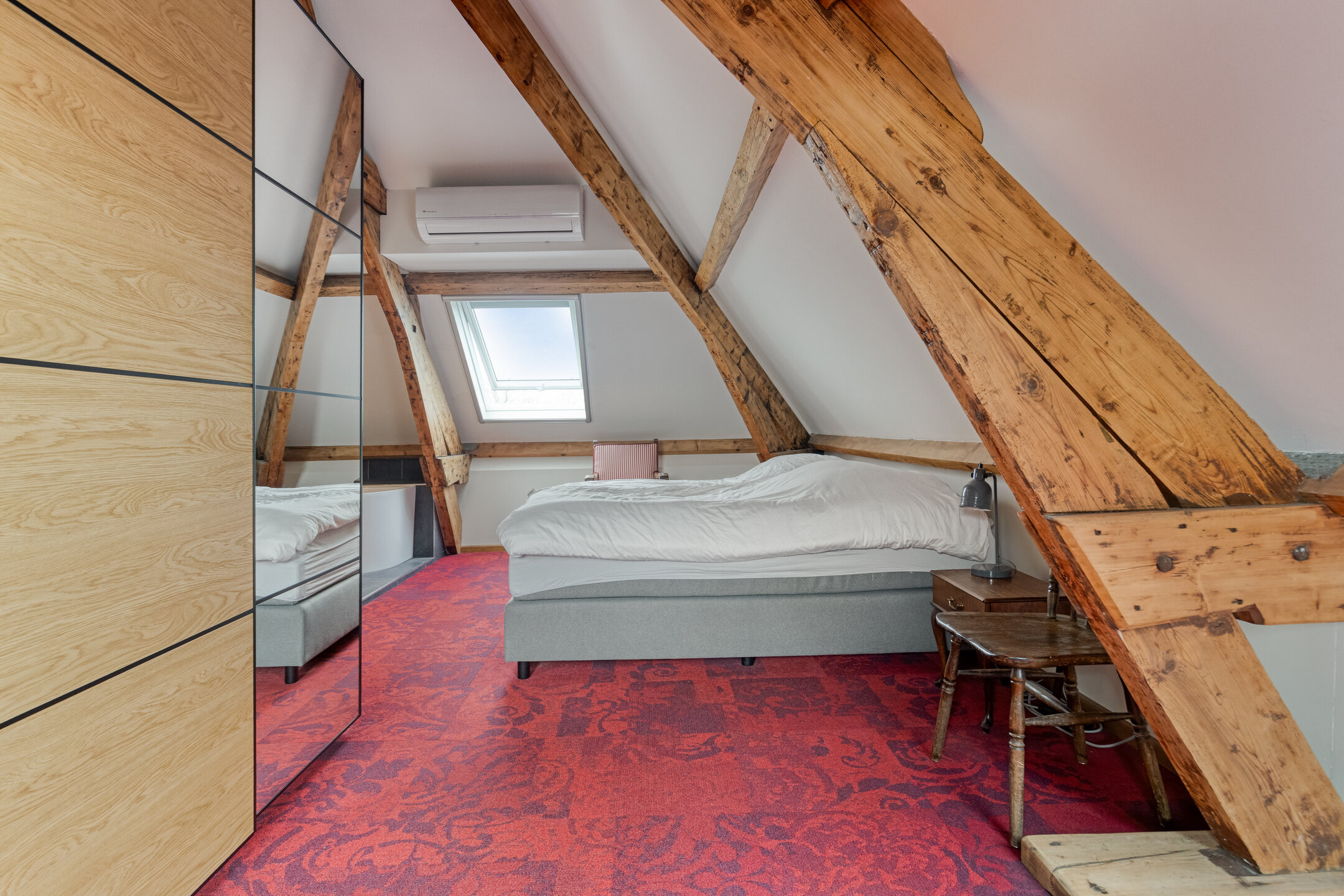 Living room with Velux skylights including blackout blinds and insect screens, air conditioning, and a Velux balcony window; plastered walls, carpeted floor, visible roof structure