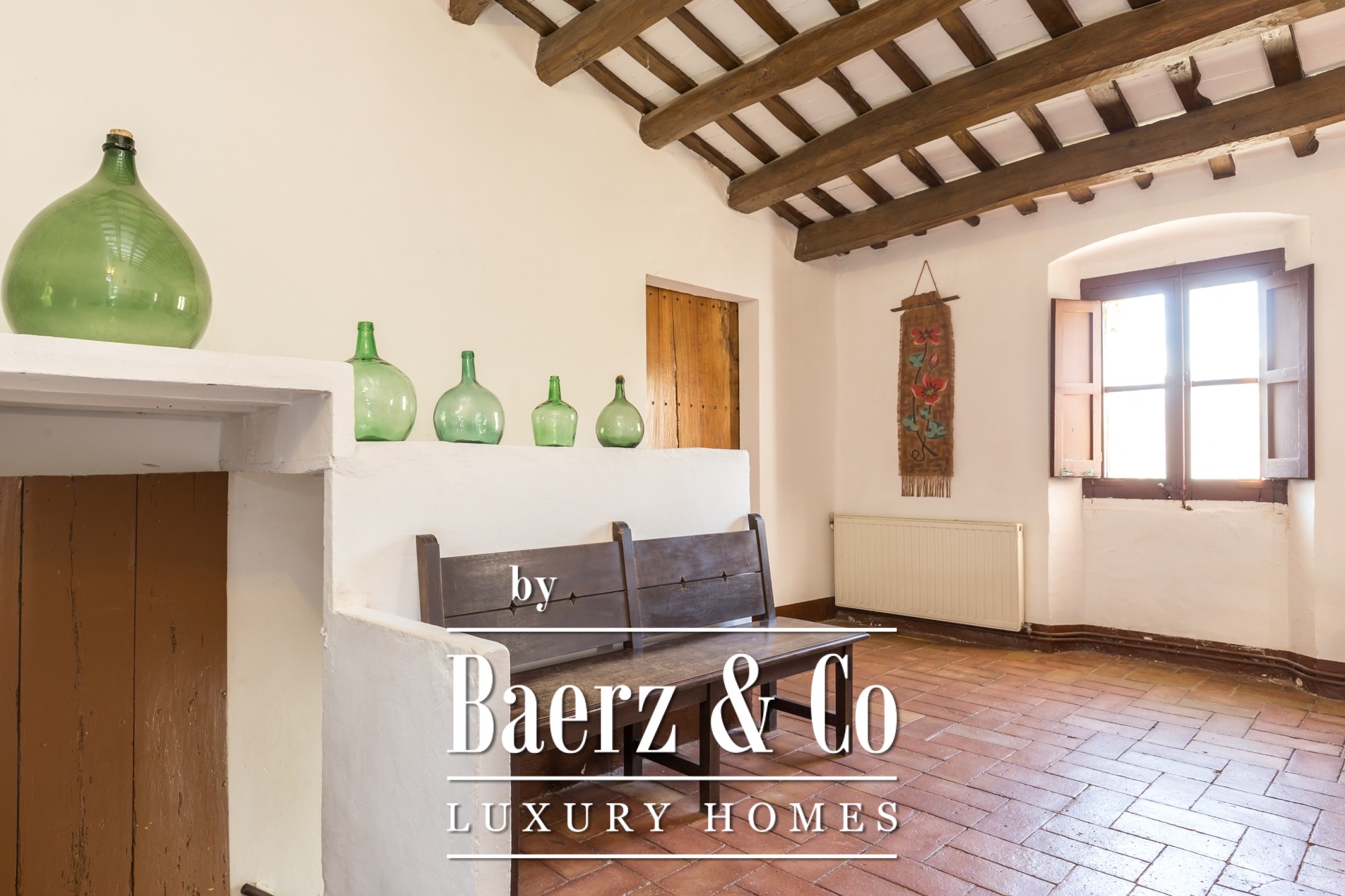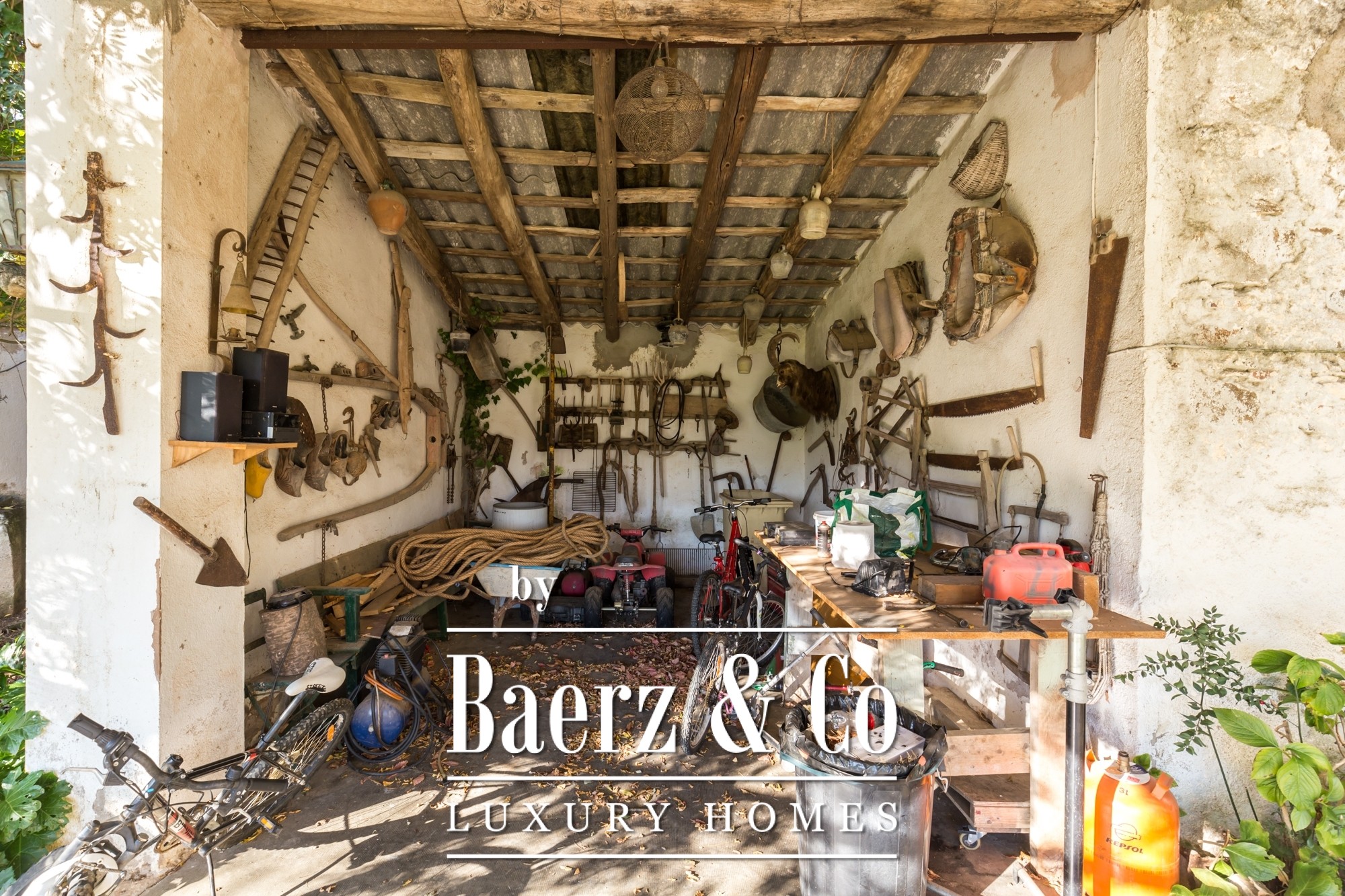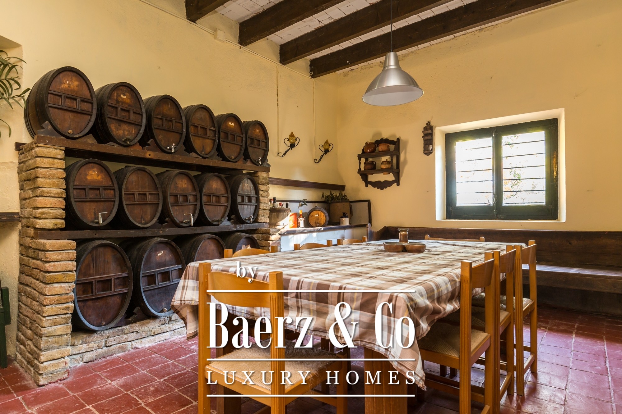 The main residence features seven bedrooms and four bathrooms, with suites on the upper level offering private terraces and sweeping vistas. High ceilings, light-filled rooms, and original architectural details reflect its historical character. There are two dining and living rooms, a voluminous family kitchen, and an office-library connecting to a serene private garden. Generous storage and auxiliary buildings convey practical flexibility.