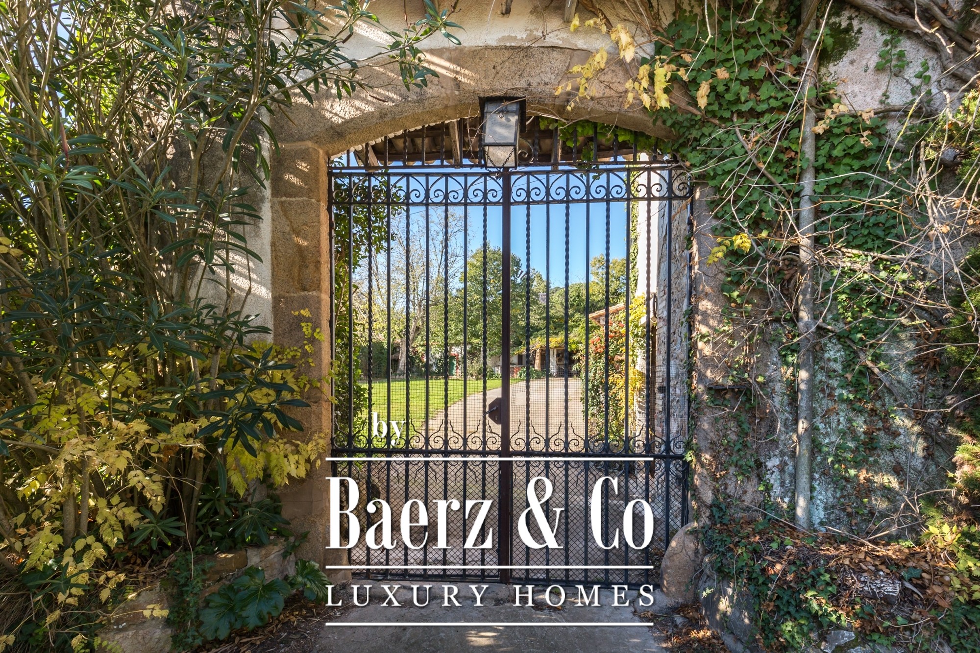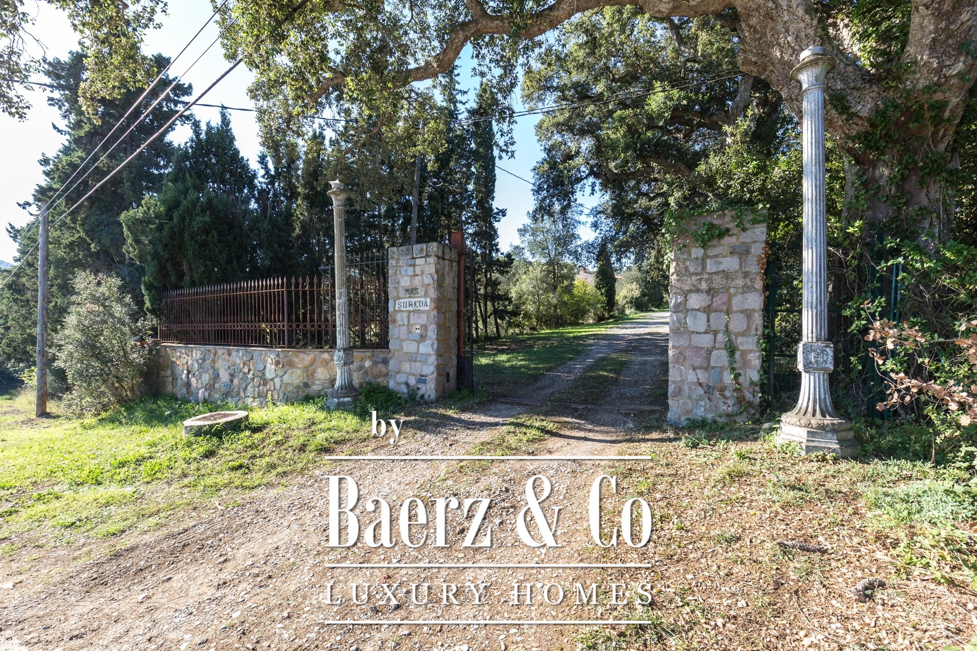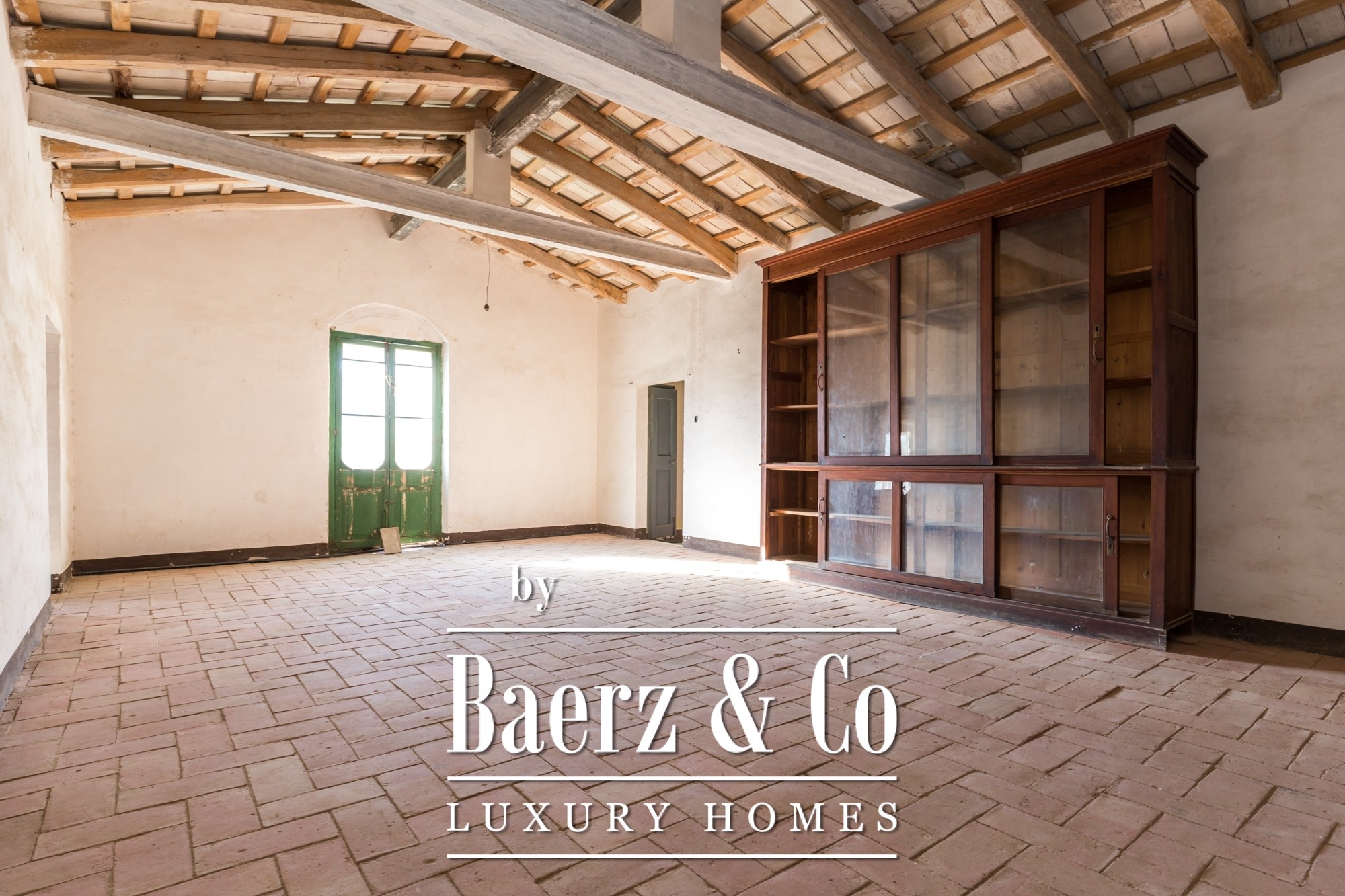 The main residence features seven bedrooms and four bathrooms, with suites on the upper level offering private terraces and sweeping vistas. High ceilings, light-filled rooms, and original architectural details reflect its historical character. There are two dining and living rooms, a voluminous family kitchen, and an office-library connecting to a serene private garden. Generous storage and auxiliary buildings convey practical flexibility.