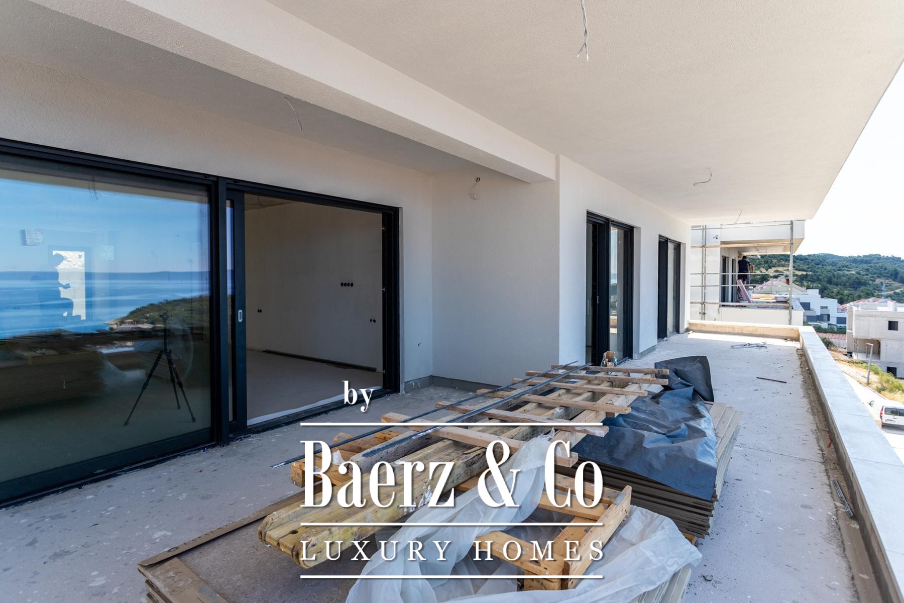 The floor-through apartment is thoughtfully divided into three en suite bedrooms, a spacious hallway, a pantry, laundry room, and an expansive living area that flows naturally to the outdoor spaces. The intelligent layout ensures each room is bathed in Adriatic light, enhancing the sense of calm and space. Smart home technology and underfloor heating via a heat pump, paired with quality air conditioning, bring comfort to every season. The selection of first-class parquet and ceramics, complemented by Schuco aluminum details, underlines a commitment to enduring quality.
