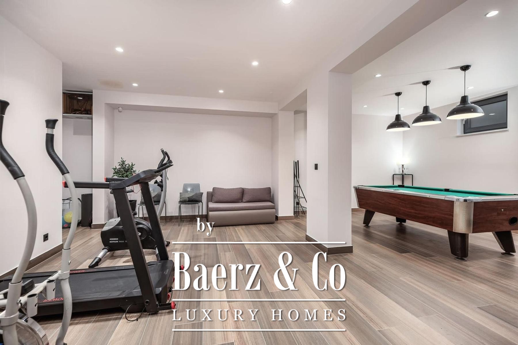 The architecture unfolds over three levels. The basement is dedicated to leisure, featuring fitness equipment, a billiard table, a generous sofa and television, a sauna with shower, a separate toilet, and storage. The ground floor welcomes with an open kitchen, dining, and living area, complemented by a bathroom and a guest bedroom. Upstairs, three bedrooms each enjoy private en-suite bathrooms and access to a dedicated laundry space, allowing for privacy and ease.