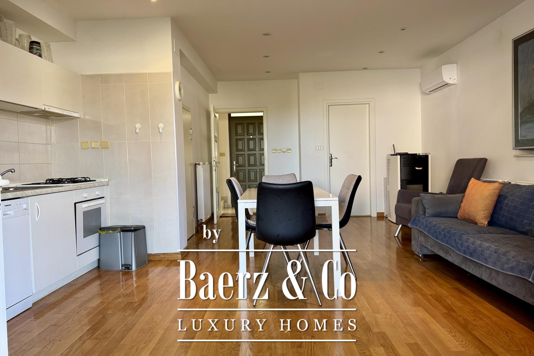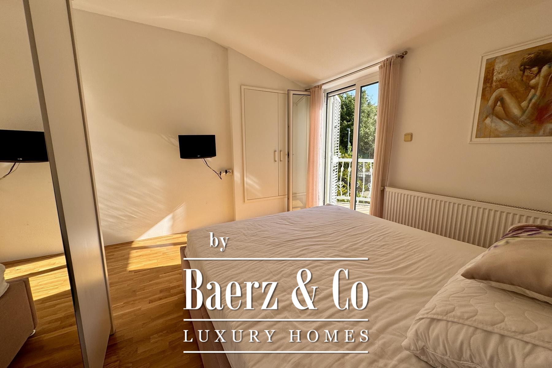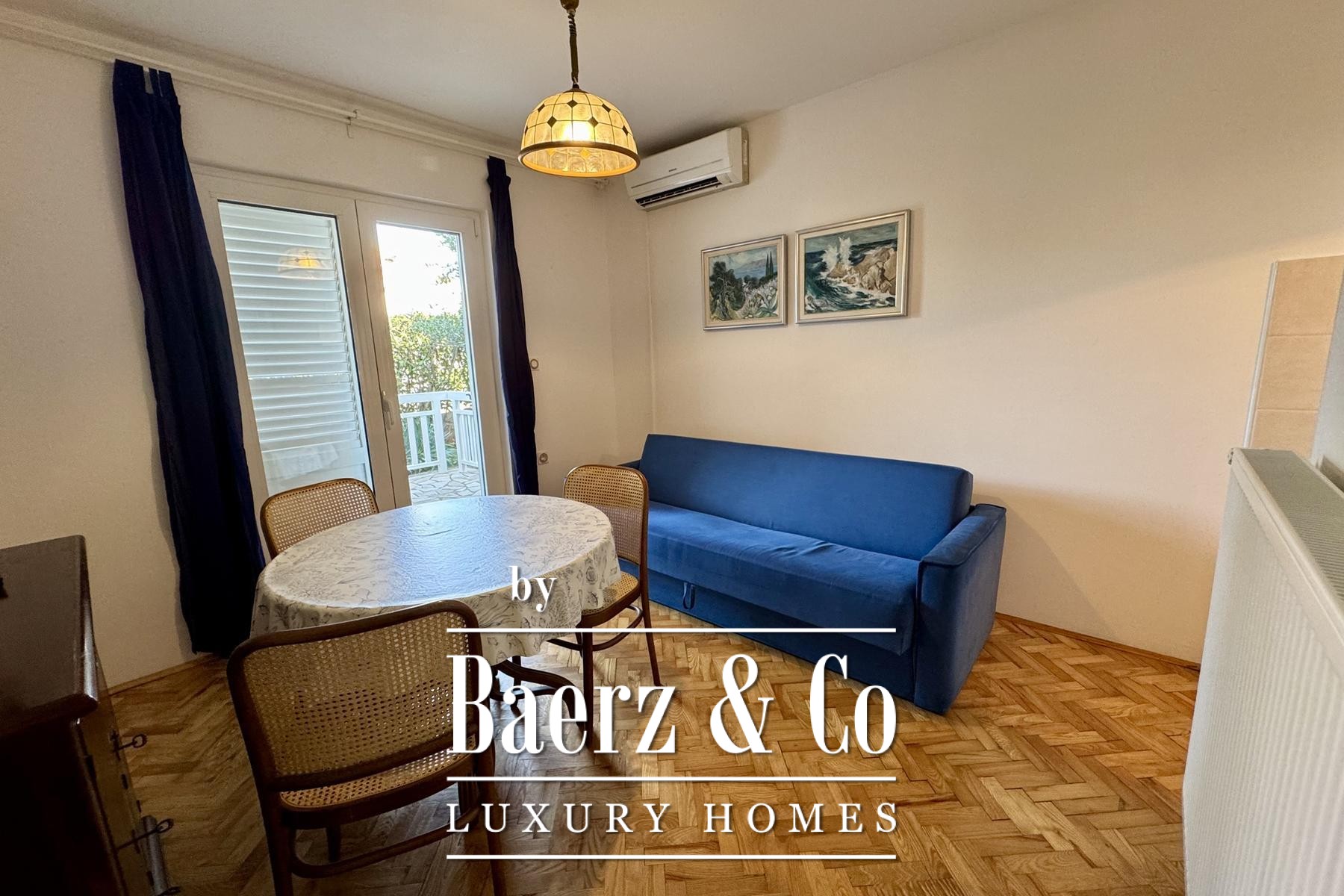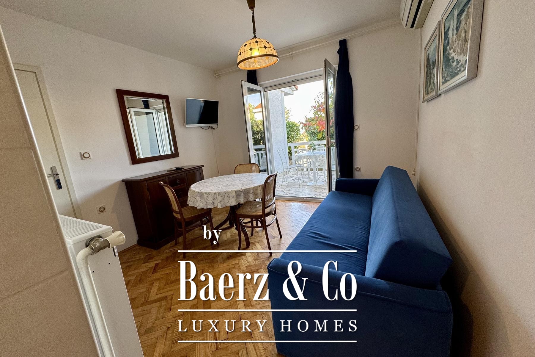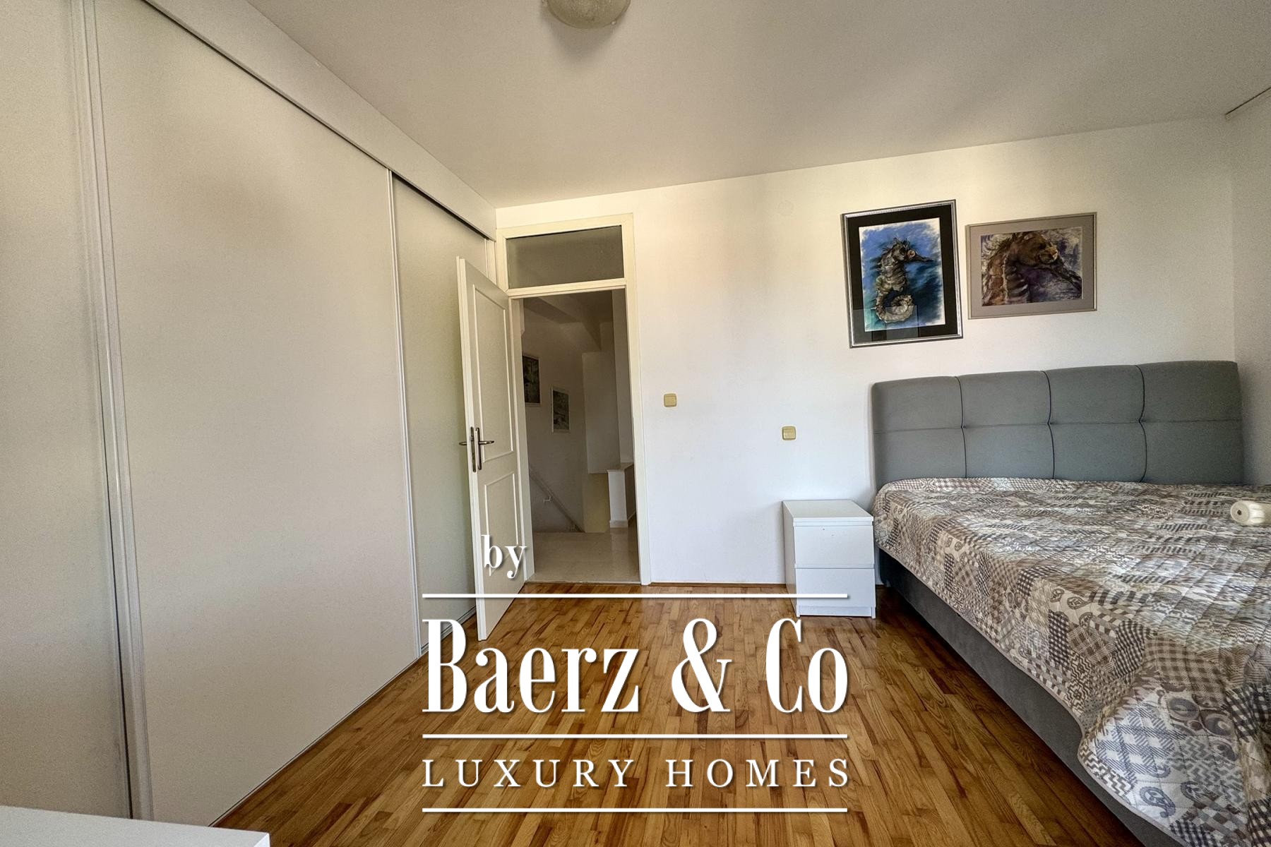The main two-story apartment features two bedrooms, two bathrooms, a storage room, and a generous open-plan living area. Natural light fills the interior, connecting seamlessly to a covered terrace and two balconies, each framing glimpses of the Adriatic and the ever-changing Mediterranean light.